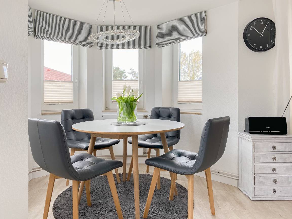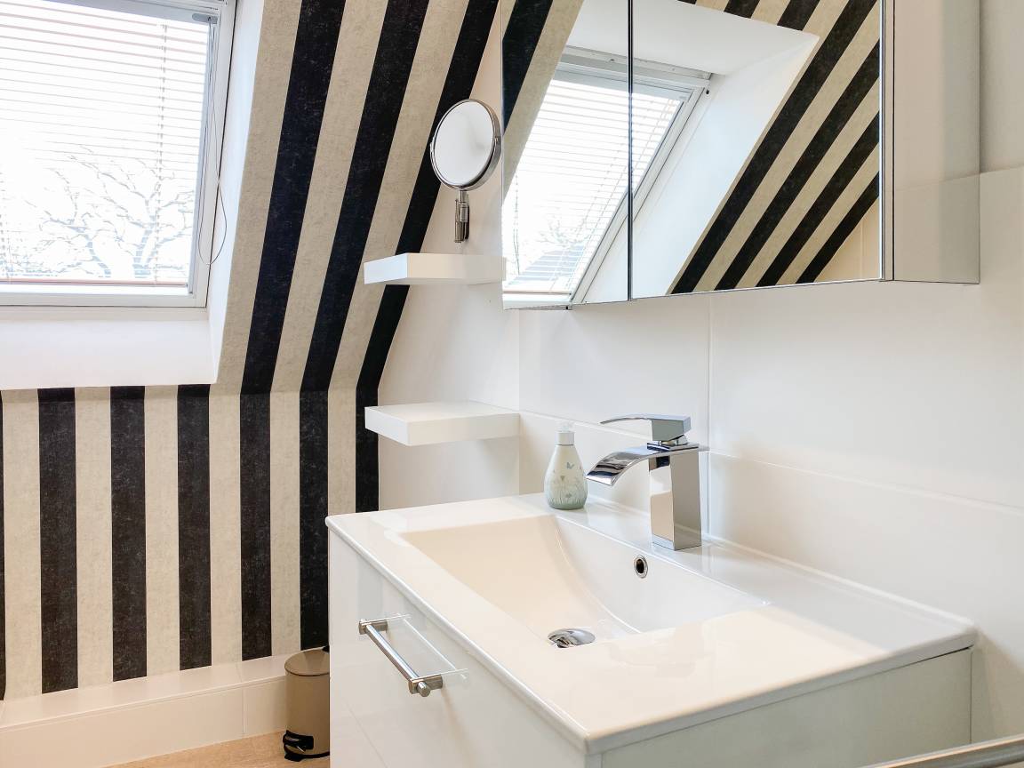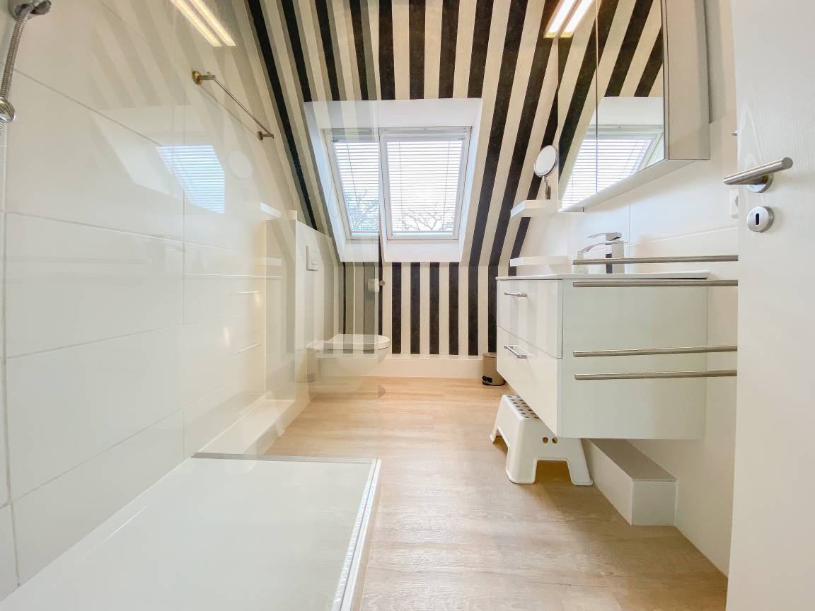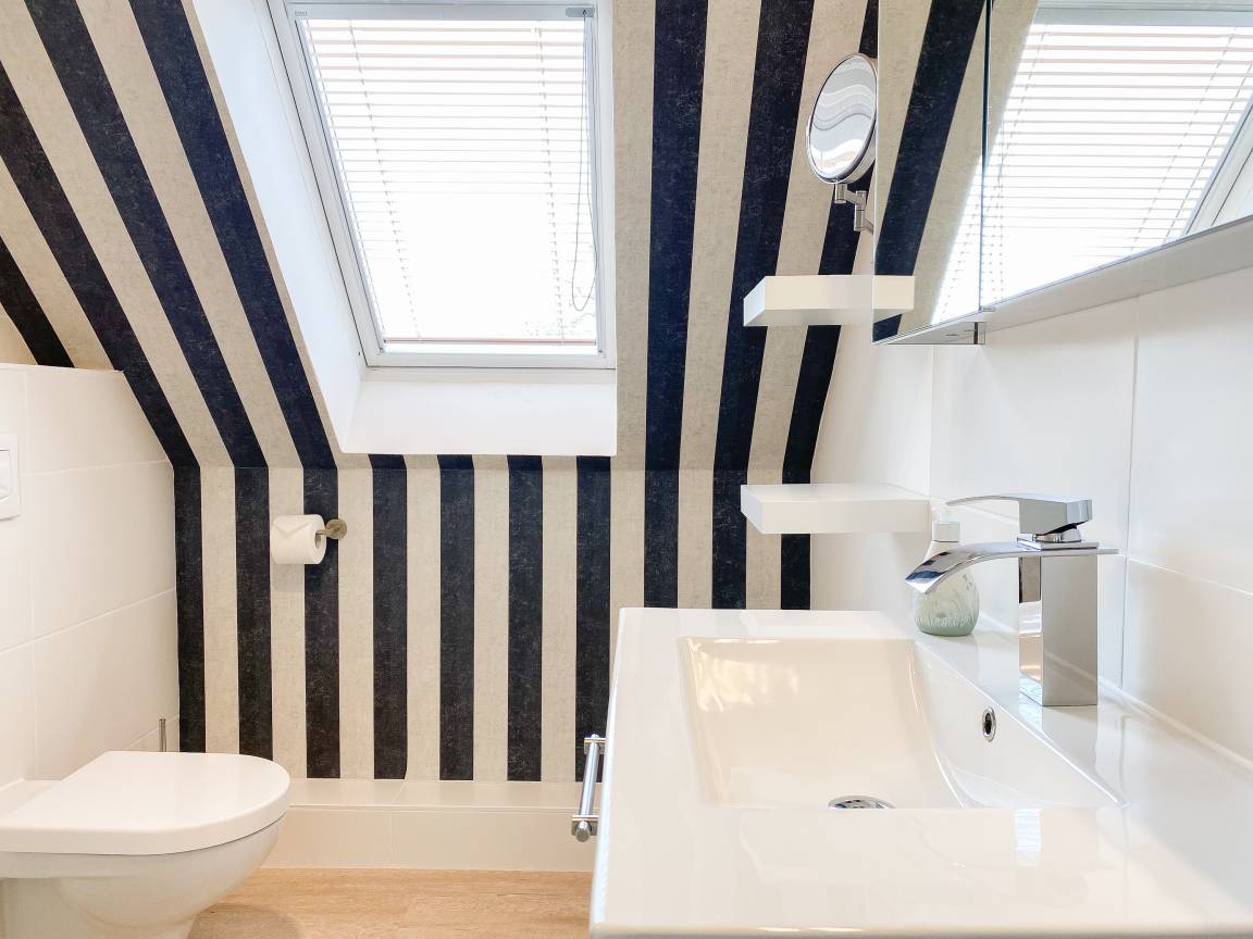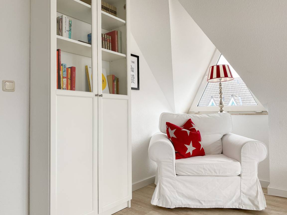 Die Ferienwohnung präsentiert sich als wunderschönes, lichtdurchflutetes Loft über 2 Ebenen in Südausrichtung. Die Wohnung verfügt über zwei Balkone und befindet sich in der obersten Etage (2. OG) des Feriendomizils Strandburg. Die hochwertige, äußerst geschmackvolle Einrichtung vermittelt ein herrliches Wohngefühl. Auf der unteren Ebene befindet sich der gemütliche Wohnbereich mit Sonnenbalkon, TV, Musikanlage und WLAN, der anschließende Essbereich und die offene, bestens ausgestattete Wohnküche sowie ein Gäste WC und ein Abstellraum mit kombiniertem Waschtrockner. Auf der oberen Ebene gibt es zwei großzügige Schlafzimmer mit Boxspringbetten, eines mit Balkon und zusätzlichem TV, ein hochwertiges Duschbad und eine gemütliche Leseecke. Die Schlafräume lassen sich mittels Plissees und Vorhängen verdunkeln.