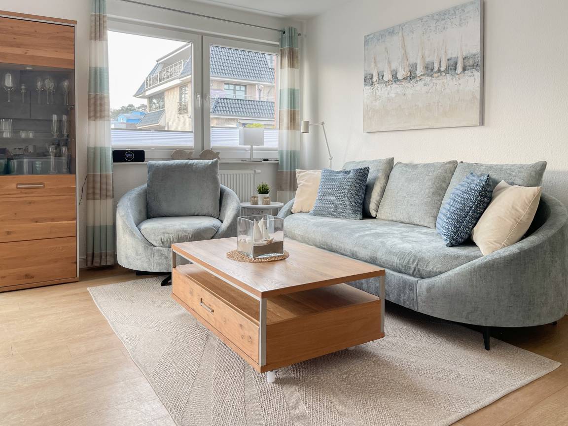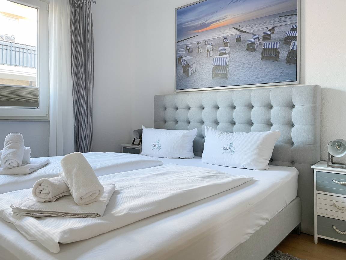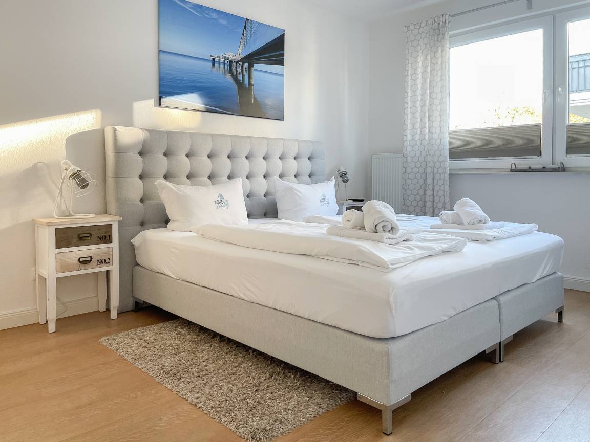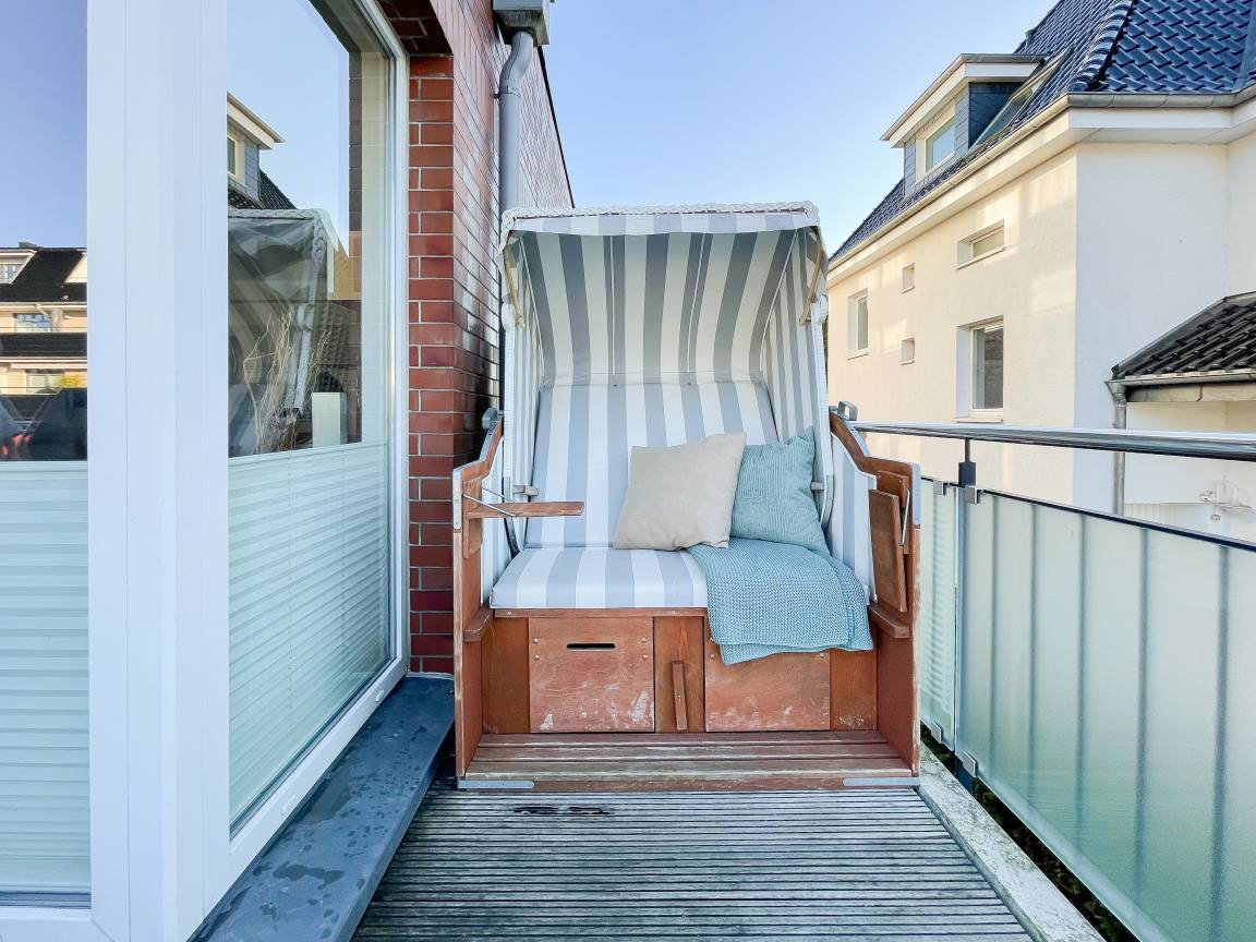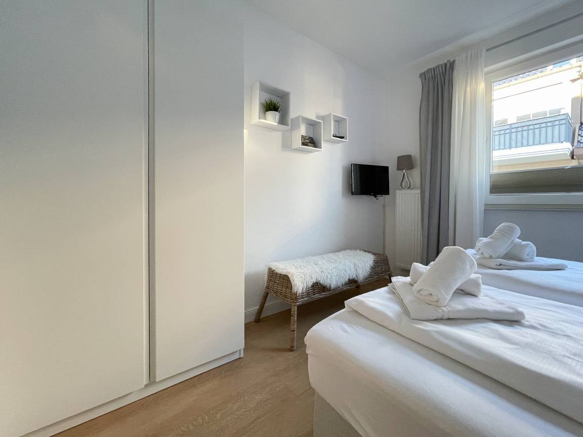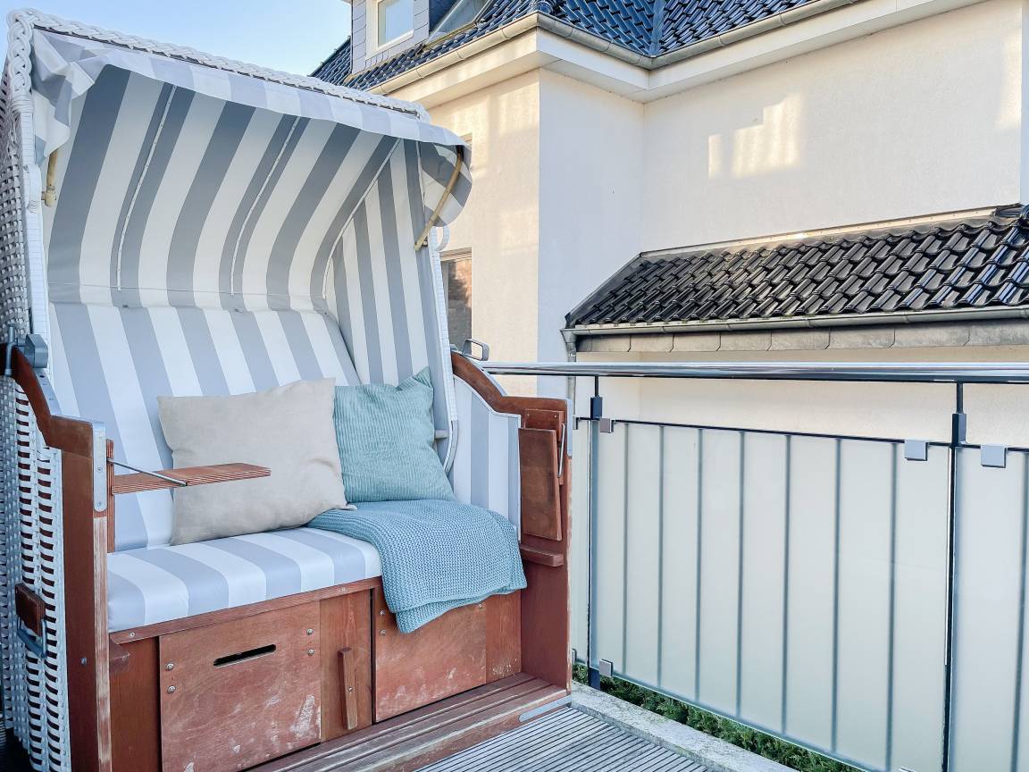 Die sonnige Ferienwohnung mit Wohlfühlatmosphäre ist ca. 68 qm groß und befindet sich im ersten Obergeschoss und bietet mit 2 separaten Schlafzimmern[nbsp] ausreichend Platz für 4 Personen. Es erwartet Sie eine bestens ausgestattete Küche (Geschirrspüler, Mikrowelle, Backofen) mit angrenzendem Essbereich sowie ein geschmackvoll eingerichtetes Wohnzimmer mit hochwertiger Couchgarnitur mit[nbsp] TV, Stereoanlage, DVD-Player und kostenlosem Internetzugang über WLAN. Genießen Sie die Sonne von früh bis spät auf dem vorgelagerten, mit Gartenmöbeln und Strandkorb möbliertem Südwestbalkon. Die beiden separaten Schlafzimmer sind jeweils mit einem Doppelbett (Boxspring 180x200 und 160x200) und TV ausgestattet. Die Fenster sind mit Verdunkelungsplissees versehen. Das moderne Tageslichtbad verfügt über Dusche, Waschtisch und Handtuchwärmer.