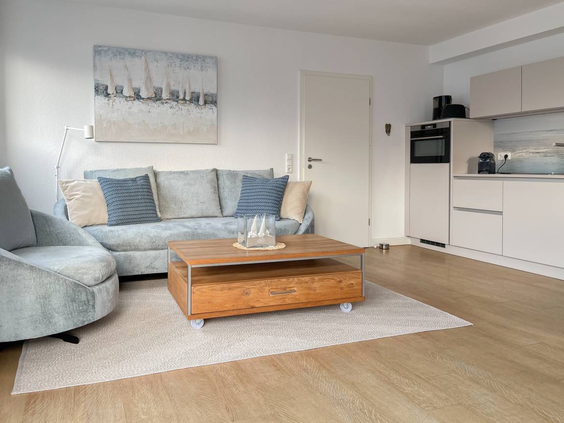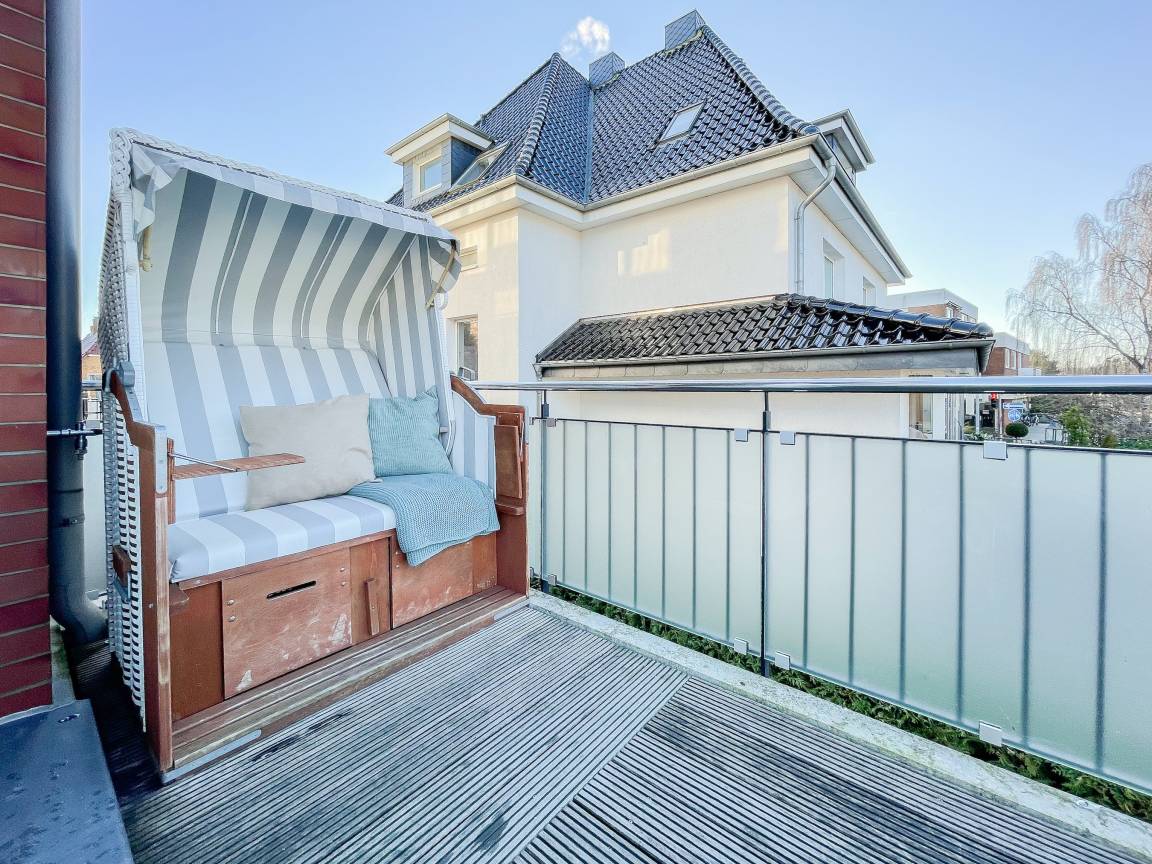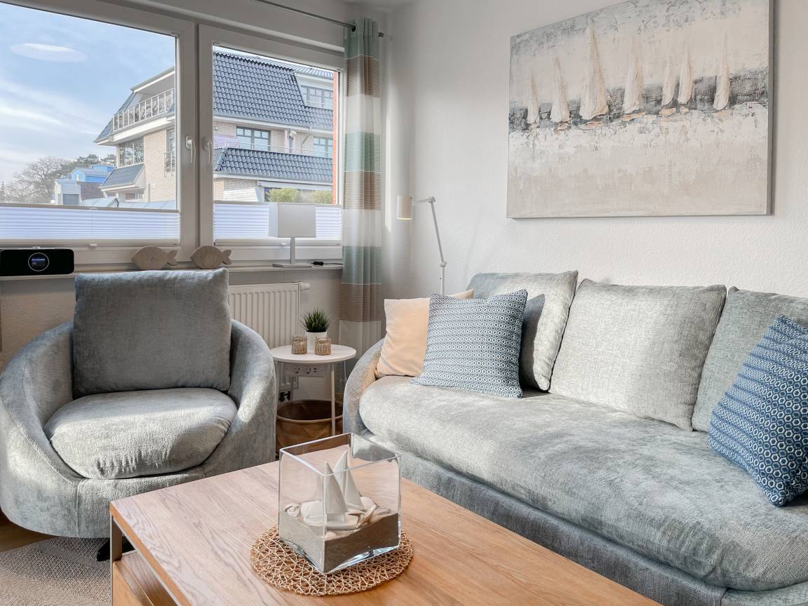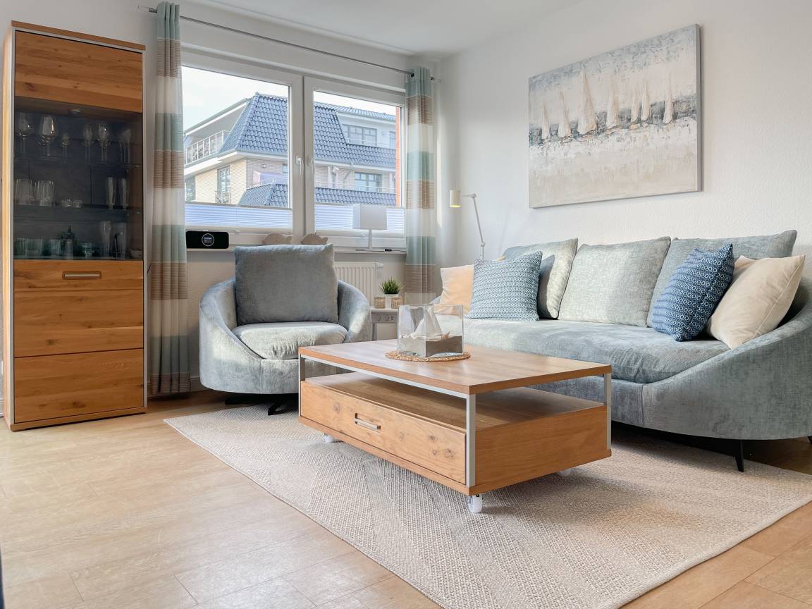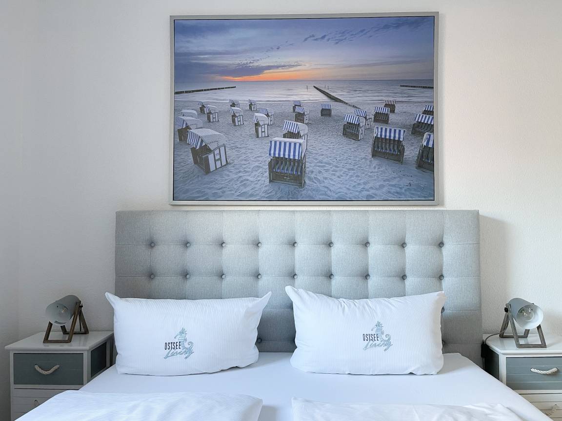 Die sonnige Ferienwohnung mit Wohlfühlatmosphäre ist ca. 68 qm groß und befindet sich im ersten Obergeschoss und bietet mit 2 separaten Schlafzimmern[nbsp] ausreichend Platz für 4 Personen. Es erwartet Sie eine bestens ausgestattete Küche (Geschirrspüler, Mikrowelle, Backofen) mit angrenzendem Essbereich sowie ein geschmackvoll eingerichtetes Wohnzimmer mit hochwertiger Couchgarnitur mit[nbsp] TV, Stereoanlage, DVD-Player und kostenlosem Internetzugang über WLAN. Genießen Sie die Sonne von früh bis spät auf dem vorgelagerten, mit Gartenmöbeln und Strandkorb möbliertem Südwestbalkon. Die beiden separaten Schlafzimmer sind jeweils mit einem Doppelbett (Boxspring 180x200 und 160x200) und TV ausgestattet. Die Fenster sind mit Verdunkelungsplissees versehen. Das moderne Tageslichtbad verfügt über Dusche, Waschtisch und Handtuchwärmer.