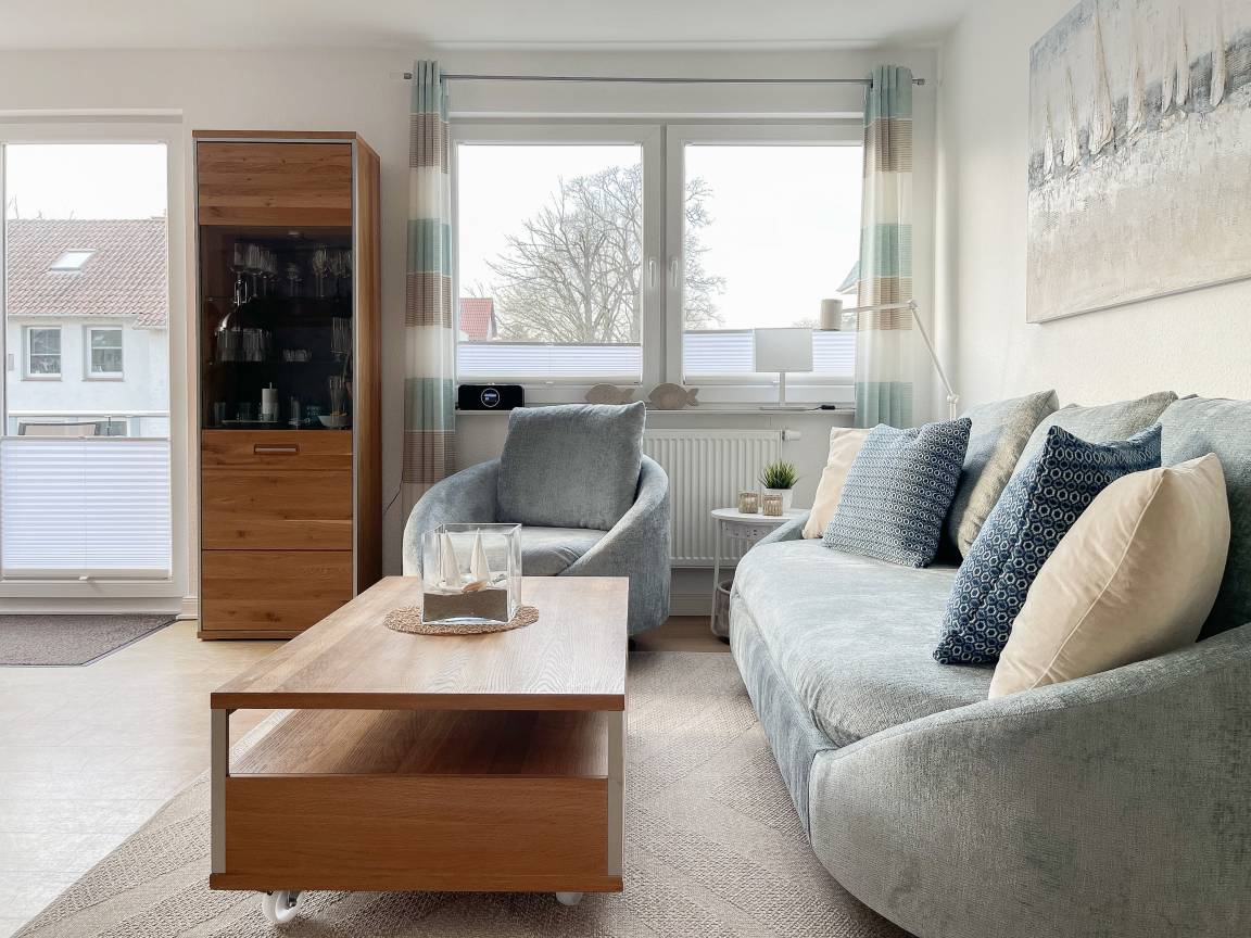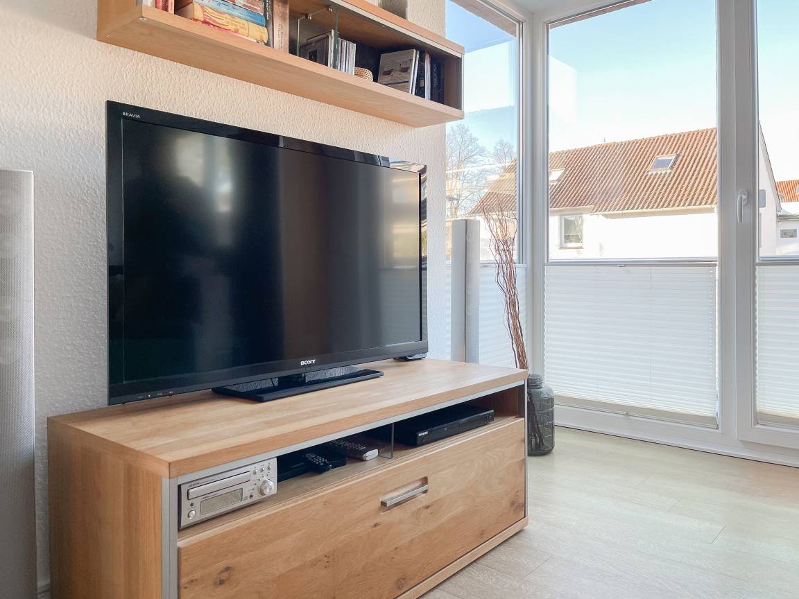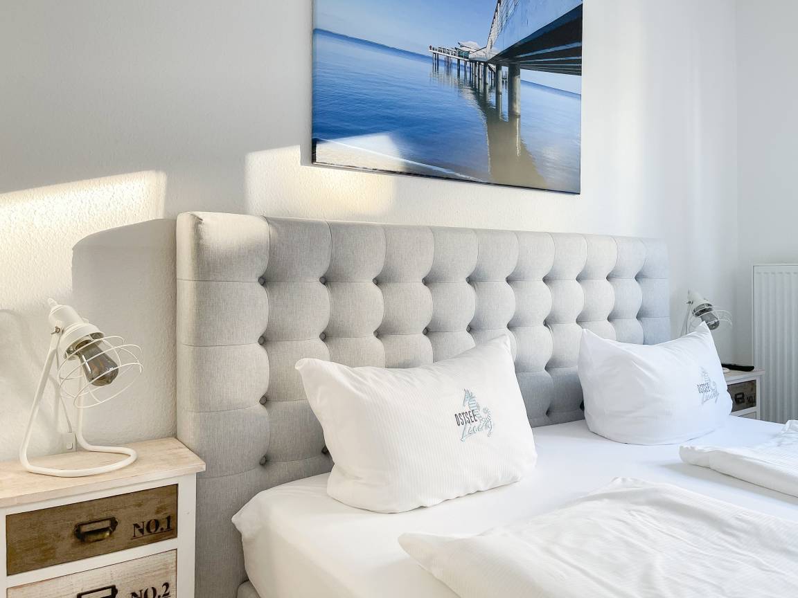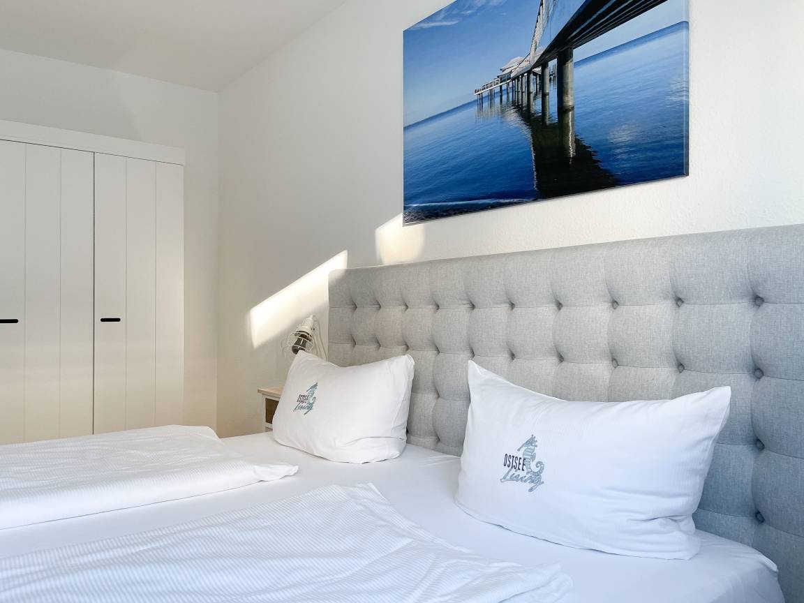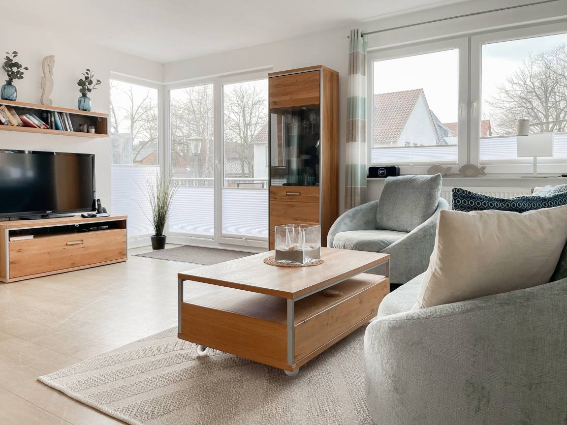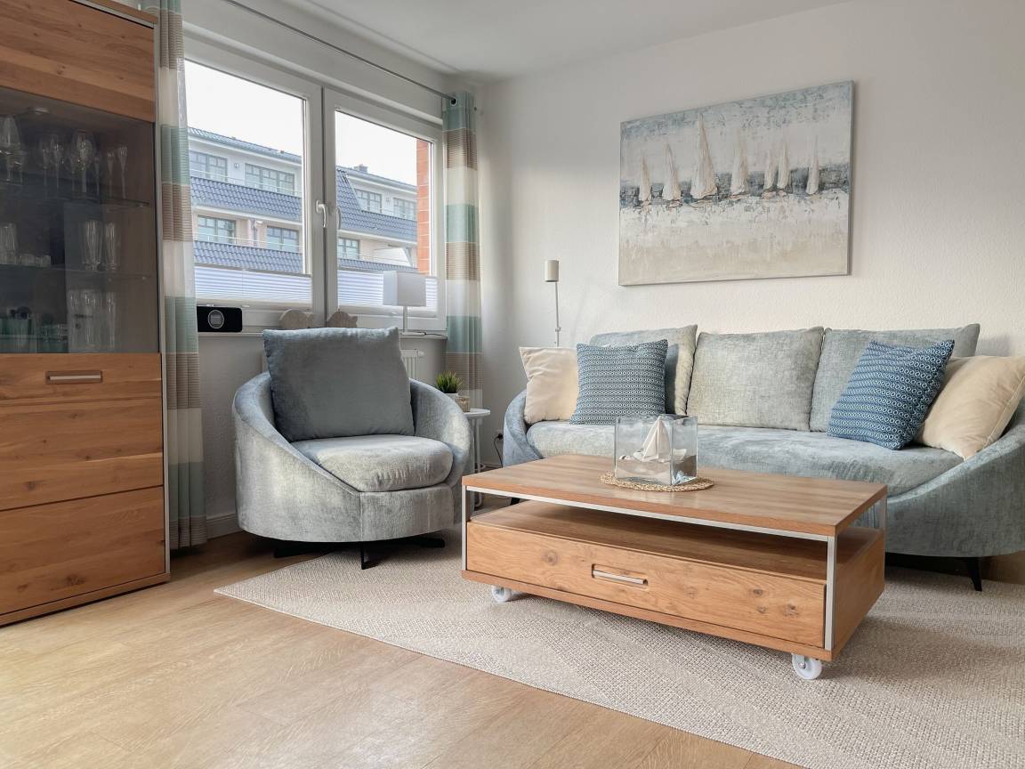 Die sonnige Ferienwohnung mit Wohlfühlatmosphäre ist ca. 68 qm groß und befindet sich im ersten Obergeschoss und bietet mit 2 separaten Schlafzimmern[nbsp] ausreichend Platz für 4 Personen. Es erwartet Sie eine bestens ausgestattete Küche (Geschirrspüler, Mikrowelle, Backofen) mit angrenzendem Essbereich sowie ein geschmackvoll eingerichtetes Wohnzimmer mit hochwertiger Couchgarnitur mit[nbsp] TV, Stereoanlage, DVD-Player und kostenlosem Internetzugang über WLAN. Genießen Sie die Sonne von früh bis spät auf dem vorgelagerten, mit Gartenmöbeln und Strandkorb möbliertem Südwestbalkon. Die beiden separaten Schlafzimmer sind jeweils mit einem Doppelbett (Boxspring 180x200 und 160x200) und TV ausgestattet. Die Fenster sind mit Verdunkelungsplissees versehen. Das moderne Tageslichtbad verfügt über Dusche, Waschtisch und Handtuchwärmer.