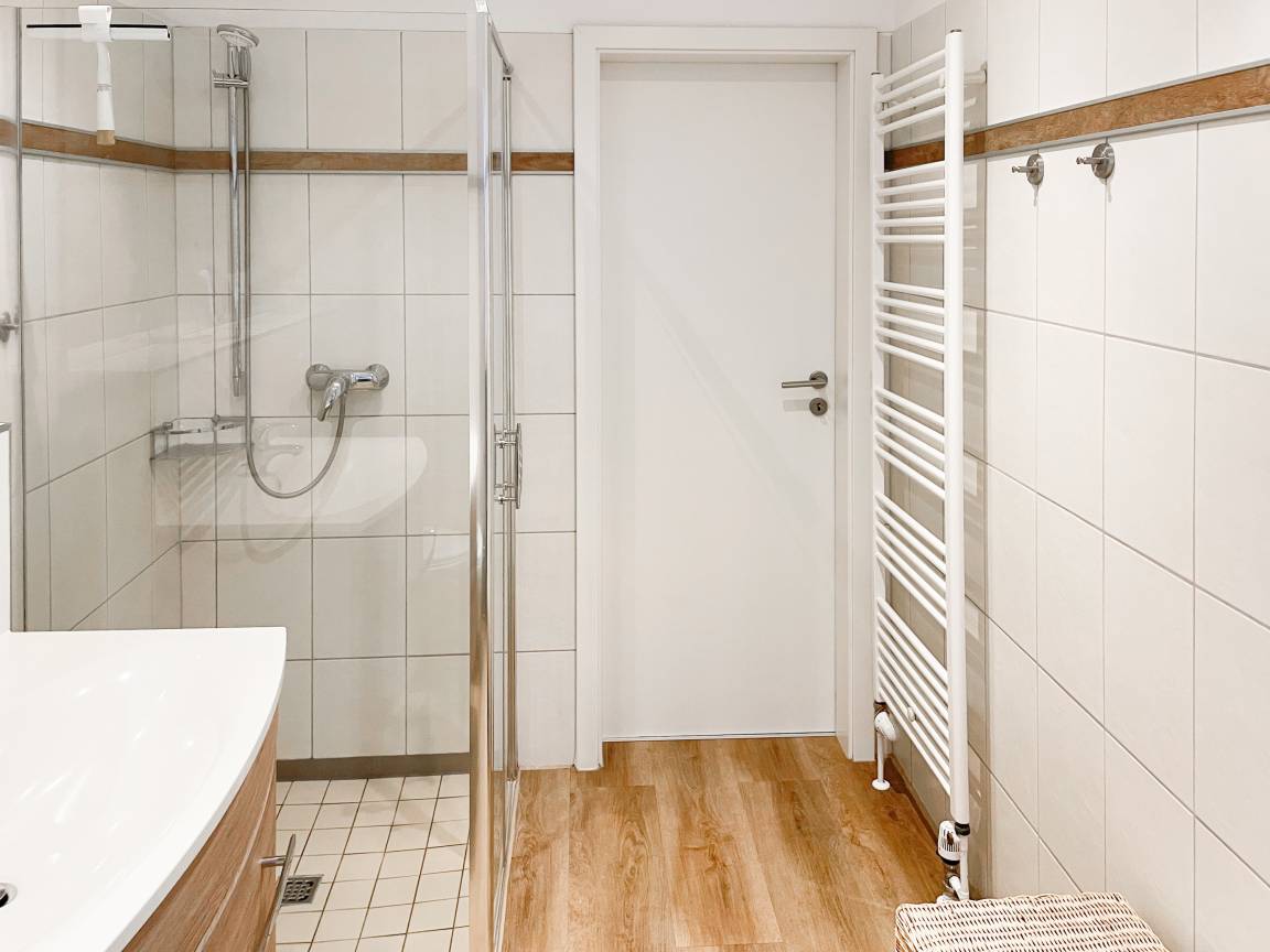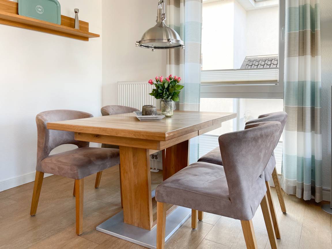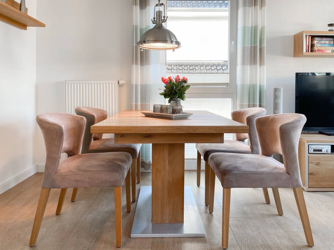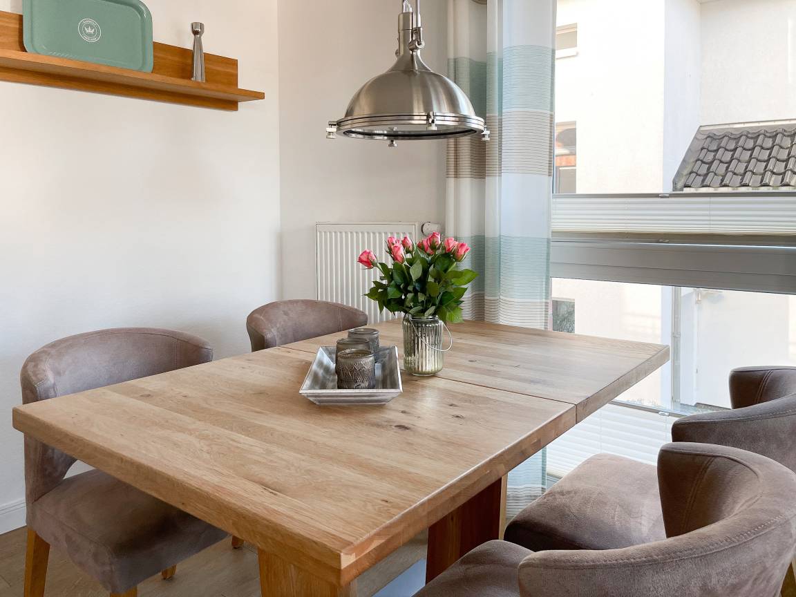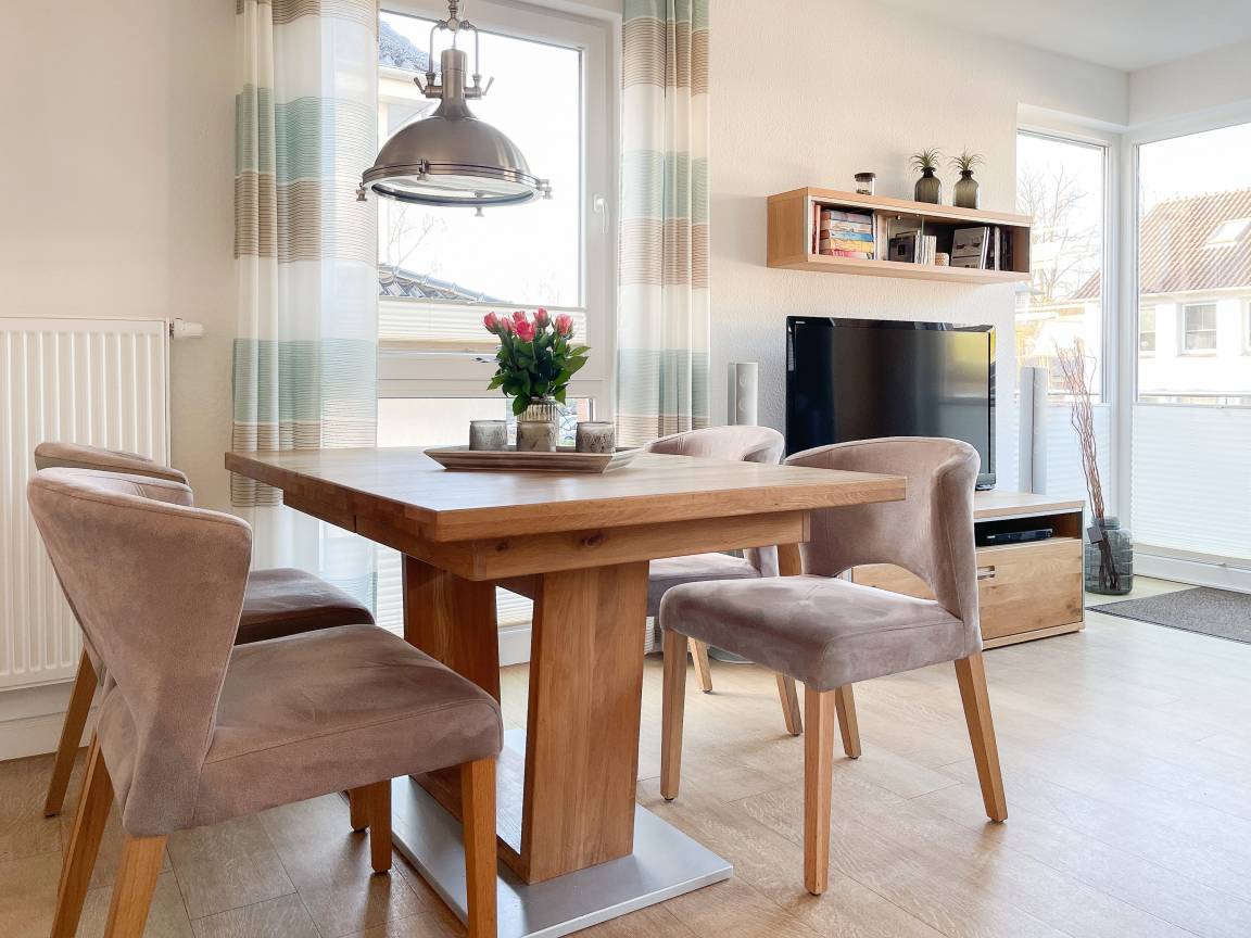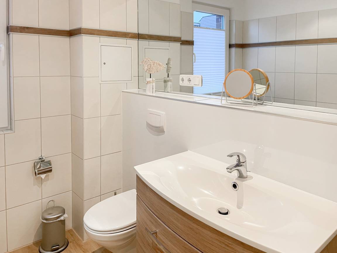 Die sonnige Ferienwohnung mit Wohlfühlatmosphäre ist ca. 68 qm groß und befindet sich im ersten Obergeschoss und bietet mit 2 separaten Schlafzimmern[nbsp] ausreichend Platz für 4 Personen. Es erwartet Sie eine bestens ausgestattete Küche (Geschirrspüler, Mikrowelle, Backofen) mit angrenzendem Essbereich sowie ein geschmackvoll eingerichtetes Wohnzimmer mit hochwertiger Couchgarnitur mit[nbsp] TV, Stereoanlage, DVD-Player und kostenlosem Internetzugang über WLAN. Genießen Sie die Sonne von früh bis spät auf dem vorgelagerten, mit Gartenmöbeln und Strandkorb möbliertem Südwestbalkon. Die beiden separaten Schlafzimmer sind jeweils mit einem Doppelbett (Boxspring 180x200 und 160x200) und TV ausgestattet. Die Fenster sind mit Verdunkelungsplissees versehen. Das moderne Tageslichtbad verfügt über Dusche, Waschtisch und Handtuchwärmer.