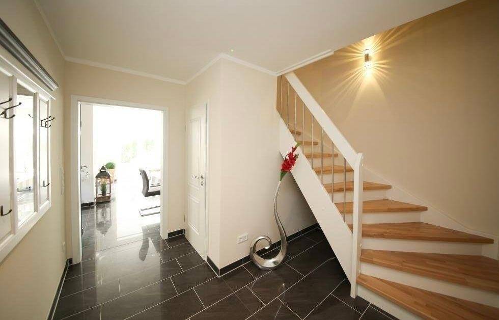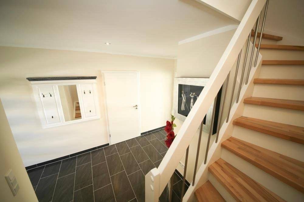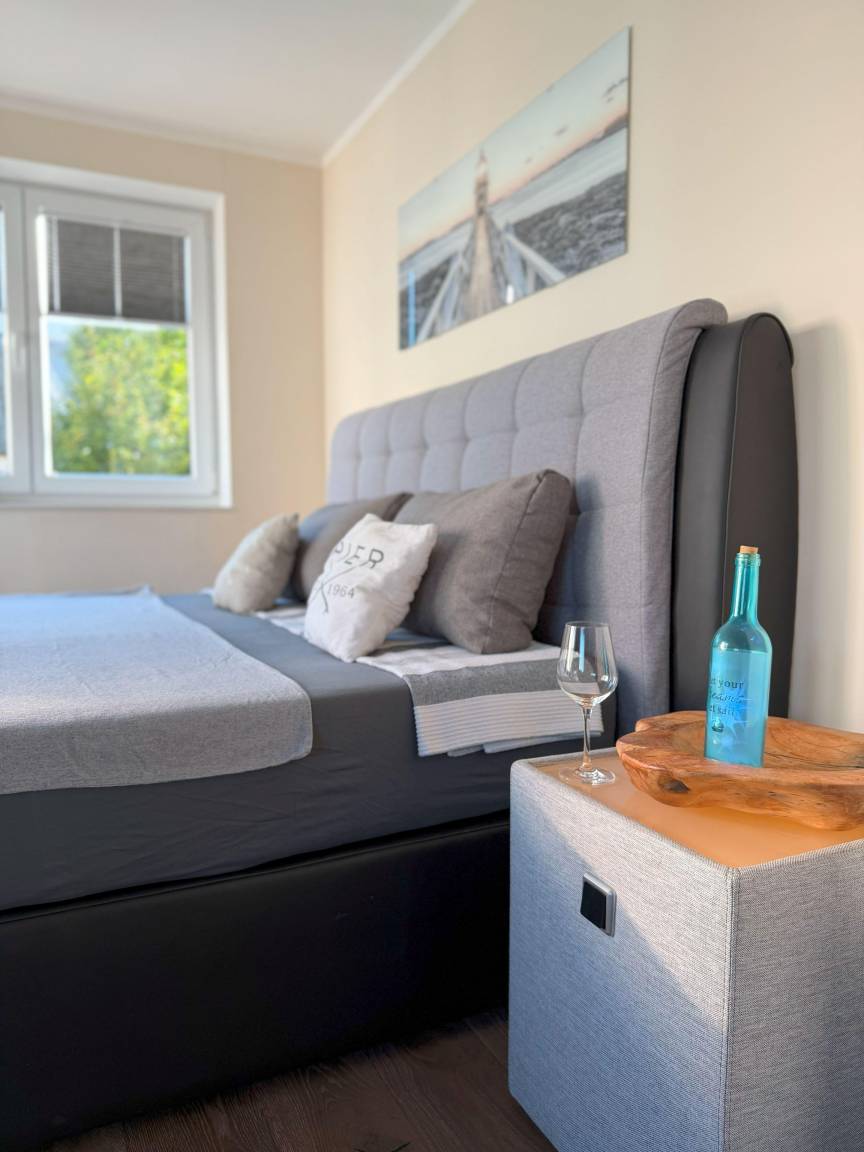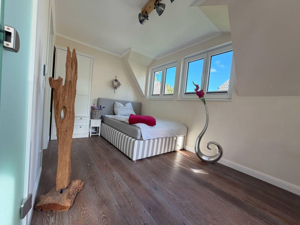 Das stilvolle Haus ist Ende 2018 fertiggestellt und modern, maritim eingerichtet. Große bodentiefe Fenster im Wohn- und Schlafbereich und moderne Bodenbeläge sorgen für eine helle und gemütliche Atmosphäre. Im Wohnzimmer befinden sich eine bequeme Couch und ein hochwertiger Essbereich im maritimen Stil für sechs Personen. An das Wohnzimmer grenzt ein kleiner Wintergarten, der vom sonnigen Garten umgeben ist. Im Erdgeschoss können Sie neben dem Gäste-WC die hauseigene, moderne Sauna im geräumigen Saunaraum erleben. Die offene Marken-Küche ist unter anderem mit Kochplatte, Kühl-/Gefrierschrank, Backofen, Mikrowelle, Kaffeevollautomat und Geschirrspülmaschine ausgestattet. Im Obergeschoss befinden sich zwei Schlafzimmer jeweils mit Boxspringbetten. Das eine Schlafzimmer ist geräumig geschnitten und komfortabel mit Doppelbett und hochwertigen Elektrokamin ausgestattet. Vom Schlafzimmer aus gelangen Sie zum Südbalkon. Das weitere Schlafzimmer im Obergeschoss ist ebenfalls mit Doppelbett versehen. Beide Schlafzimmer sind mit Verdunkelungs-Plissee's für ein angenehmen Schlaf ausgestattet. Das modern geflieste Badezimmer ist als Vollbad mit Dusche, WC und großer Badewanne für 2 Personen ausgestattet. Das Dachgeschoss hat seinen Charm durch die hohe Giebel-Decke und bietet weiteren Schlafraum mit einem Doppelbett. Schlafraum sowie das Wohnzimmer sind mit großen, modernen Flachbild-Fernsehern mit Telekom MagentaTV ausgestattet. Schnelles Glasfasernetz mit WLan und Fußbodenheizung sind im ganzen Haus vorhanden.