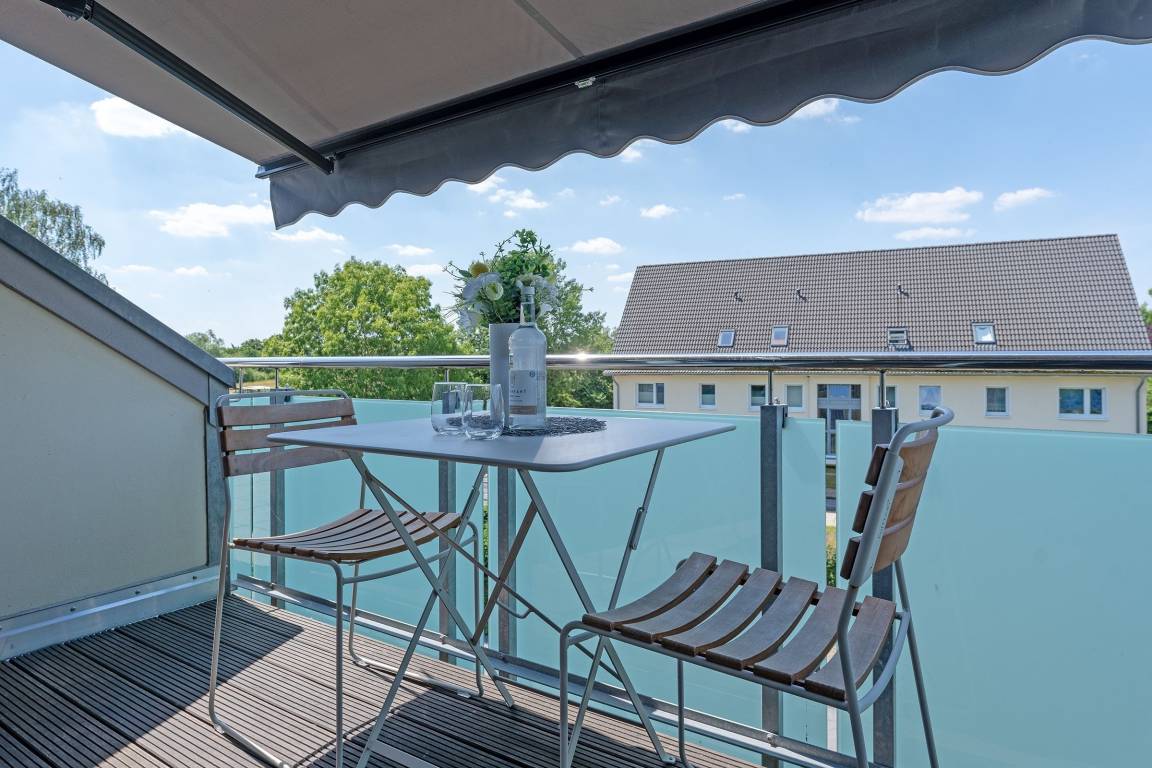 Ihr Feriendomizil begrüßt Sie direkt mit einer offen gestalteten Küchenzeile, in der es sich hervorragend kochen lässt. Die Küchenzeile ist zum Essbereich hin offen, sodass Sie sich währenddessen entspannt weiter mit Ihrer Reisebegleitung unterhalten können. Nach einem gemeinsamen Abendbrot können Sie gemeinsam die letzten Sonnenstrahlen des Urlaubstages auf dem Balkon mit Markise genießen. Eine Treppe führt hinauf in das Schlaf- sowie Badezimmer. Lassen Sie sich abends in das komfortable Boxspringbett (1x 160x200 cm) fallen oder ruhen Sie sich auf der sich im Schlafzimmer befindlichen Couch für den nächsten Tag am Stand aus. Zur Unterhaltung dient ein TV und auch ein WLAN-Anschluss steht Ihnen zur Verfügung. Das lichtdurchflutete Bad erfreut mit einer bodengleichen Dusche. Falls es etwas mehr Wellness sein darf, können Sie die im Nebenhaus befindliche Sauna und den ca. 100 qm großen Indoor-Pool nutzen.