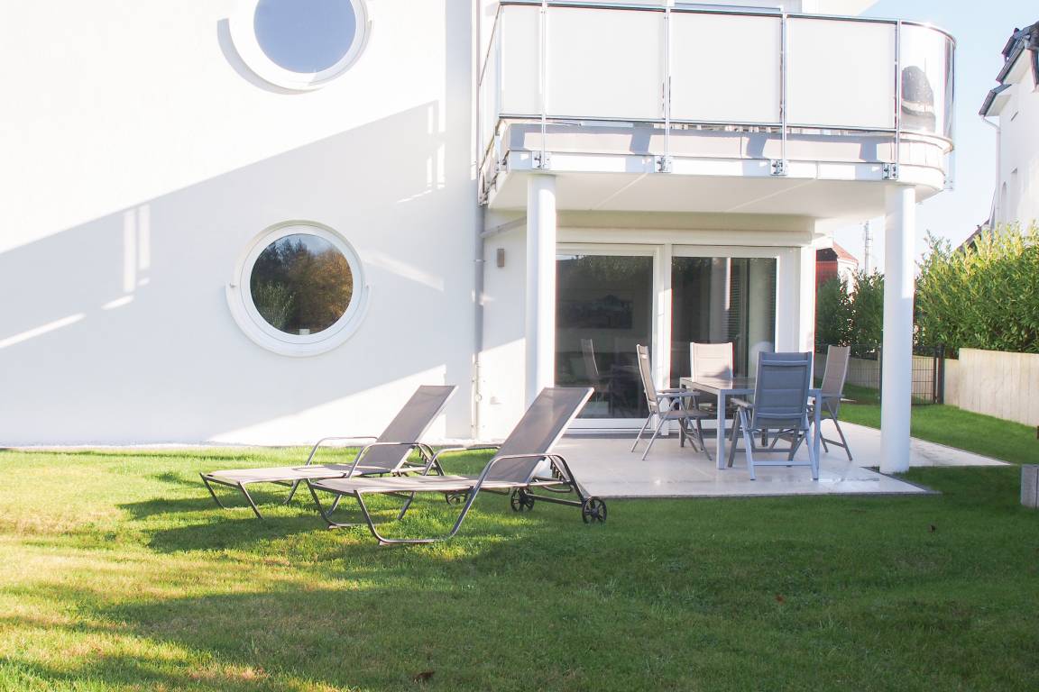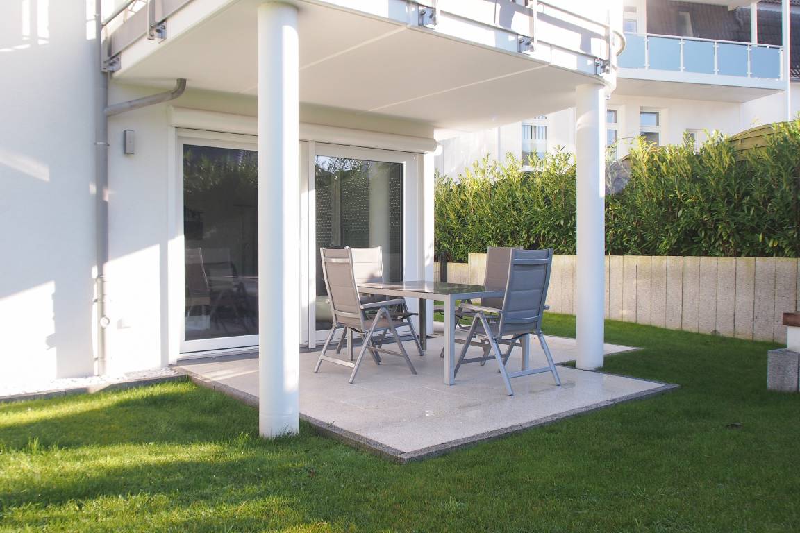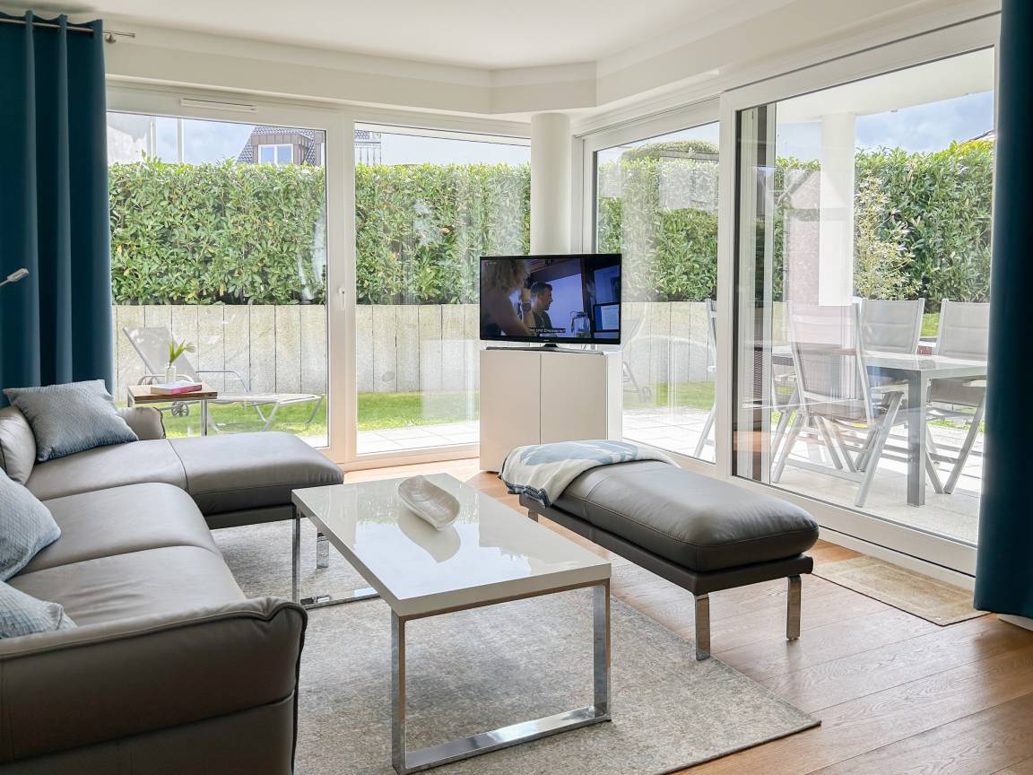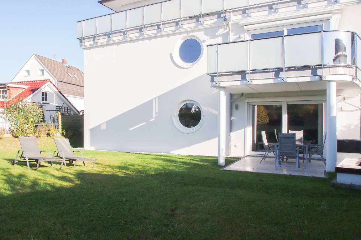 Übergroße Fensterelemente sorgen für einen lichtdurchfluteten Wohnbereich mit einem schönem Blick in den 200 qm großen Garten zur privaten Nutzung und auf die großzügige, teilweise überdachte Südwestterrasse, selbstverständlich komfortabel möbliert mit Sitzgruppe und Sonnenliegen. Hochwertige Echtholzdielen sorgen für eine wohlige, angenehme Wohnatmosphäre. Mit zwei separaten Schlafzimmern mit Doppelbetten (180x200 und 160x200) und TV, einem hochwertigen Duschbad und einem Gäste WC ensuite, finden hier 4 Personen ausreichend Platz sich zu entfalten. Die exklusive Einbauküche mit angrenzendem Essbereich ist bestens mit allen technischen Geräten ausgestattet und genügt höchsten Ansprüchen.Von Mitte Mai bis Mitte September steht für Sie ein Strandkorb am Strand zur kostenlosen Nutzung bereit.