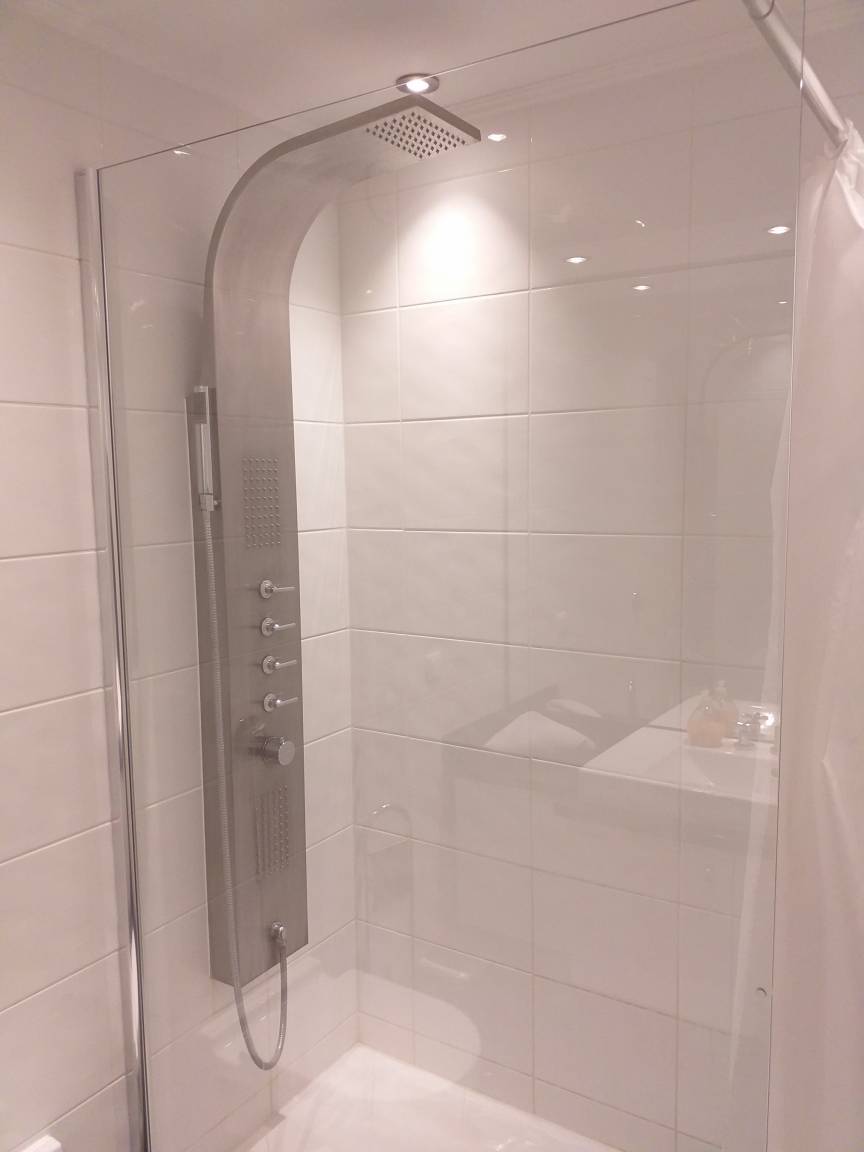 Das hochwertige Vollbad ist mit einer großen ebenerdigen Dusche, WC und einer geräumigen Ablagefläche eingerichtet. Ein Haartrockner ist selbstverständlich vorhanden.