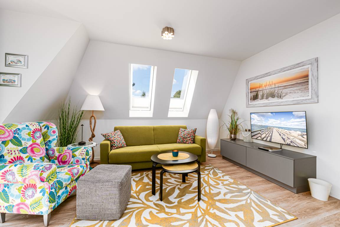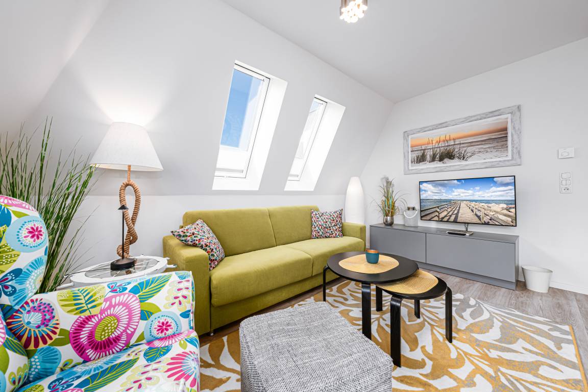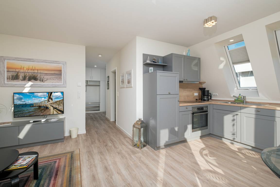 Der geräumige Wohnraum ist modern mit einer bequemen Schlafcouch (160 cm x 195 cm) und Kabel-TV eingerichtet. Die integrierte Einbauküche mit Geschirrspüler und Backofen befindet sich ebenfalls hier.