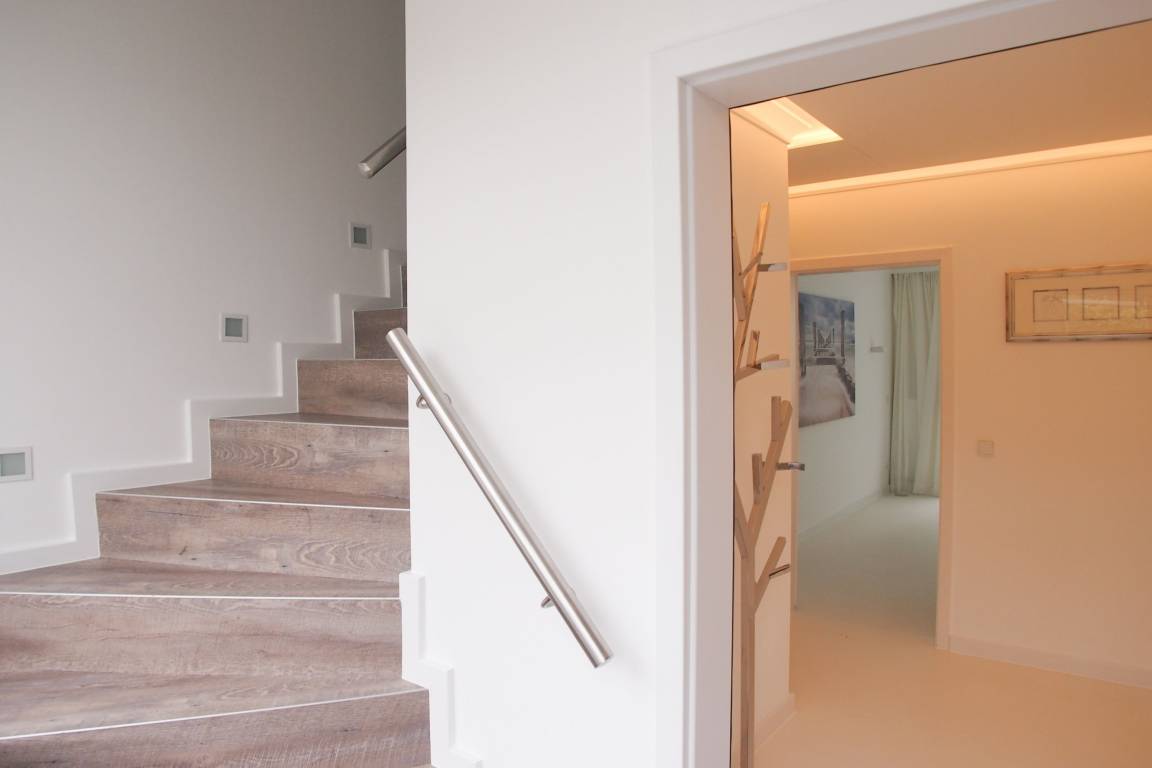 Im Erdgeschoss der stilvoll eingerichteten Wohnung befindet sich eine moderne Designküche mit allen technischen Geräten, ein großzügiger Wohnbereich mit TV und WLAN sowie ein gemütlicher Essbereich im Wintergarten. Die vorgelagerter Sonnenterrasse ist mit schönen Lounge Möbeln ausgestattet und der anschließende Garten steht unseren Gästen zur alleinigen Nutzung zur Verfügung. Ein großzügiges Schlafzimmer und ein modernes Duschbad sind ebenfalls auf dieser Ebene untergebracht. Im Untergeschoss befindet sich neben einem weiteren Schlafraum mit TV, ein modernes Duschbad, eine Sauna, ein Fitnessraum mit Sportgeräten und TV sowie Waschmaschine und Trockner in einem separaten Raum.