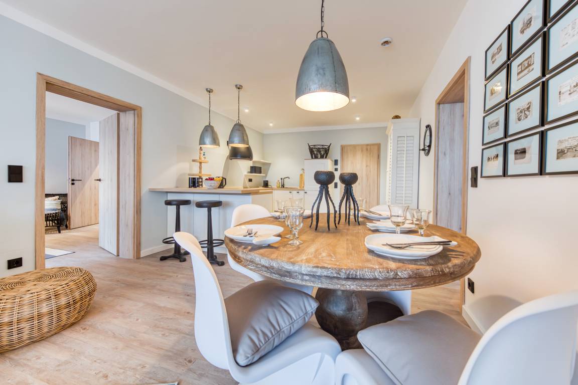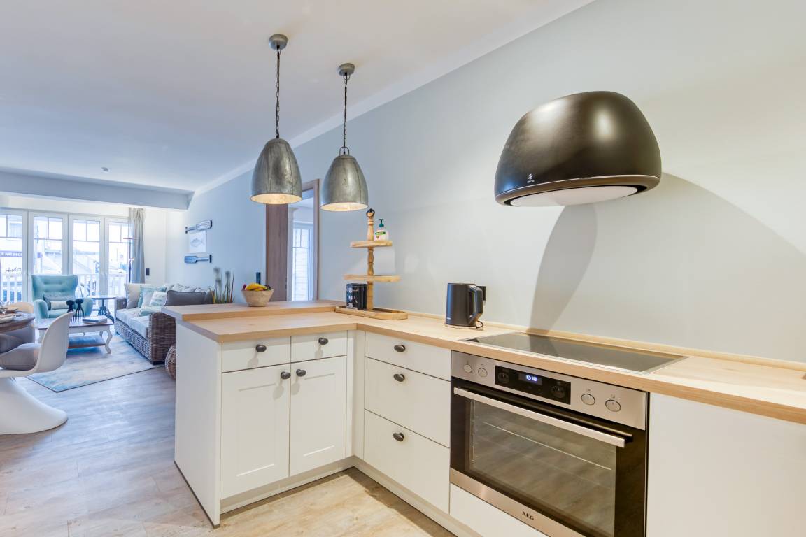 Der Wohnraum ist mit einem sehr schönen Essbereich, einem Flachbild-TV und einem gemütlichen Sofa im maritimen geschmackvollem Design ausgestattet. Die hochwertig eingerichtete integrierte Einbauküche befindet sich neben dem Essbereich und verfügt mit einem Geschirrspüler und Backofen sowie einer Nespressomaschine über eine sehr gute Ausstattung.