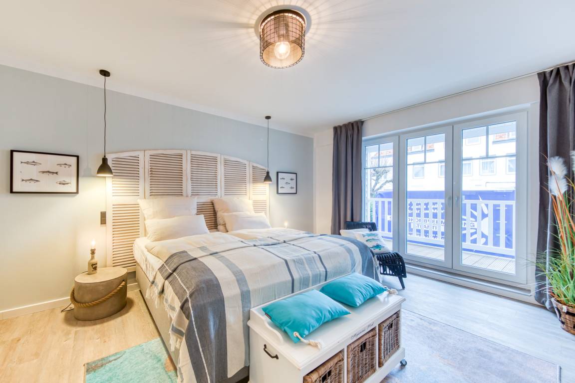 Vom Wohnzimmer aus gelangen Sie auf den nach Osten ausgerichteten Balkon, wo Sie die gesunde Meeresluft auf den Balkonmöbeln genießen können.