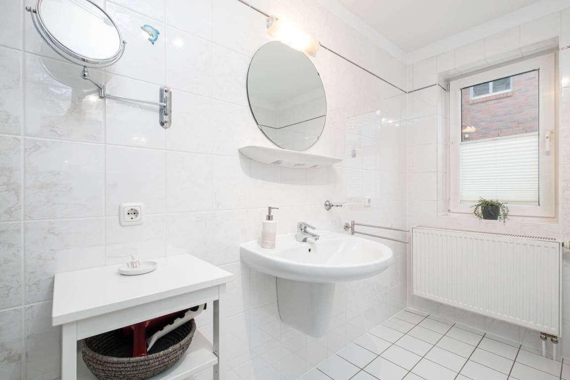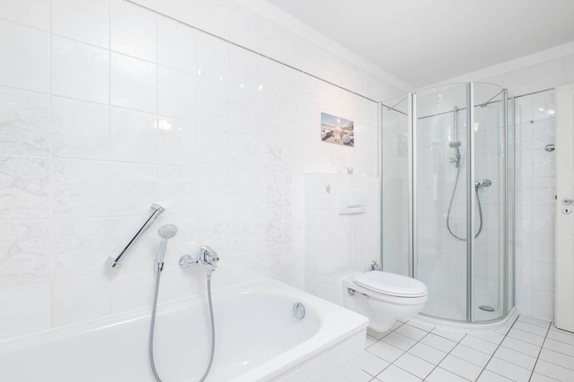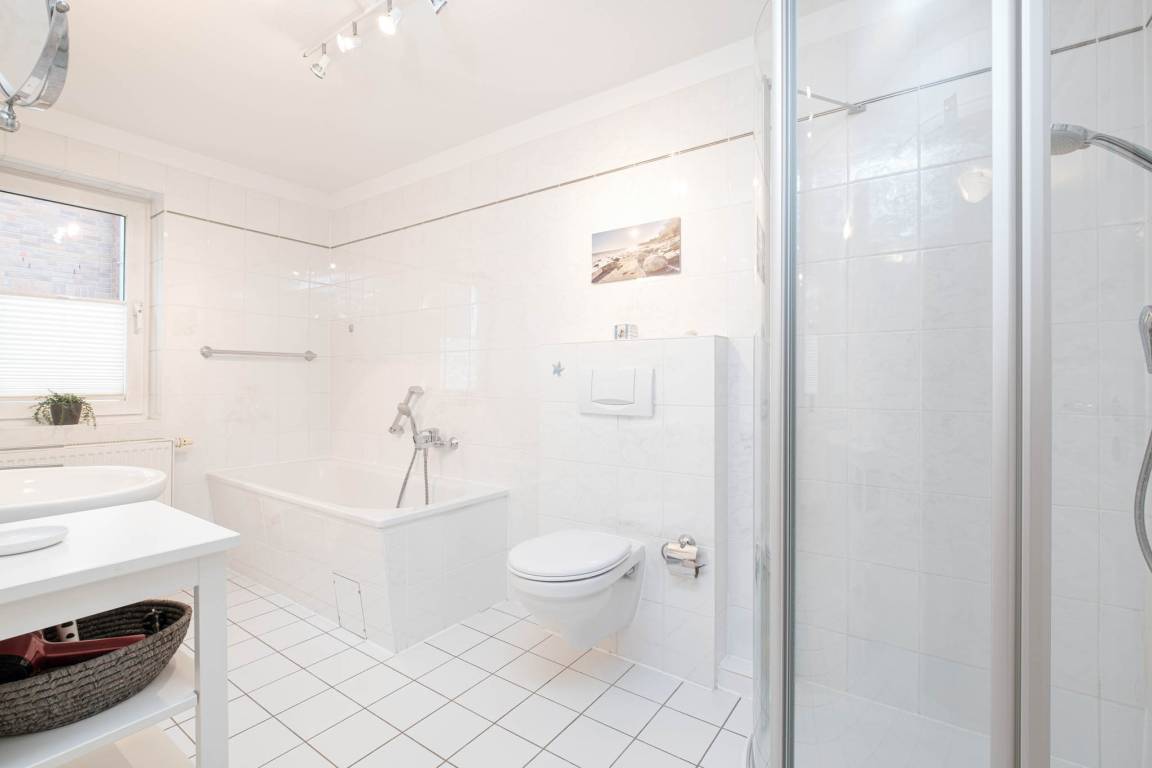 Darüber hinaus finden Sie hier ein Badezimmer mit Badewanne und separater Dusche, WC, Fön und Kosmetikspiegel, sowie ein zusätzliches Gäste-WC vor.