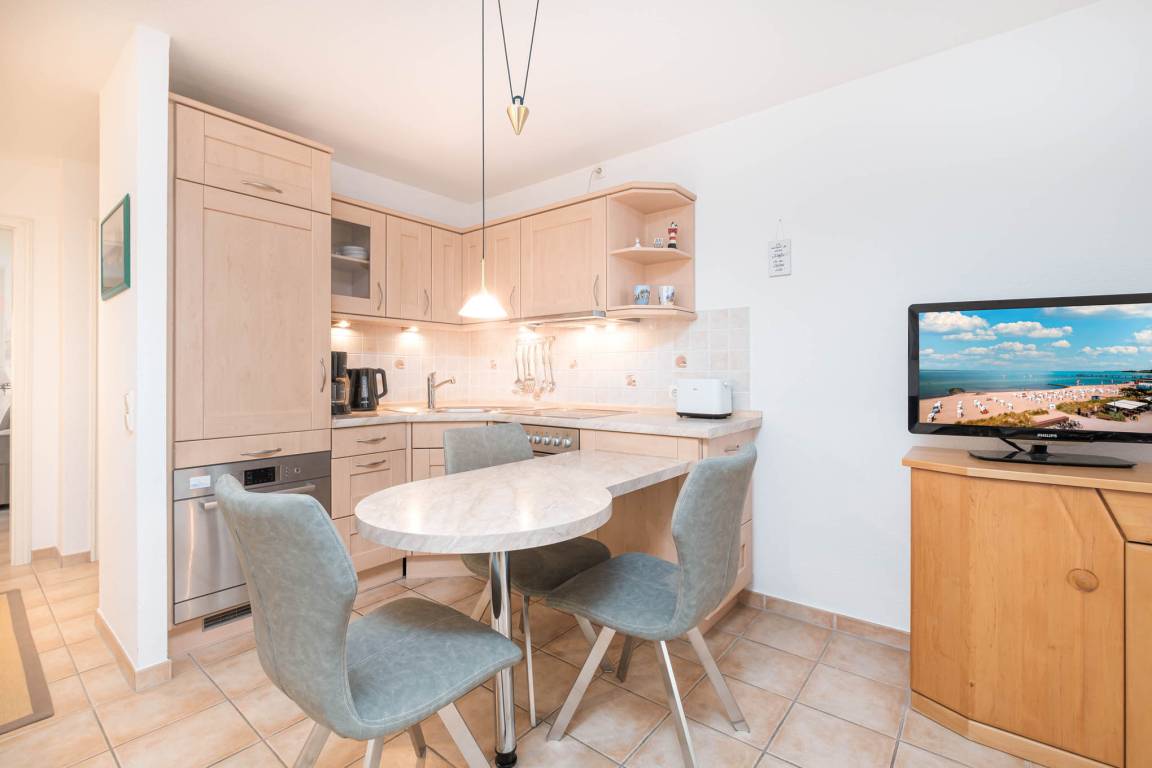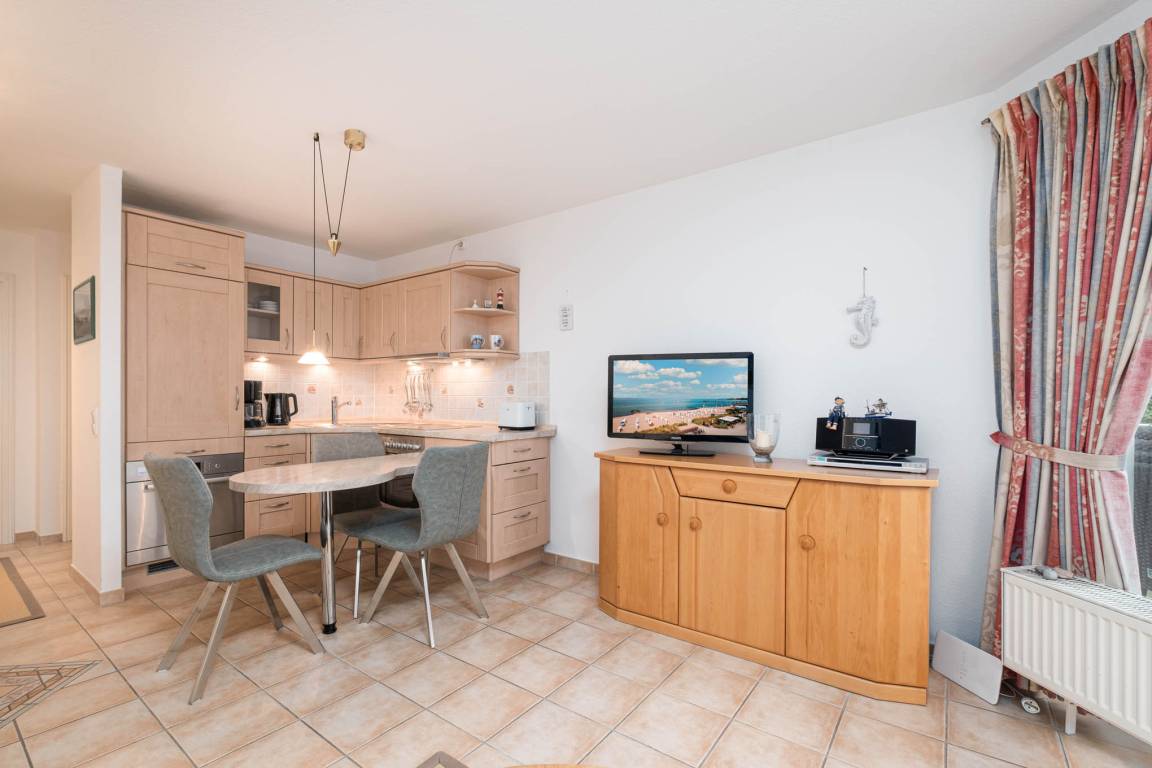 Es erwartet Sie ein großer Wohnraum mit bequemer Schlafcouch, Essecke und integrierter Einbauküche. Kabel-TV, DVD-Player, HiFi-Anlage stehen hier ebenfalls zur Verfügung. Die Küche ist mit einem Geschirrspüler ausgestattet.