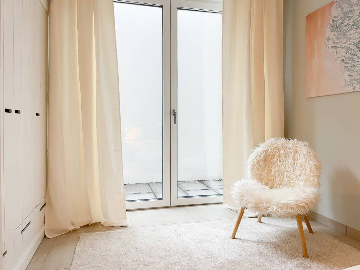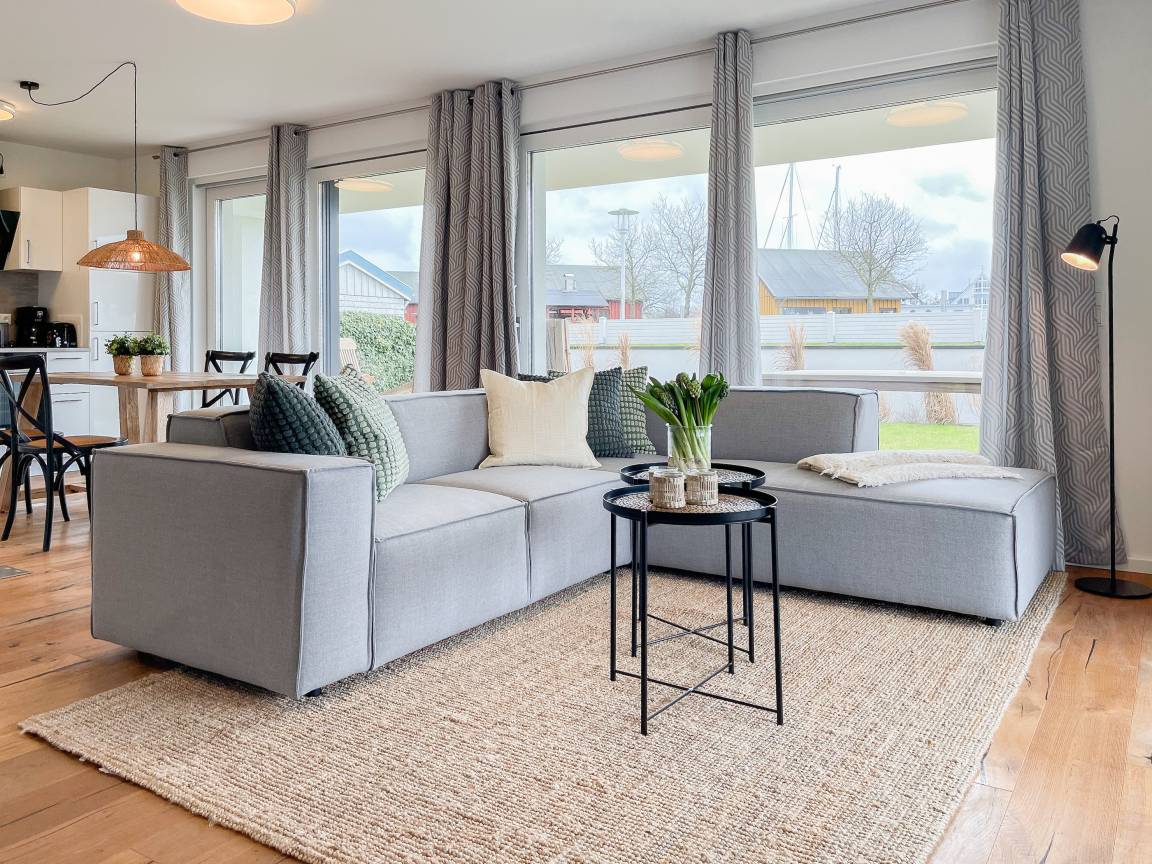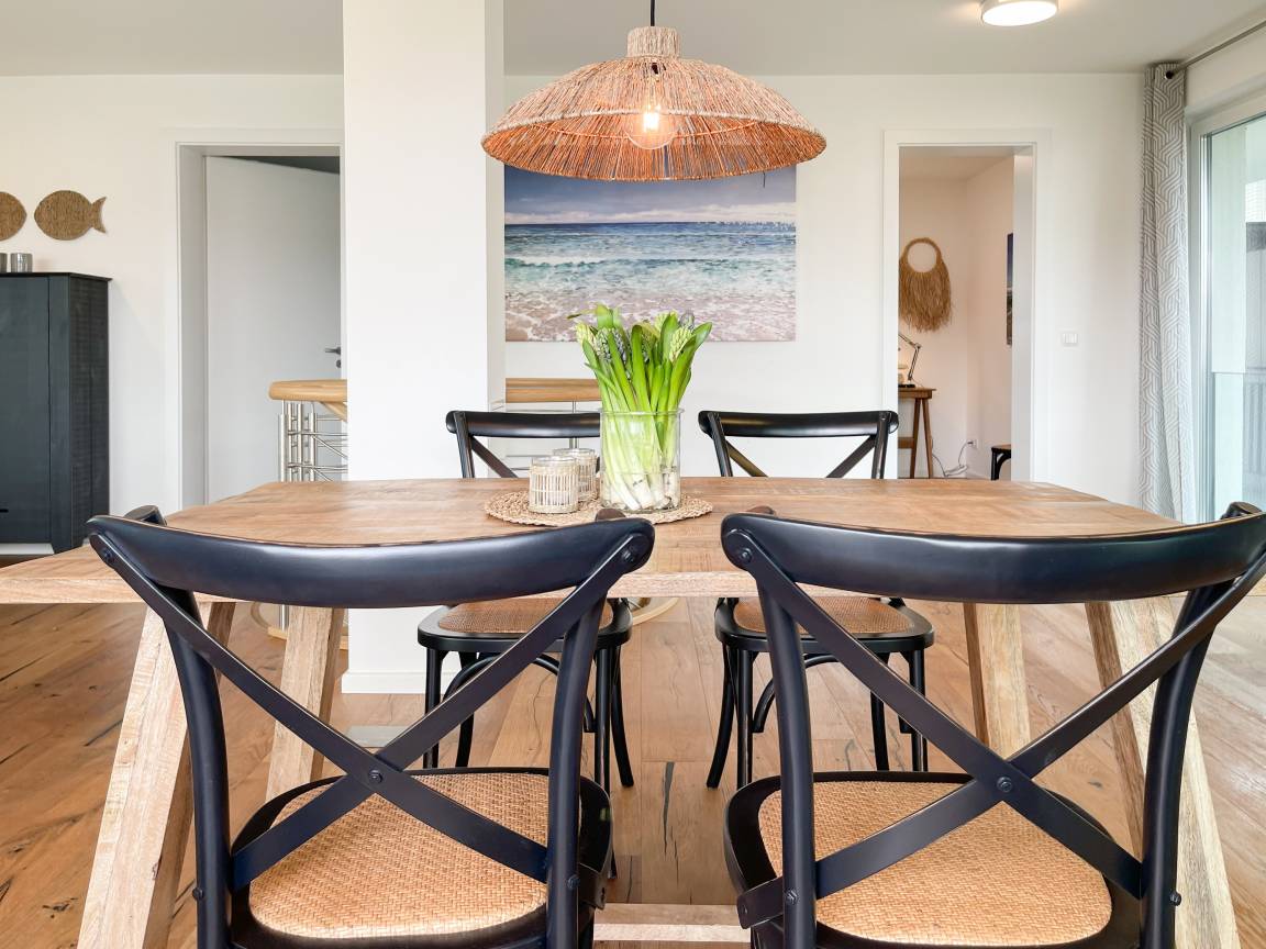 Die Ferienwohnung Hafendeck liegt im Erdgeschoss eines modernen Neubaus mit nur 3 Wohneinheiten und bietet auf 100 qm über 2 Wohnebenen ausreichend Raum für 5 Personen, um einen entspannten Urlaub in absoluter Strandnähe zu verleben. Das Herzstück der Wohnung bildet der lichtdurchflutete Wohn- und Essbereich mit[nbsp] bodentiefen Fensterelementen und einem schönen Blick auf die Holzterrasse und in den Garten, der ausschließlich von den Gästen des Hafendecks genutzt wird. Die großzügig angelegte Sonnenterrasse ist überdacht und sowohl zum Süden als auch zum Westen ausgerichtet. Gartenmöbel und 2 Deckchairs stehen zur Verfügung, um die Sonne von früh bis spät in besonderer Hafenatmosphäre zu genießen und sich an beeindruckenden Sonnenuntergängen bei einem Glas Wein zu erfreuen. Die offene Küche ist in den Wohnbereich integriert und bestens ausgestattet. Im EG befindet sich auch Schlafzimmer 1 mit einem Boxspringbett (160x200), geräumigem Kleiderschrank und Verdunkelungsplissees sowie ein kleines Bad mit Dusche, WC, Waschbecken und Fenster. Als Home Office dient ein weiterer abgeschlossener Raum, der mit einem Schreibtisch eingerichtet ist.