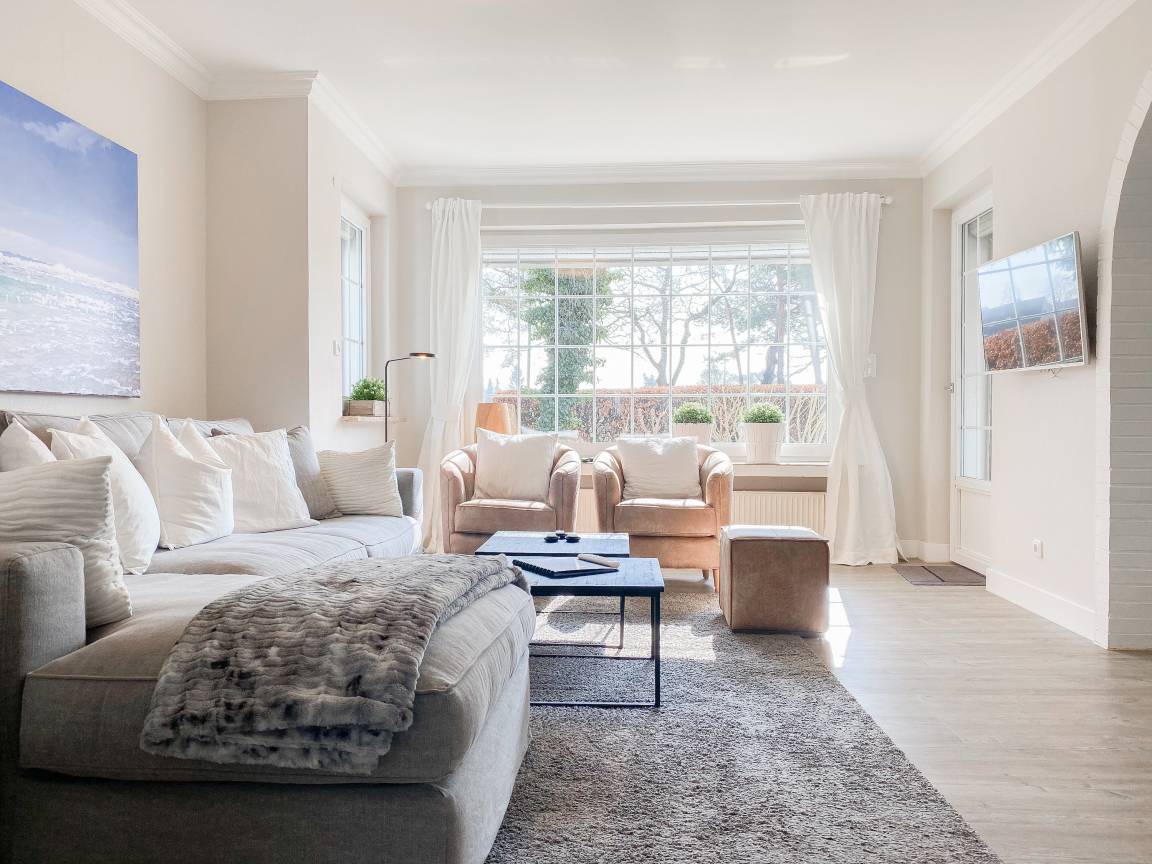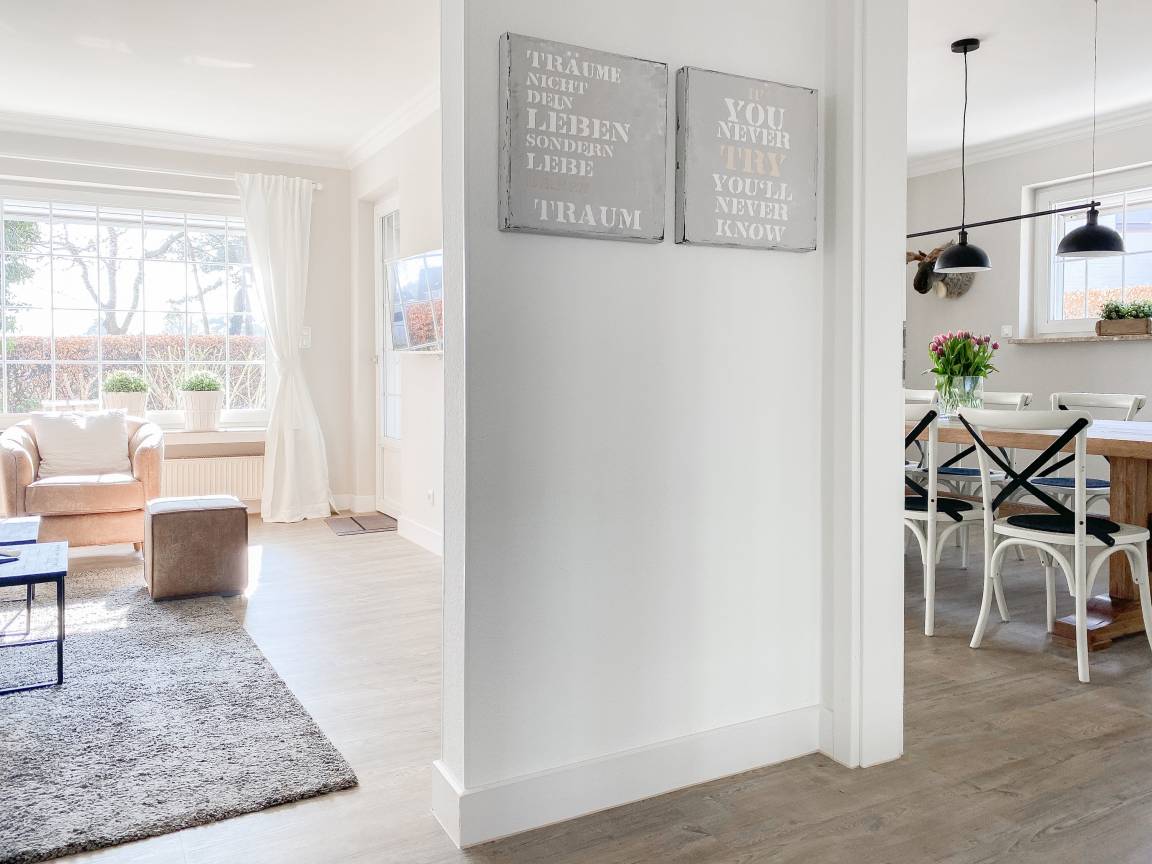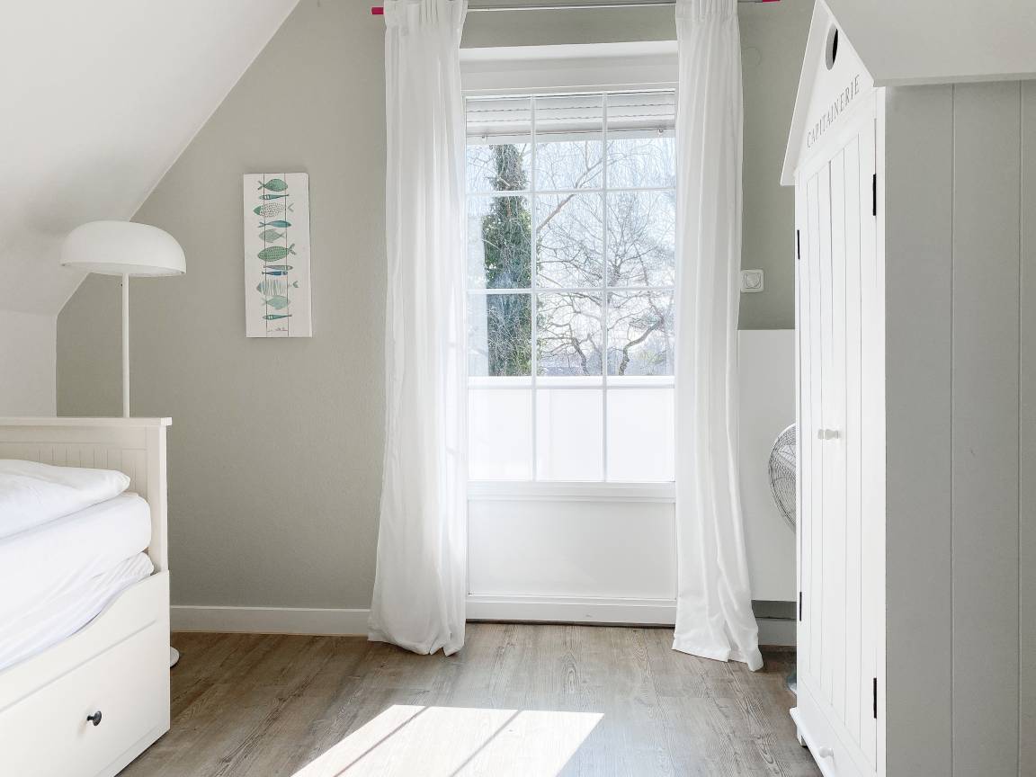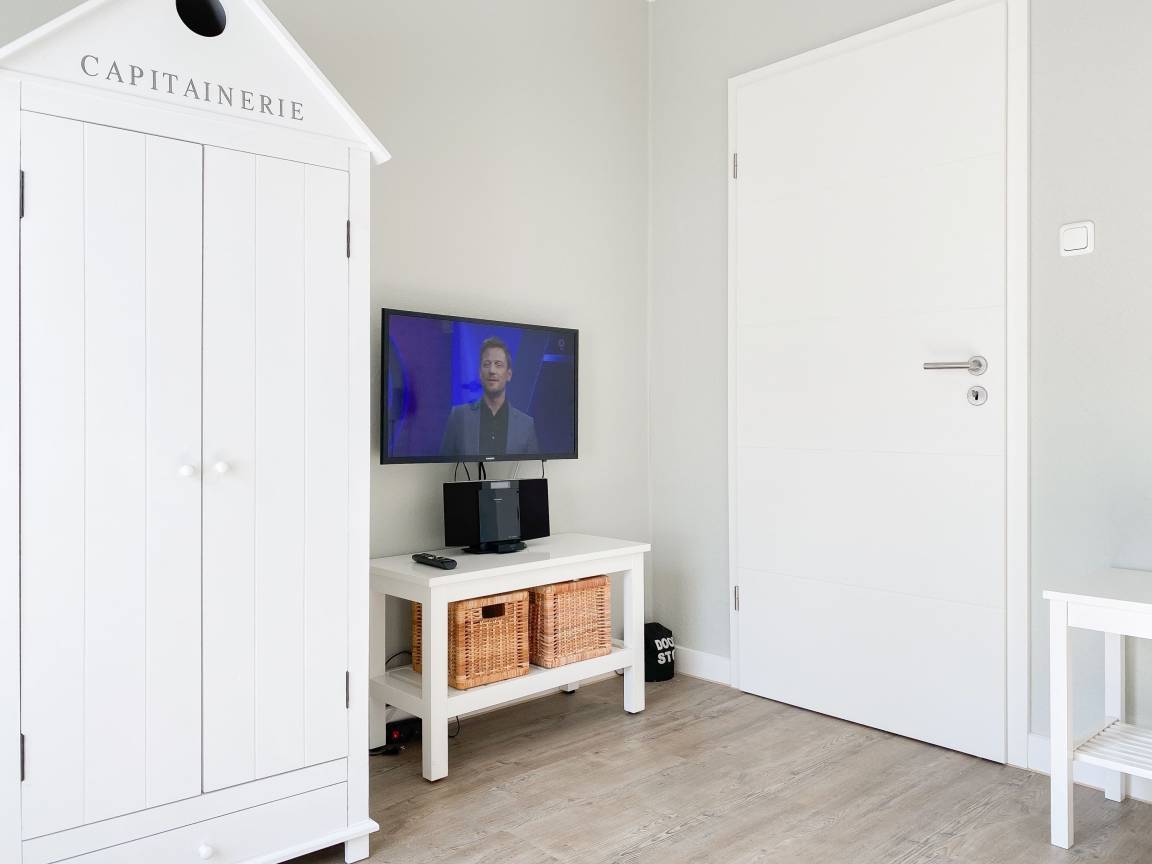 Die Einrichtung des Ferienhauses ist geschmackvoll und vermittelt eine tolle Strandatmosphäre. Das Haus [nbsp]bietet mit 4 Schlafzimmern und 2 Bädern ausreichend Platz für 7 Personen. Im Erdgeschoss befindet sich neben einem geräumigen Schlafzimmer (Boxspringbett 180x200), ein modernes Duschbad, eine voll ausgestattete Küche sowie der großzügige Wohn- und Essbereich. Sämtliche Fenster sind mit elektrischen Außenjalousien versehen. Im OG sind 3 weitere Schlafzimmer mit TV und elektrischen Außenjalousien (2 Doppelbetten 180x200, 1 Einzelbett mit Auszug auf 160x200), ein modernes helles Bad mit Dusche und Badewanne sowie ein separates WC untergebracht. Vor einem der Schlafzimmer befindet sich ein Sonnenbalkon.