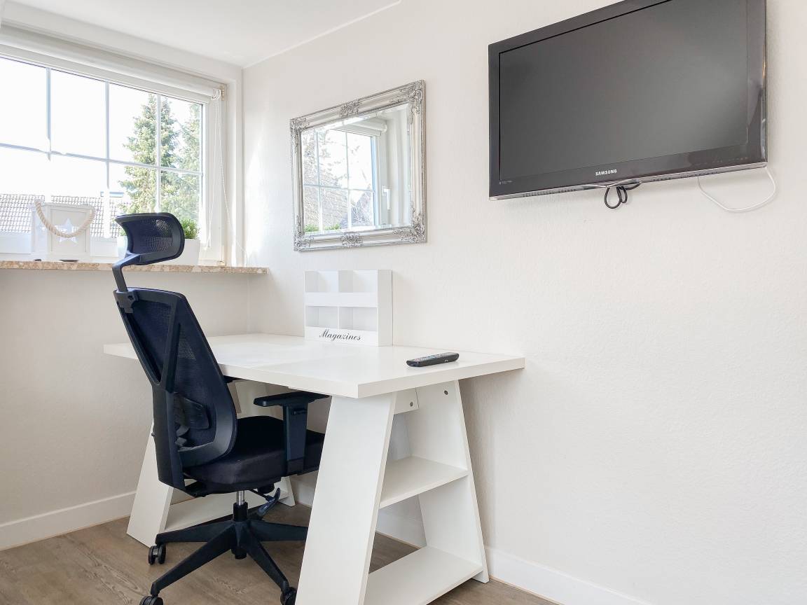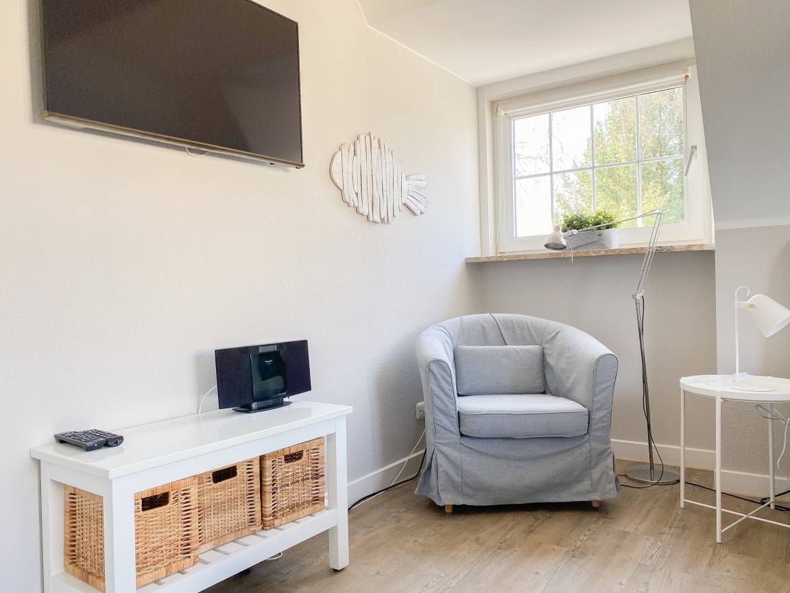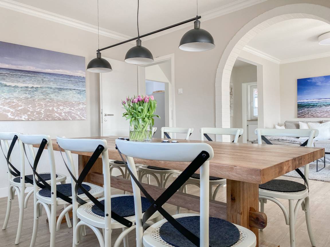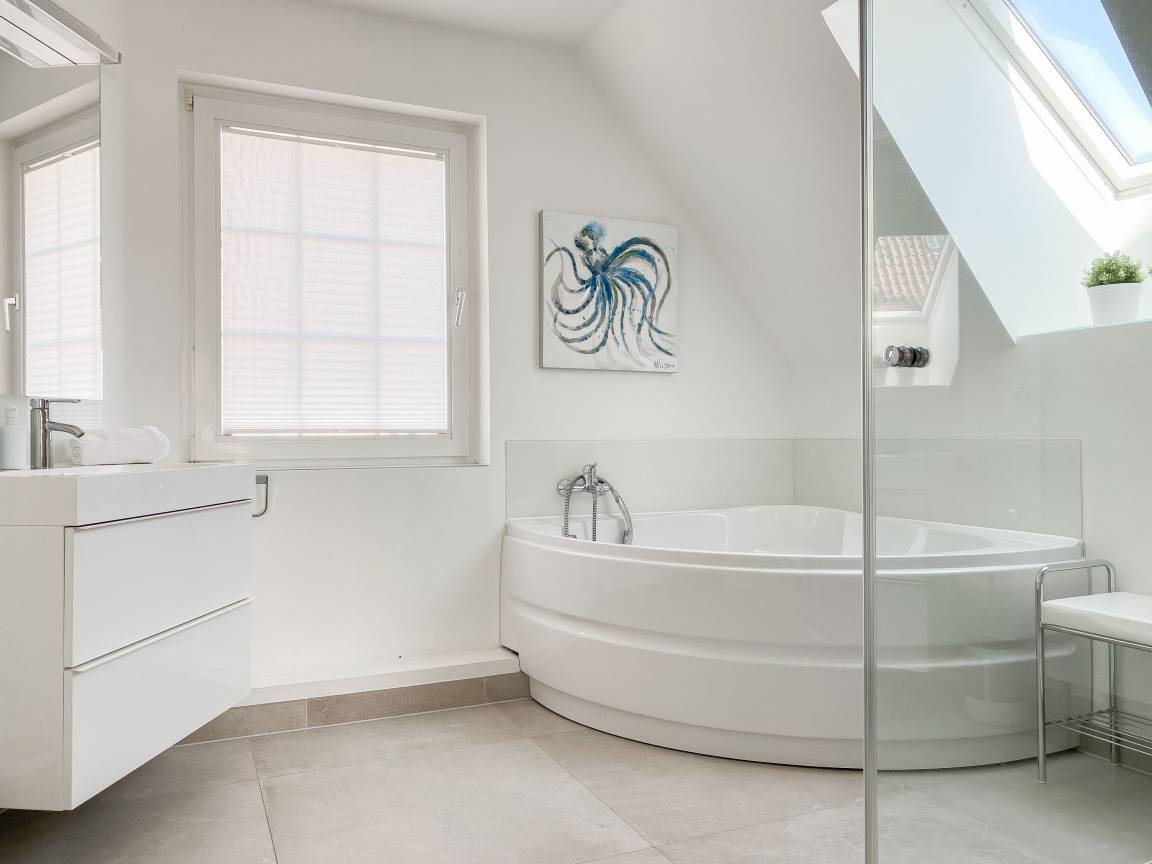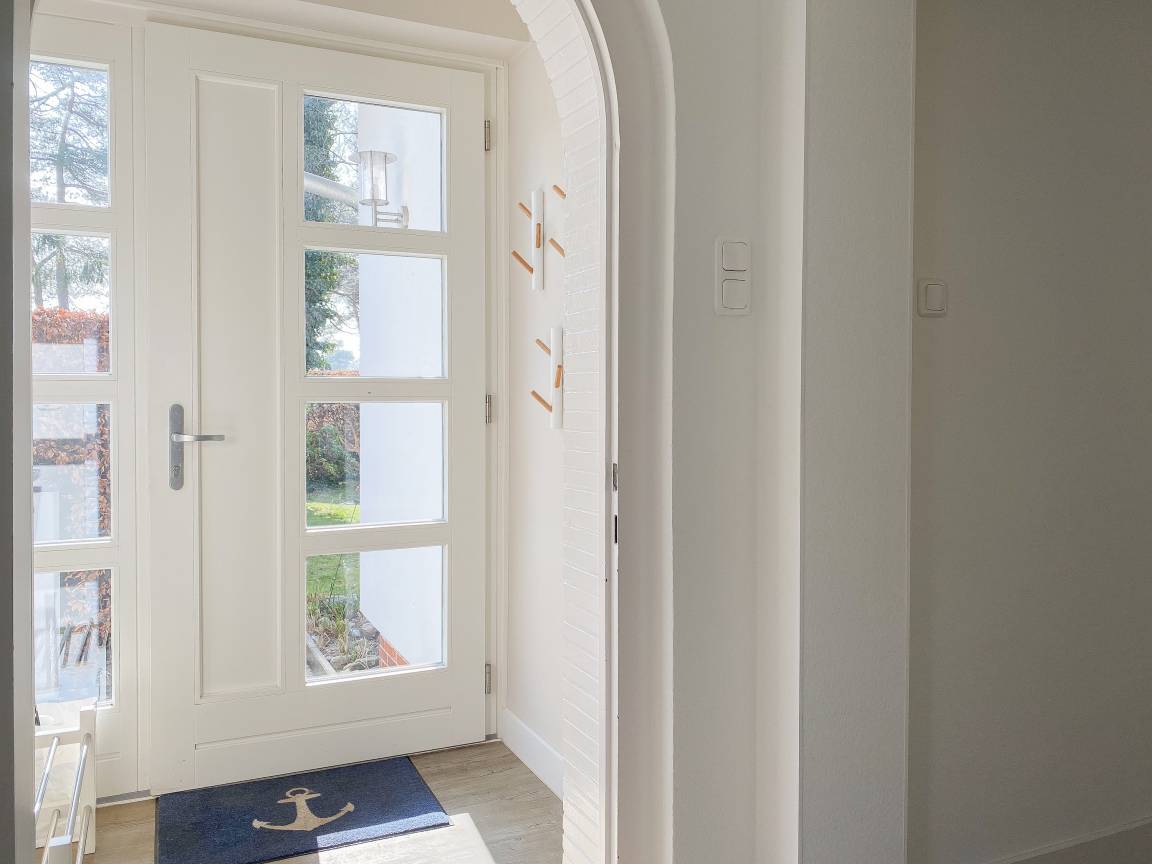 Die Einrichtung des Ferienhauses ist geschmackvoll und vermittelt eine tolle Strandatmosphäre. Das Haus [nbsp]bietet mit 4 Schlafzimmern und 2 Bädern ausreichend Platz für 7 Personen. Im Erdgeschoss befindet sich neben einem geräumigen Schlafzimmer (Boxspringbett 180x200), ein modernes Duschbad, eine voll ausgestattete Küche sowie der großzügige Wohn- und Essbereich. Sämtliche Fenster sind mit elektrischen Außenjalousien versehen. Im OG sind 3 weitere Schlafzimmer mit TV und elektrischen Außenjalousien (2 Doppelbetten 180x200, 1 Einzelbett mit Auszug auf 160x200), ein modernes helles Bad mit Dusche und Badewanne sowie ein separates WC untergebracht. Vor einem der Schlafzimmer befindet sich ein Sonnenbalkon.