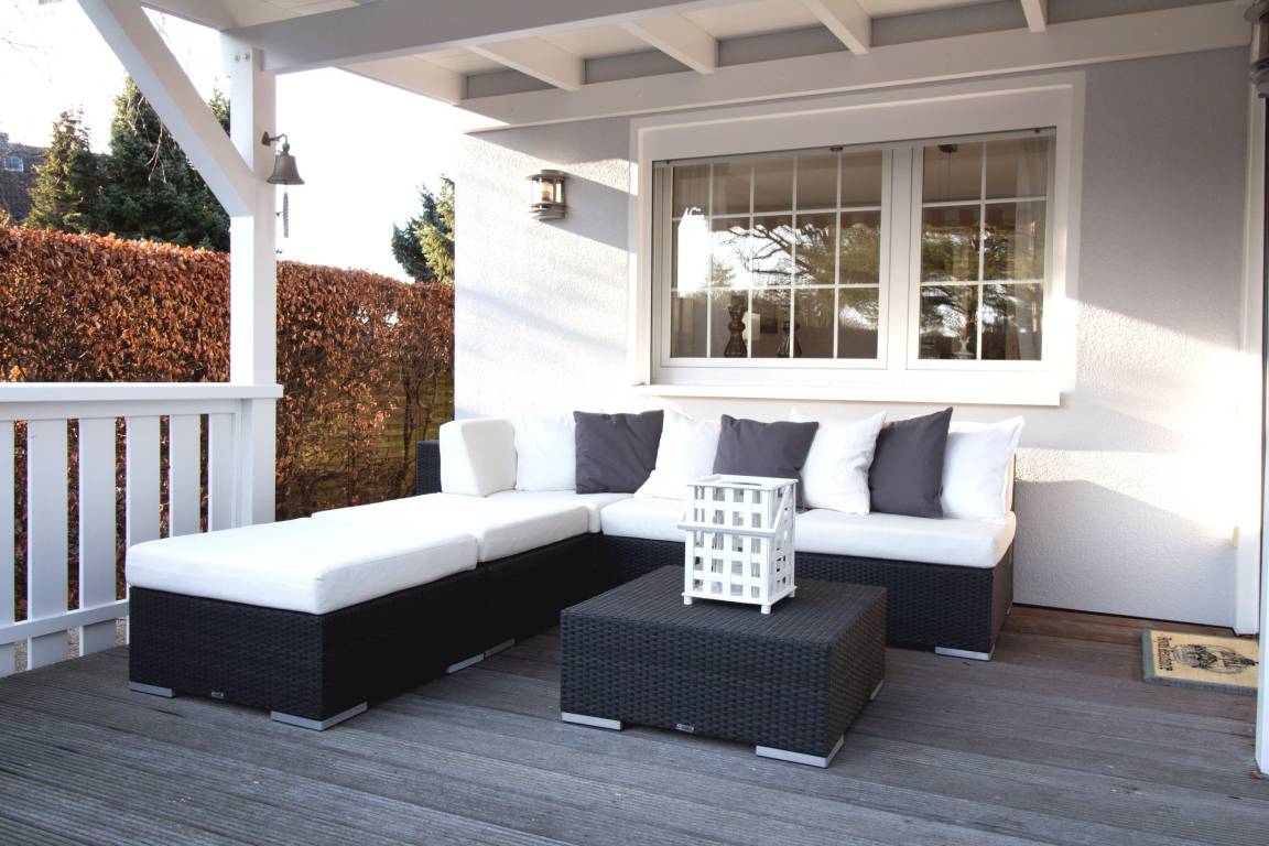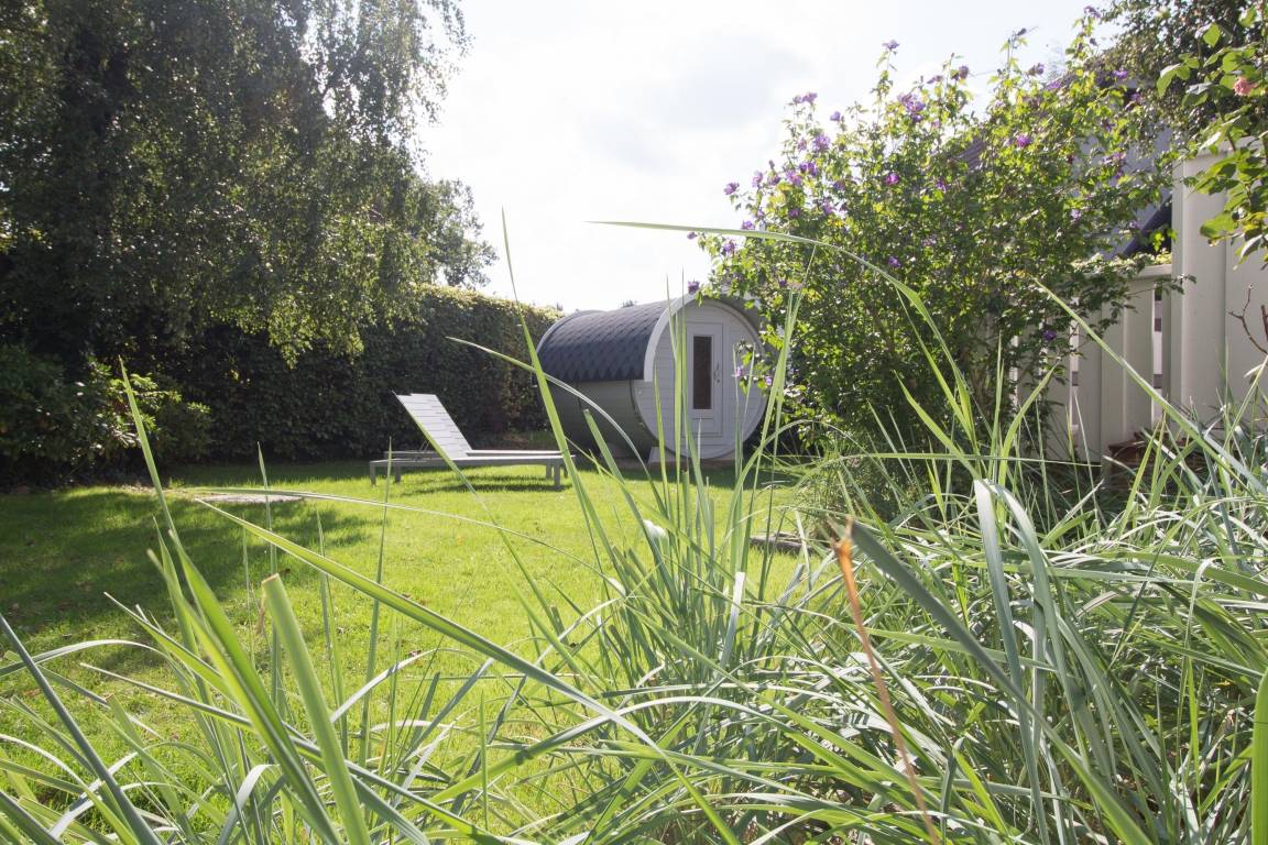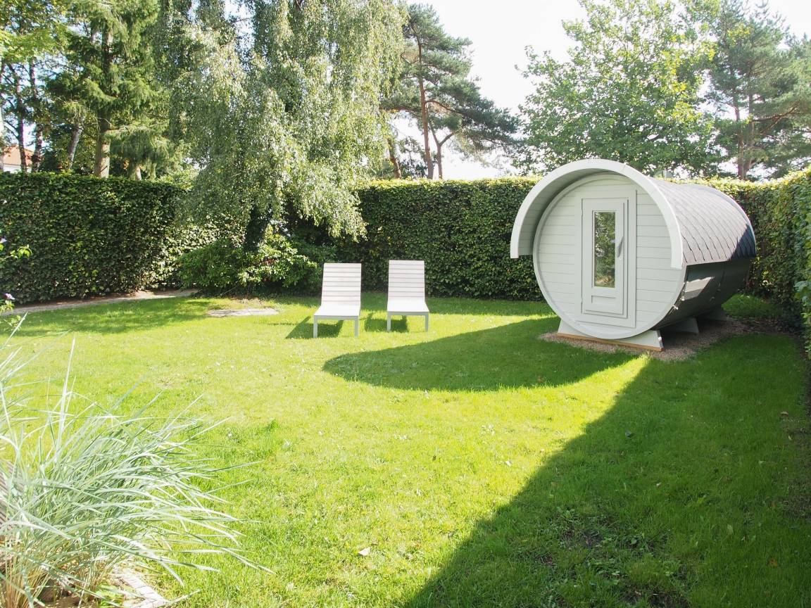 Das vorgelagerte Sonnendeck ist zum Teil überdacht und lädt mit gemütlichen Lounge-Möbeln zu jeder Tageszeit zum Relaxen ein. Eine elektrische Markise, Gartenmöbel und Sonnenliegen sind selbstverständlich vorhanden. Nach dem Strandgang läßt es sich wunderbar in der Gartensauna entspannen. WLAN, Sauna, Waschmaschine und Trockner stehen zur kostenlosen Nutzung zur Verfügung. Ein Pkw Stellplatz und ein Fahrradschuppen befinden sich am Haus.