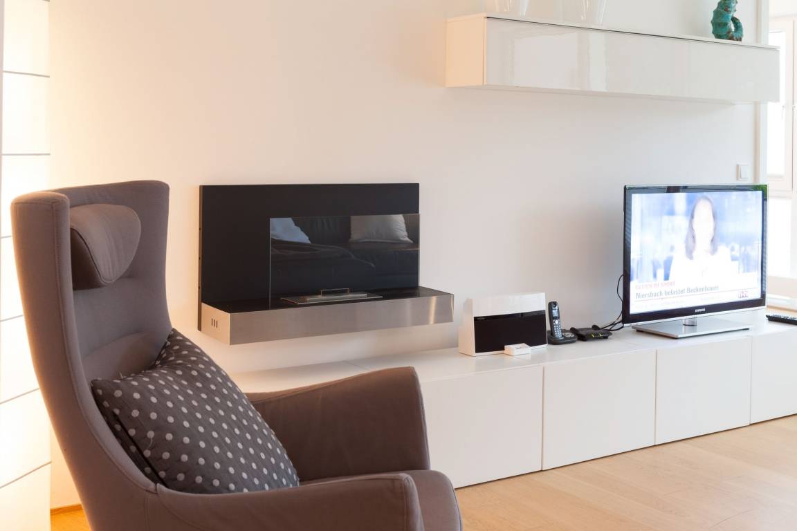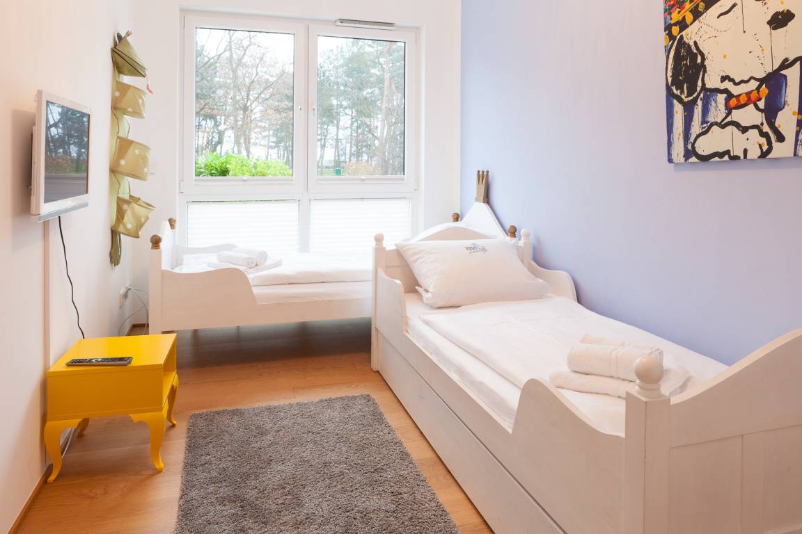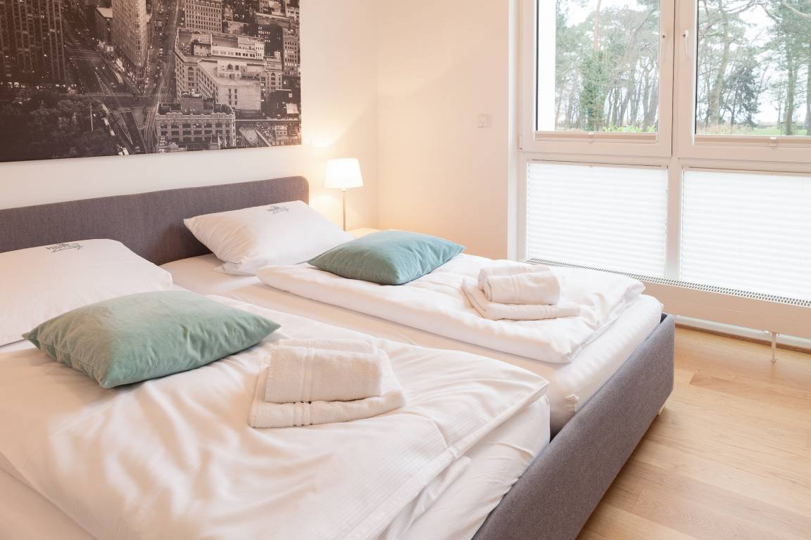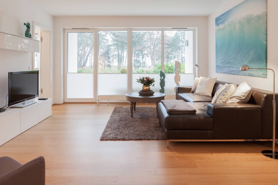 Die moderne, stilvoll eingerichtete Wohnung ist komplett mit Echtholzparkett ausgestattet. Alle Fensterelemente sind bodentief und mit elektrischen Außenjalousien versehen. Es gibt einen großzügigen Wohnraum mit Ethanolkamin, TV, Radio und WLAN[nbsp] und einen tollem Blick bis zur Ostsee. Die offene, moderne Einbauküche mit großzügigem Essbereich genügt höchsten Ansprüchen und verfügt über Mikrowelle, Backofen, Spülmaschine und Induktionskochfeld. Zwei separate Schlafzimmer (ein Doppelbett 200x200 und 2 Einzelbetten 80x200), ein weiterer TV mit integriertem DVD Laufwerk sowie ein modernes Bad mit großem, ebenerdigen Duschbereich und Fußbodenheizung stehen zur Verfügung. Die riesige, 50 qm große Terrasse ist mit Esstisch und Stühlen sowie mit gemütlichen Loungemöbeln ausgestattet, überdacht und windgeschützt. Herrlich zum Entspannen und den schönen Blick auf die Ostsee zu genießen. Das Haus am Meer verfügt über einen Fahrstuhl und eine Tiefgarage (Einfahrstshöhe 2 m), in der ein fester Stellplatz reserviert ist. Ein Fahrradkeller, Münzwaschmaschine und -Trockner sind vorhanden. Für unsere kleinen Gäste befindet sich auf der Gartenseite des Hauses ein Spielplatz.