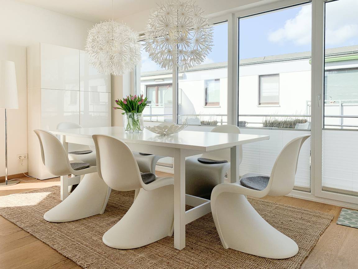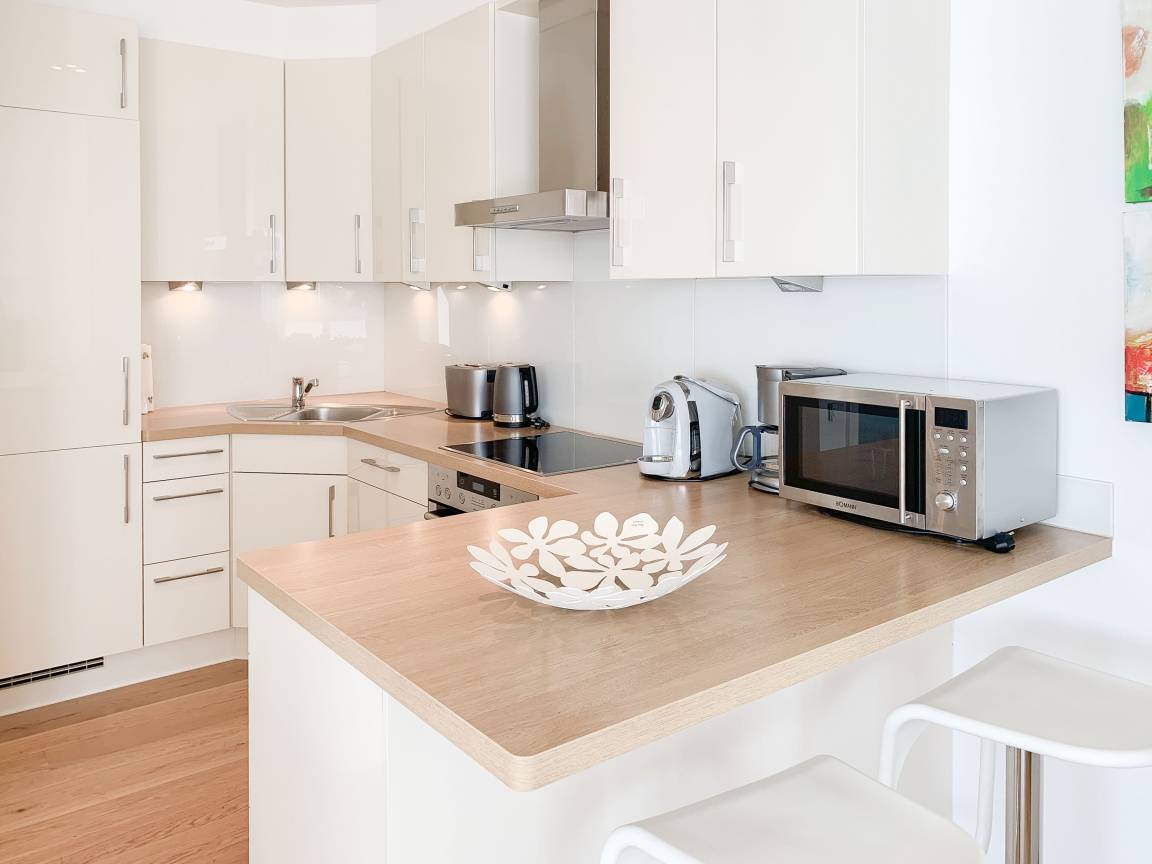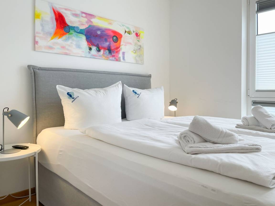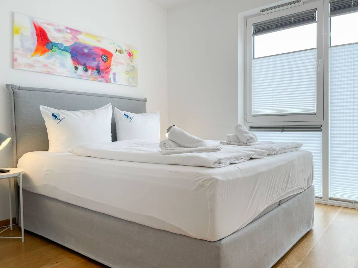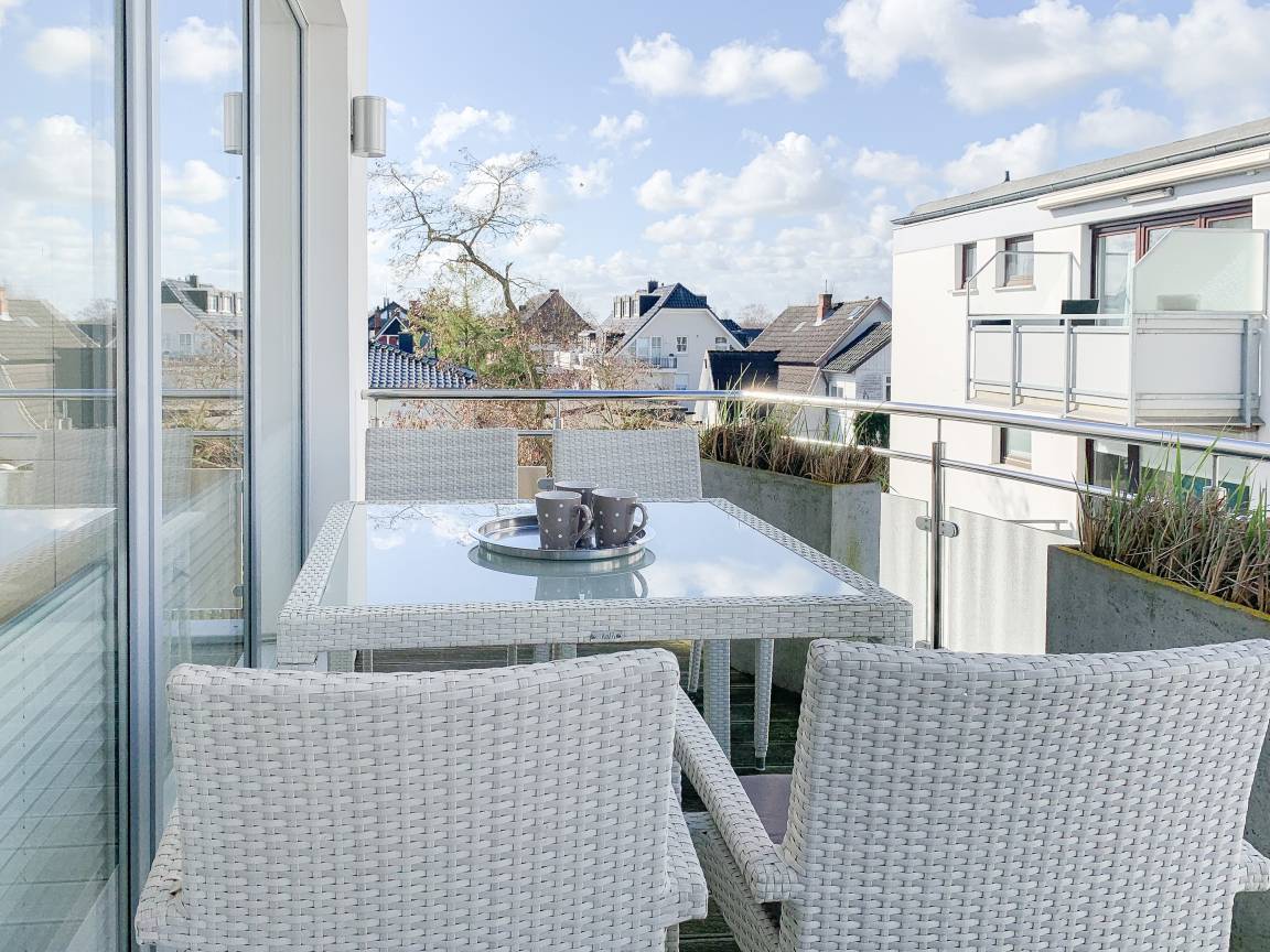 Die geschmackvoll eingerichtete Wohnung[nbsp] im 2. Obergeschoss hat helle, sonnige Wohnräume mit großen Fensterflächen und Echtholzparkett, die eine angenehme Wohnatmosphäre schaffen. Die offene Einbauküche verfügt über Mikrowelle, Backofen, Kochfeld und Spülmaschine. Im anschließenden Wohnbereich mit gemütlichem Sofa und Ethanol-Kamin, befinden sich ein TV, Hifi-Anlage sowie Internetanschluss über WLAN. Vor dem großzügigen Essbereich, der für 6 Personen ausreichend Platz bietet, befindet sich der mit Gartenmöbeln ausgestattete Westbalkon, auf dem vom frühen Nachmittag bis in die Abendstunden die Sonne scheint. Es stehen zwei separate Schlafzimmer zur Verfügung, wovon das eine mit einem Doppelbett (180x200) und das andere mit einem Doppelbett (160x200) und[nbsp] TV ausgestattet ist. Beide Schlafräume verfügen über Kleiderschränke mit ausreichen Stauraum für die Urlaubsgarderobe und die Fenster sind mit Verdunkelungsplissees versehen. Im modernen Bad mit großer Dusche und Handtuchwärmer ist eine Waschmaschine untergebracht. Ein separates Gäste WC steht ebenfalls zur Verfügung. Ein fest reservierter PKW Stellplatz und ein Fahrradkeller befindet sich in der hauseigenen Tiefgarage (Einfahrtshöhe 2 m). Das Haus verfügt über einen Fahrstuhl. Münzwaschmaschine und Trockner sind vorhanden.