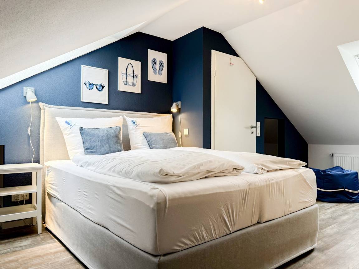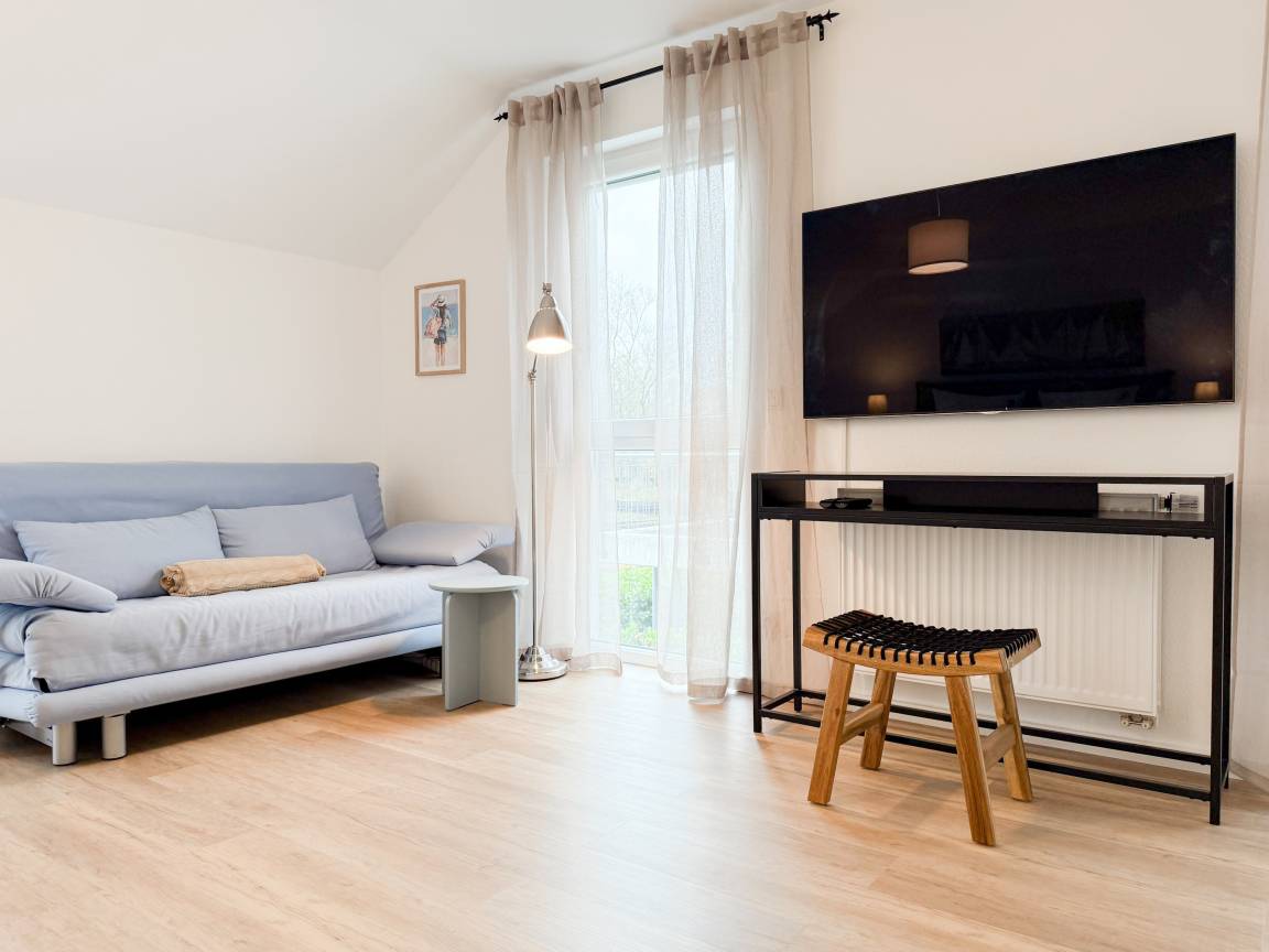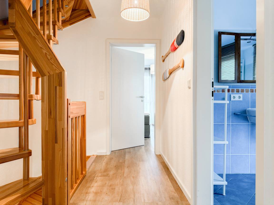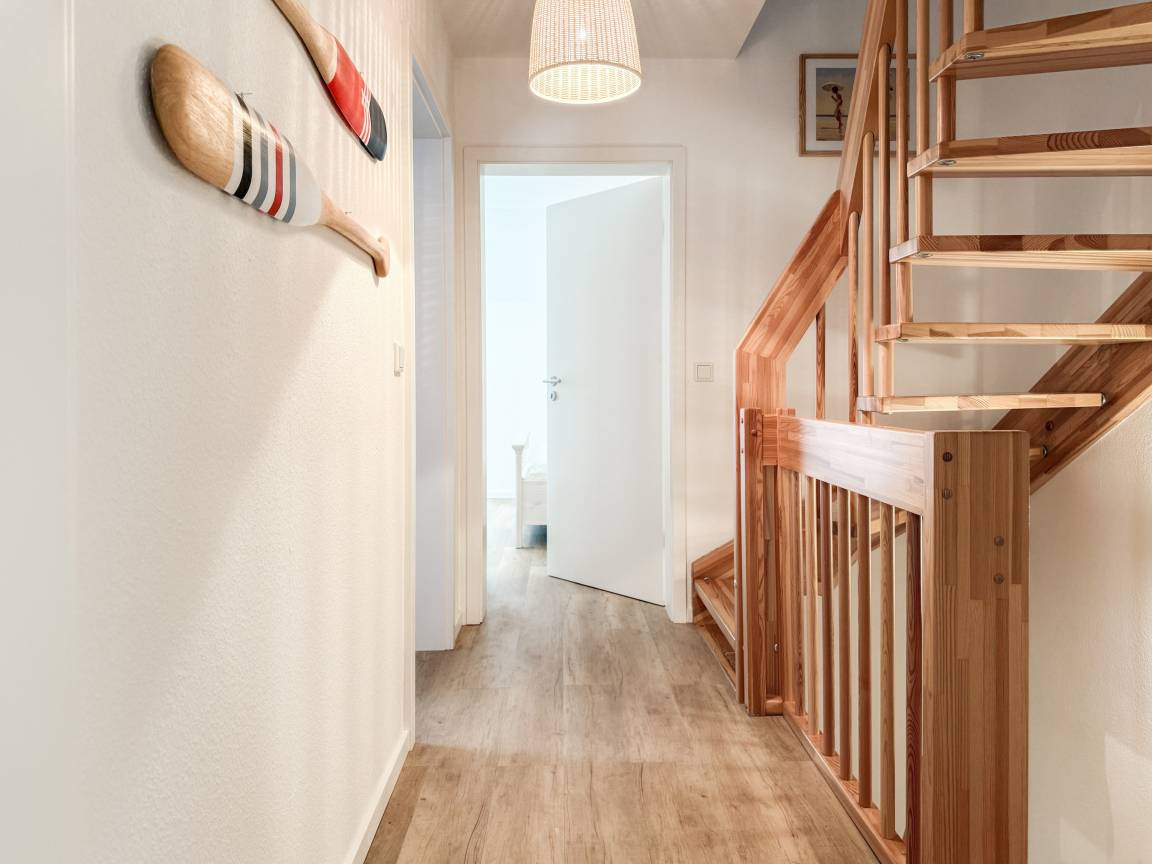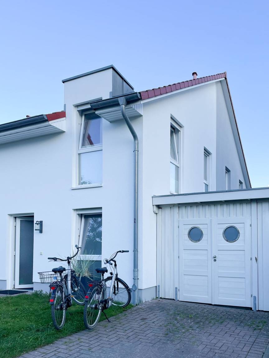 Willkommen in diesem wunderbaren Doppelhaus, das mit 3 Schlafzimmern und 2 Bädern auf über 100 qm Wohnfläche perfekt für 6 Personen geeignet ist, um einen erholsamen Ostseeurlaub in unmittelbarer Nähe zum Strand zu verbringen. Sonnige Räume und die äußerst hochwertige Ausstattung sorgen für besten Wohnkomfort in einem angenehmen Ambiente. Im Erdgeschoss erwartet Sie ein großzügiger Wohnbereich, der mit einem komfortablen Ecksofa und einem TV eingerichtet ist. Der angrenzende Essbereich ist ebenfalls großzügig gestaltet und verfügt über einen runden Esstisch, eine Sitzbank sowie Stühle, die perfekt für gesellige Stunden und gemeinsame Mahlzeiten geeignet sind. Besonders schön ist die nach Süden ausgerichtete Sonnenterrasse, die viel Tageslicht einfängt. Sie ist mit Gartenmöbeln, einem Strandkorb und einer elektrischen Markise ausgestattet, die an sonnigen Tagen für Schatten sorgt. Die großzügige, separat gelegene Einbauküche ist hervorragend ausgestattet und bietet alle Annehmlichkeiten, die man für das gemeinsame Kochen benötigt. Hier können Sie sich in geselliger Runde beim Kochen austauschen und kreativ sein. Im Eingangsbereich befindet sich eine praktische Garderobe, die Platz für Jacken und Schuhe bietet. Angrenzend gibt es ein modernes Tageslichtbad, ausgestattet mit Dusche, Waschbecken und WC. Waschmaschine und Trockner sind in einem separaten Abstellraum untergebracht, ebenfalls im Erdgeschoss. Im Obergeschoss befindet sich ein weiteres Badezimmer mit Waschtisch, Duschwanne, WC und Fenster. Rechts und links davon sind zwei separate Schlafzimmer angeordnet. Schlafzimmer 1 ist äußerst geräumig und mit einem Boxspringbett (180x210), einem Kleiderschrank mit ausreichend Stauraum für Ihre Urlaubsgarderobe und einem Fernseher eingerichtet. Ein kleiner Wohnbereich mit einem Sofa bietet einen gemütlichen Rückzugsort zum Entspannen und Lesen. Schlafzimmer 2 ist ebenfalls mit einem Doppelbett (180x200), TV, einem geräumigen Kleiderschrank sowie einer Leseecke ausgestattet. Im Dachgeschoss befindet sich das 3. Schlafzimmer mit einem Boxspringbett (160x200), Kleiderschrank, TV und Schreibtisch. Die Dachflächenfenster lassen sich über ein Rollo verdunkeln, alle anderen Fenster des Hauses sind mit elektrischen Außenjalousien versehen. WLAN steht selbstverständlich kostenlos zur Verfügung. Vor dem Haus befinden sich zwei Parkplätze. Fahrräder können sicher und trocken im Schuppen direkt am Haus untergebracht werden.