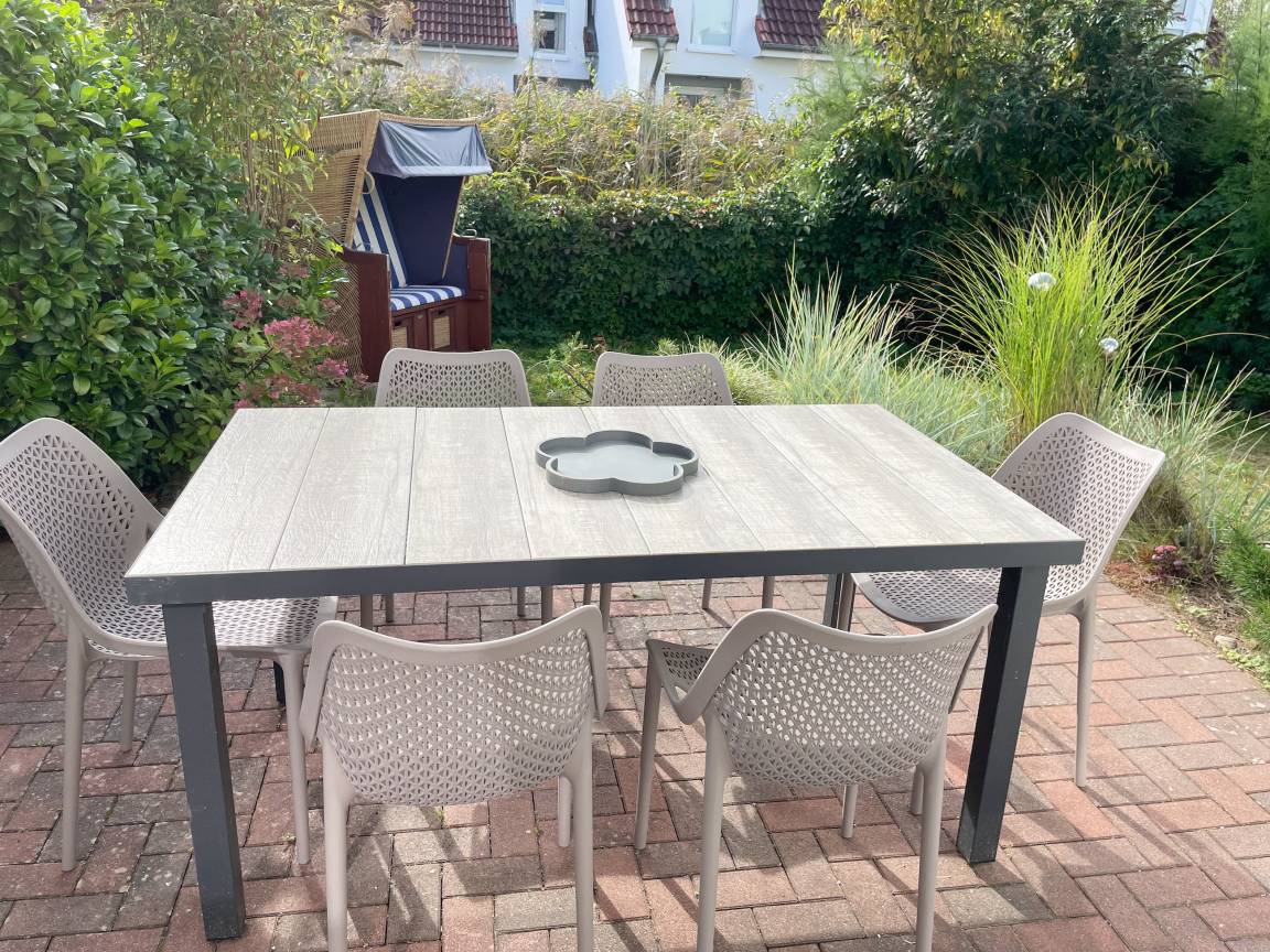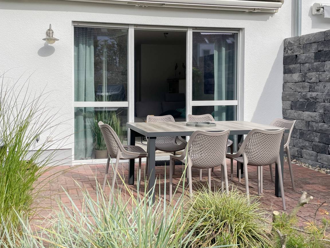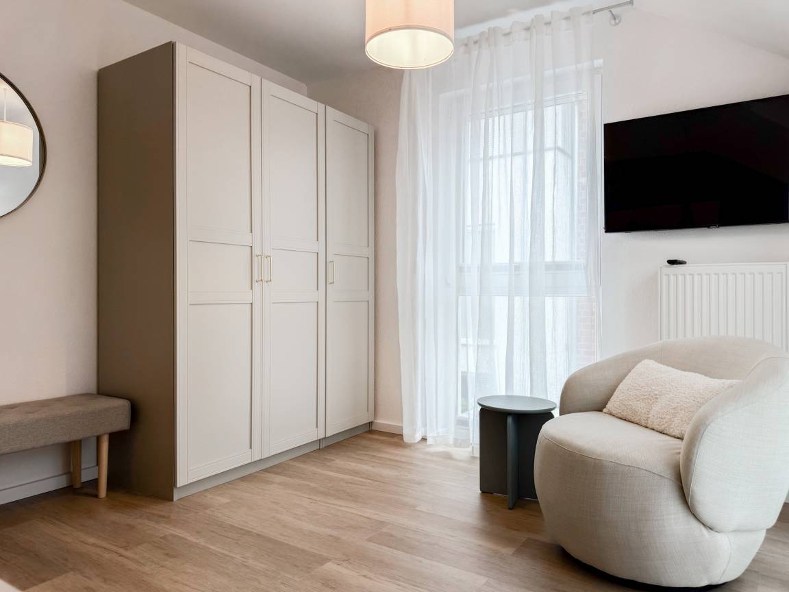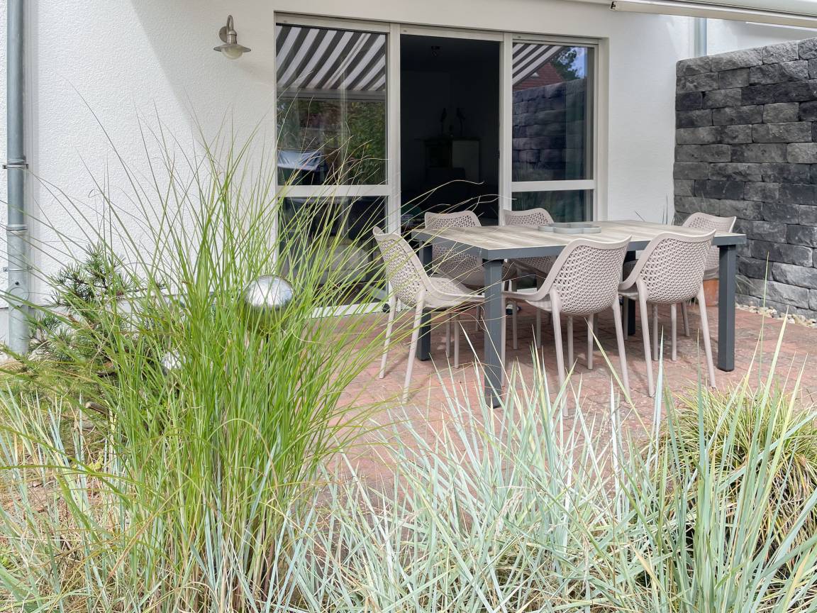 Willkommen in diesem wunderbaren Doppelhaus, das mit 3 Schlafzimmern und 2 Bädern auf über 100 qm Wohnfläche perfekt für 6 Personen geeignet ist, um einen erholsamen Ostseeurlaub in unmittelbarer Nähe zum Strand zu verbringen. Sonnige Räume und die äußerst hochwertige Ausstattung sorgen für besten Wohnkomfort in einem angenehmen Ambiente. Im Erdgeschoss erwartet Sie ein großzügiger Wohnbereich, der mit einem komfortablen Ecksofa und einem TV eingerichtet ist. Der angrenzende Essbereich ist ebenfalls großzügig gestaltet und verfügt über einen runden Esstisch, eine Sitzbank sowie Stühle, die perfekt für gesellige Stunden und gemeinsame Mahlzeiten geeignet sind. Besonders schön ist die nach Süden ausgerichtete Sonnenterrasse, die viel Tageslicht einfängt. Sie ist mit Gartenmöbeln, einem Strandkorb und einer elektrischen Markise ausgestattet, die an sonnigen Tagen für Schatten sorgt. Die großzügige, separat gelegene Einbauküche ist hervorragend ausgestattet und bietet alle Annehmlichkeiten, die man für das gemeinsame Kochen benötigt. Hier können Sie sich in geselliger Runde beim Kochen austauschen und kreativ sein. Im Eingangsbereich befindet sich eine praktische Garderobe, die Platz für Jacken und Schuhe bietet. Angrenzend gibt es ein modernes Tageslichtbad, ausgestattet mit Dusche, Waschbecken und WC. Waschmaschine und Trockner sind in einem separaten Abstellraum untergebracht, ebenfalls im Erdgeschoss. Im Obergeschoss befindet sich ein weiteres Badezimmer mit Waschtisch, Duschwanne, WC und Fenster. Rechts und links davon sind zwei separate Schlafzimmer angeordnet. Schlafzimmer 1 ist äußerst geräumig und mit einem Boxspringbett (180x210), einem Kleiderschrank mit ausreichend Stauraum für Ihre Urlaubsgarderobe und einem Fernseher eingerichtet. Ein kleiner Wohnbereich mit einem Sofa bietet einen gemütlichen Rückzugsort zum Entspannen und Lesen. Schlafzimmer 2 ist ebenfalls mit einem Doppelbett (180x200), TV, einem geräumigen Kleiderschrank sowie einer Leseecke ausgestattet. Im Dachgeschoss befindet sich das 3. Schlafzimmer mit einem Boxspringbett (160x200), Kleiderschrank, TV und Schreibtisch. Die Dachflächenfenster lassen sich über ein Rollo verdunkeln, alle anderen Fenster des Hauses sind mit elektrischen Außenjalousien versehen. WLAN steht selbstverständlich kostenlos zur Verfügung. Vor dem Haus befinden sich zwei Parkplätze. Fahrräder können sicher und trocken im Schuppen direkt am Haus untergebracht werden.