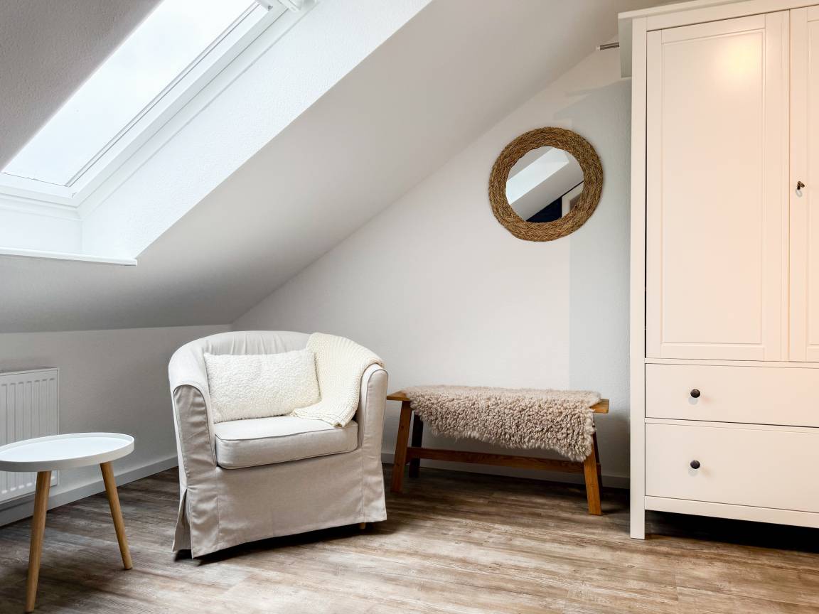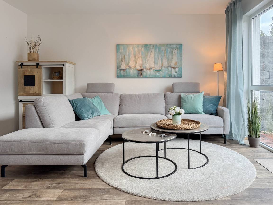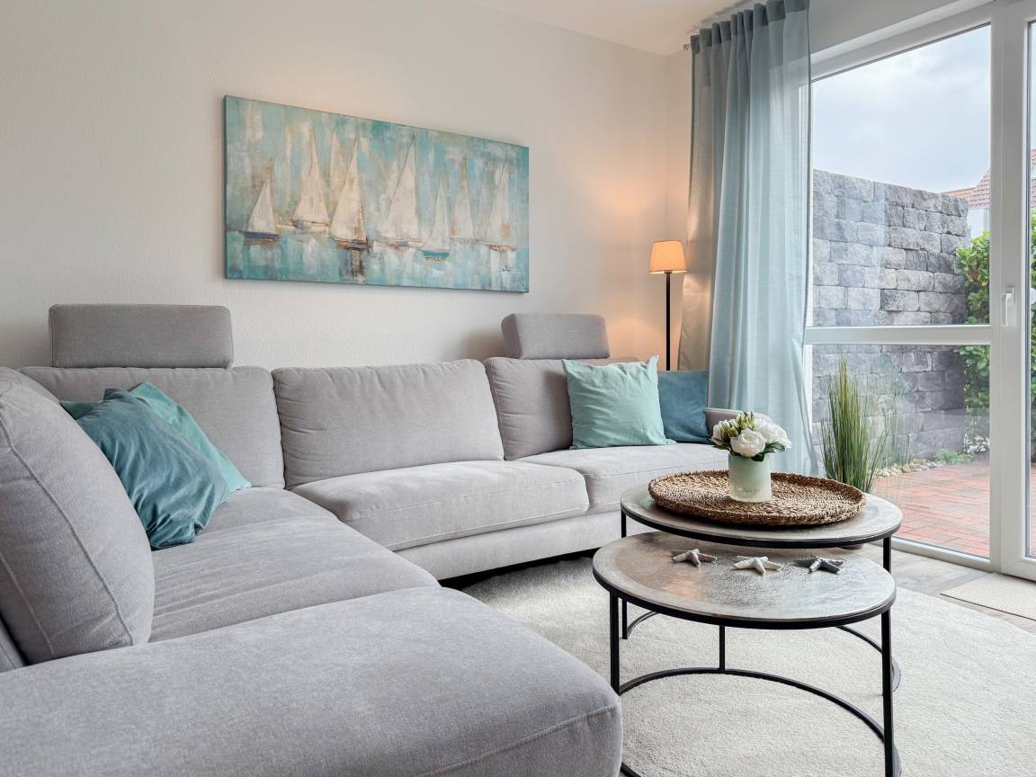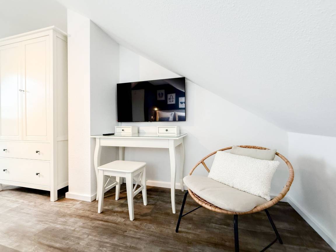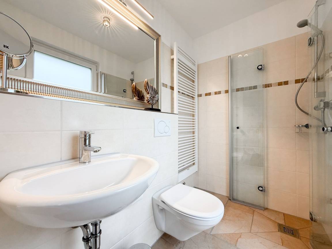 Willkommen in diesem wunderbaren Doppelhaus, das mit 3 Schlafzimmern und 2 Bädern auf über 100 qm Wohnfläche perfekt für 6 Personen geeignet ist, um einen erholsamen Ostseeurlaub in unmittelbarer Nähe zum Strand zu verbringen. Sonnige Räume und die äußerst hochwertige Ausstattung sorgen für besten Wohnkomfort in einem angenehmen Ambiente. Im Erdgeschoss erwartet Sie ein großzügiger Wohnbereich, der mit einem komfortablen Ecksofa und einem TV eingerichtet ist. Der angrenzende Essbereich ist ebenfalls großzügig gestaltet und verfügt über einen runden Esstisch, eine Sitzbank sowie Stühle, die perfekt für gesellige Stunden und gemeinsame Mahlzeiten geeignet sind. Besonders schön ist die nach Süden ausgerichtete Sonnenterrasse, die viel Tageslicht einfängt. Sie ist mit Gartenmöbeln, einem Strandkorb und einer elektrischen Markise ausgestattet, die an sonnigen Tagen für Schatten sorgt. Die großzügige, separat gelegene Einbauküche ist hervorragend ausgestattet und bietet alle Annehmlichkeiten, die man für das gemeinsame Kochen benötigt. Hier können Sie sich in geselliger Runde beim Kochen austauschen und kreativ sein. Im Eingangsbereich befindet sich eine praktische Garderobe, die Platz für Jacken und Schuhe bietet. Angrenzend gibt es ein modernes Tageslichtbad, ausgestattet mit Dusche, Waschbecken und WC. Waschmaschine und Trockner sind in einem separaten Abstellraum untergebracht, ebenfalls im Erdgeschoss. Im Obergeschoss befindet sich ein weiteres Badezimmer mit Waschtisch, Duschwanne, WC und Fenster. Rechts und links davon sind zwei separate Schlafzimmer angeordnet. Schlafzimmer 1 ist äußerst geräumig und mit einem Boxspringbett (180x210), einem Kleiderschrank mit ausreichend Stauraum für Ihre Urlaubsgarderobe und einem Fernseher eingerichtet. Ein kleiner Wohnbereich mit einem Sofa bietet einen gemütlichen Rückzugsort zum Entspannen und Lesen. Schlafzimmer 2 ist ebenfalls mit einem Doppelbett (180x200), TV, einem geräumigen Kleiderschrank sowie einer Leseecke ausgestattet. Im Dachgeschoss befindet sich das 3. Schlafzimmer mit einem Boxspringbett (160x200), Kleiderschrank, TV und Schreibtisch. Die Dachflächenfenster lassen sich über ein Rollo verdunkeln, alle anderen Fenster des Hauses sind mit elektrischen Außenjalousien versehen. WLAN steht selbstverständlich kostenlos zur Verfügung. Vor dem Haus befinden sich zwei Parkplätze. Fahrräder können sicher und trocken im Schuppen direkt am Haus untergebracht werden.