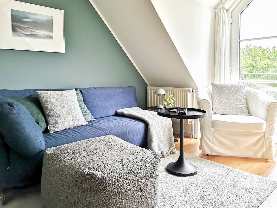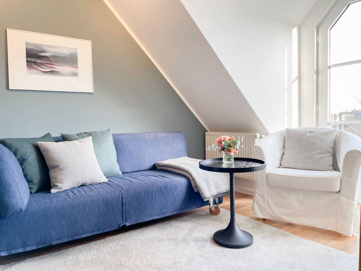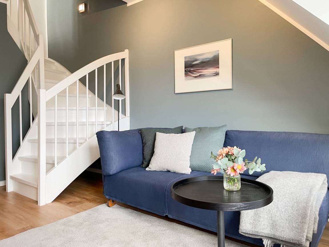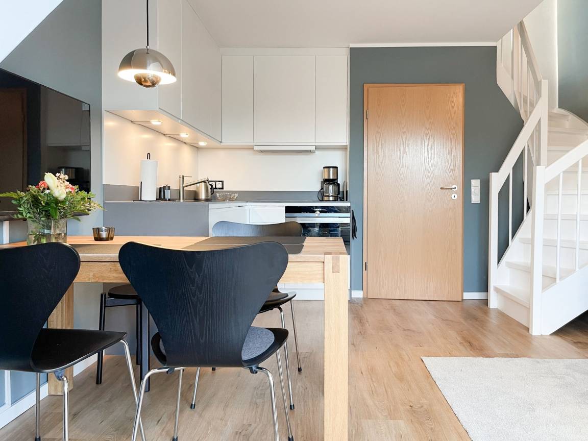 Die lichtdurchflutete Maisonette liegt im 2. Obergeschoss und erstreckt sich über zwei Ebenen zur sonnigen Süd-Ost-Seite. Die stilvolle, skandinavische Einrichtung mit liebevollen Details schafft ein behagliches Ambiente für zwei Personen. Der hochwertig eingerichtete Wohn- und Essbereich bietet neben einem TV und einem Bluetoothradio selbstverständlich auch kostenloses WLAN. Die vom Tischler angefertigte, voll ausgestattete Küche lässt keine Wünsche offen. Das separate Schlafzimmer, ebenfalls passgenau vom Tischler, verfügt über ein Doppelbett (160cm x 200cm, getrennte Matratzen 80x200 mit Toppern) und einen Kleiderschrank. Verdunkelungsvorhänge sorgen für einen erholsamen Schlaf. Das neue, hochwertige Bad ist mit einer Dusche, WC, Waschtisch und Fenster ausgestattet.Die obere Wohnebene, erreichbar über eine Treppe vom Wohnbereich ausgehend, bietet einen weiteren gemütlichen Rückzugsort. Hier finden Sie eine Kommode/Schreibtisch, eine gemütliche Leseecke und ein Bett, das sowohl als „Daybed" als auch für die Nacht genutzt werden kann.