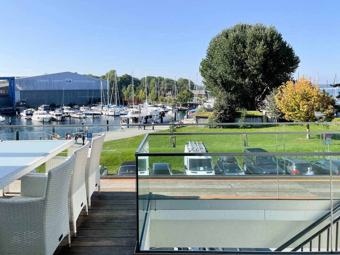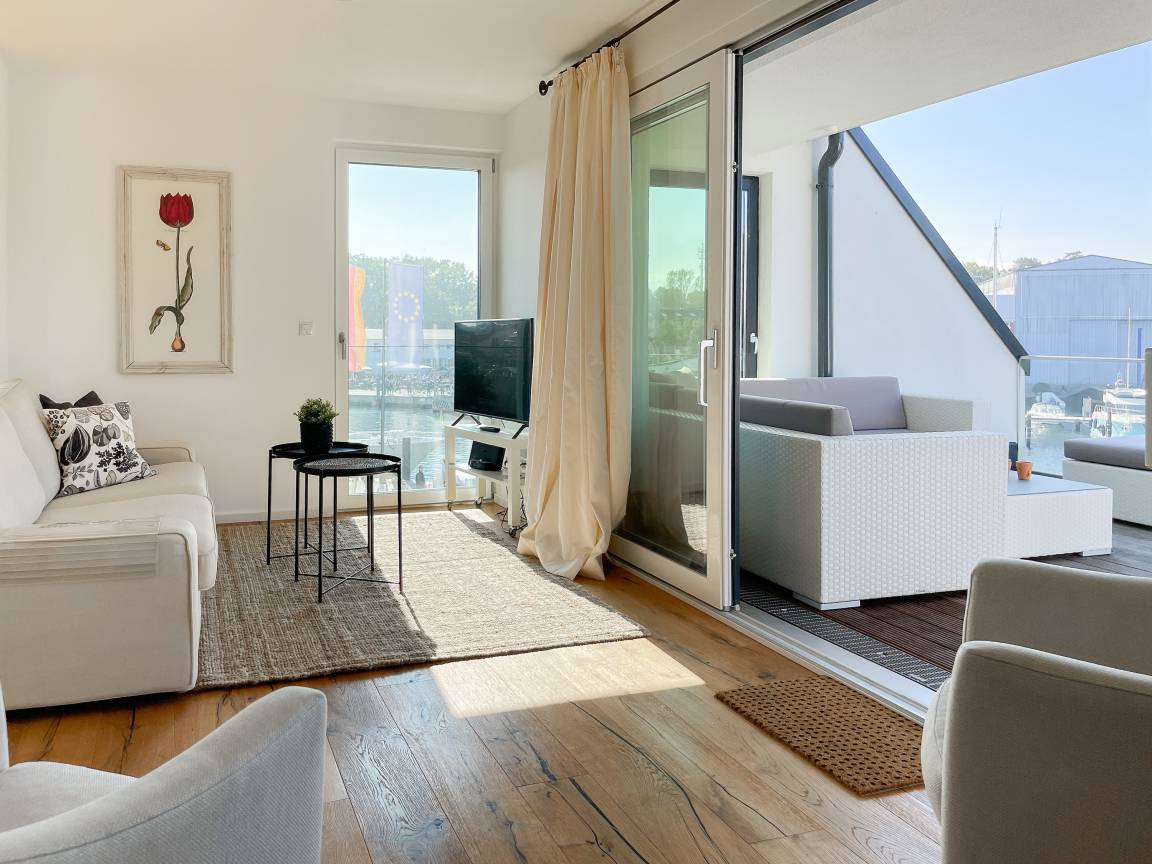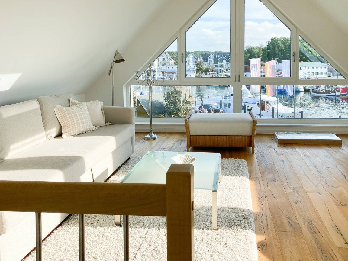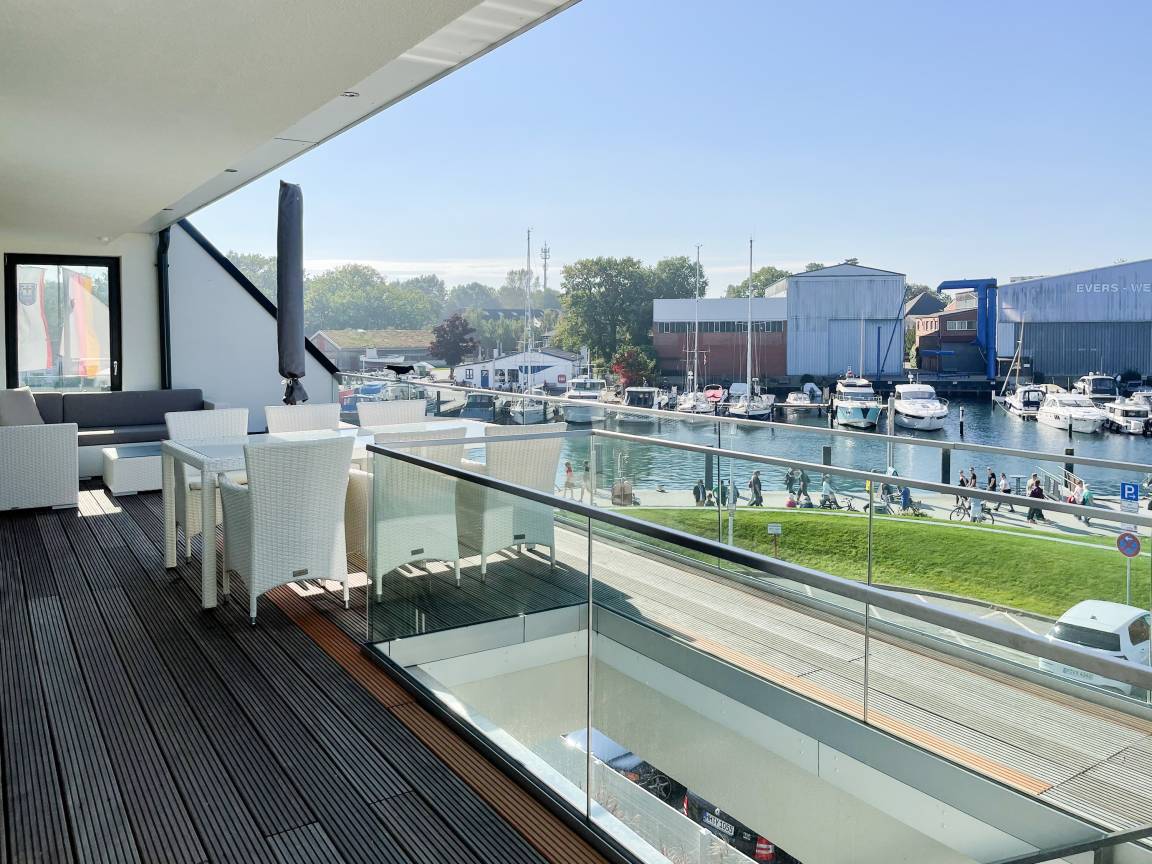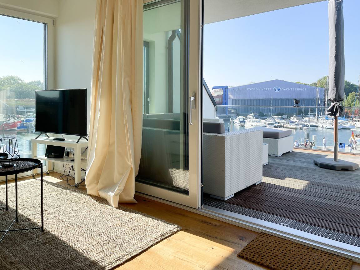Das einzigartige Penthouse erstreckt sich über 2 Ebenen und liegt im 2. Obergeschoss eines modernen Neubaus mit nur 3 Wohneinheiten. Auf 130 qm Wohnfläche mit 2 Schlafzimmern, 2 separaten Bädern und 2 Wohnbereichen können 4 Personen einen entspannten Urlaub verleben. Auf der unteren Wohnebene erwartet Sie ein Schlafzimmer mit Doppelbett, Verdunkelungsplissees und Ostseeblick, ein Duschbad sowie ein offener Wohn- Essbereich, TV und eine integrierte moderne Einbauküche. Bodentiefe[nbsp] Fensterelemente bieten einem phantastischen Ausblick auf die Ostsee und die ein- und ausfahrenden Schiffe vom Fischkutter bis zur Motoryacht.[nbsp] Echtholzböden und Fußbodenheizung sorgen für ein angenehmes Raumklima. Die sehr großzügig angelegte Dachterrasse vor dem Wohnbereich ist mit einer Gartenlounge und einem Essbereich ausgestattet. Genießen Sie viele Sonnenstunden, die einzigartige Hafenatmosphäre und beeindruckende Sonnenuntergänge bei einem Glas Wein. Vor dem Essbereich befindet sich eine weitere Dachterrasse mit Bistrotisch und 2 Stühlen, um die ersten Sonnenstrahlen mit Ostseeblick bei einem Morgenkaffee zu genießen. Die zweite Wohnebene ist über eine schmale recht steile Raumspartreppe zu erreichen. Hier erwartet Sie ein weiterer Wohnbereich mit traumhaftem Blick auf den Hafen und das zweite Schlafzimmer mit TV, Ostseeblick und Verdunkelungsplissees, ebenfalls mit Doppelbett (160x200) sowie ein weiteres Duschbad.
