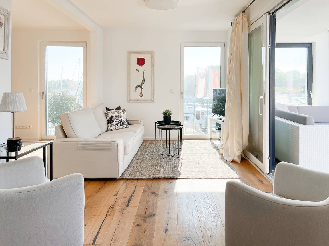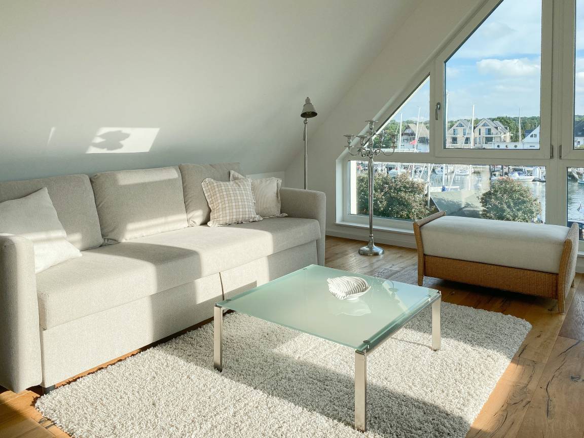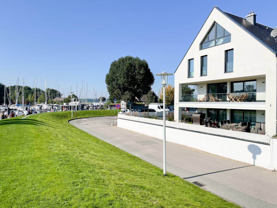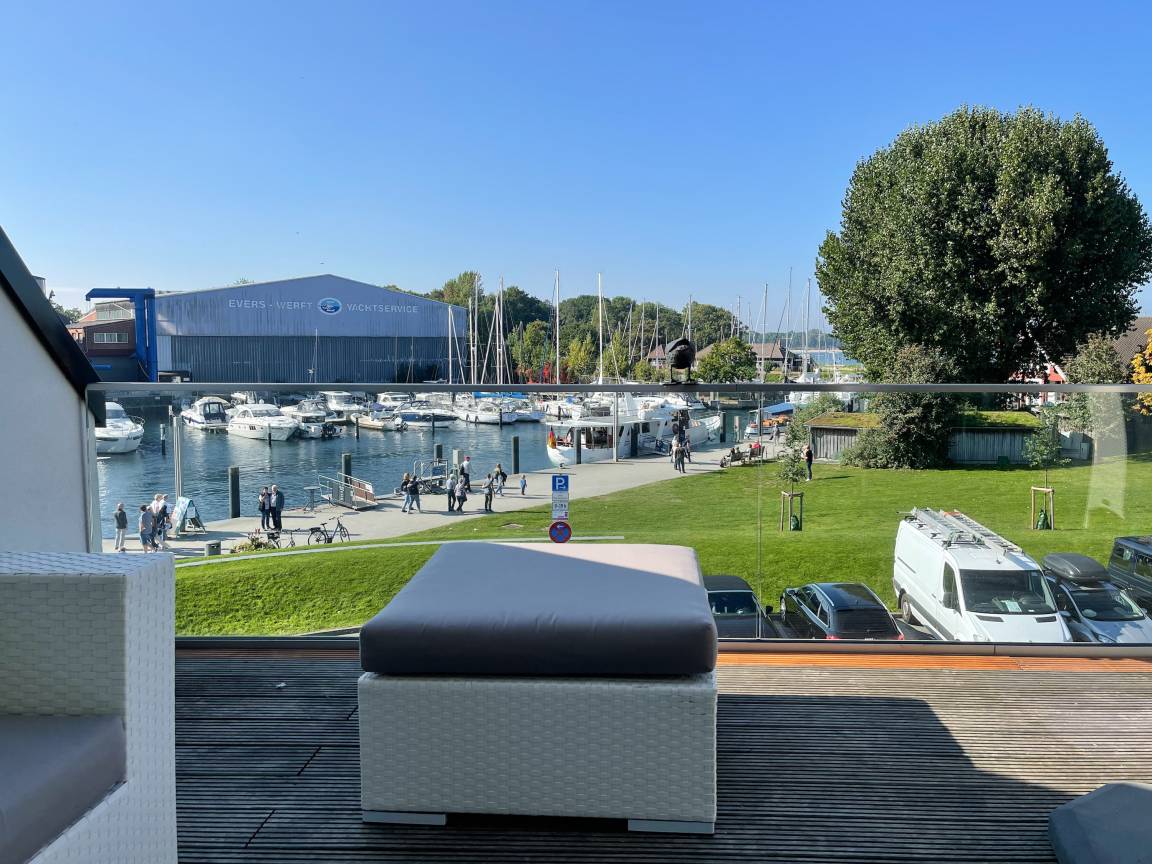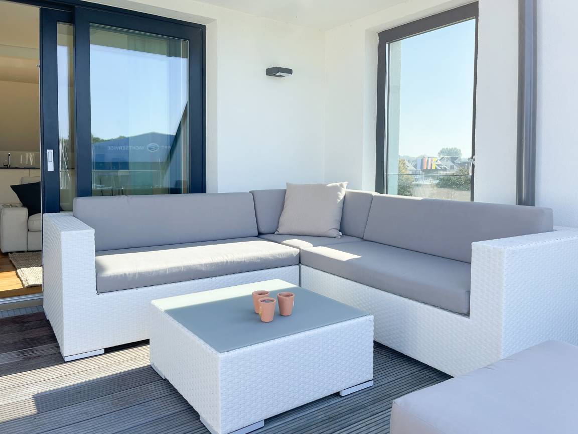 Das einzigartige Penthouse erstreckt sich über 2 Ebenen und liegt im 2. Obergeschoss eines modernen Neubaus mit nur 3 Wohneinheiten. Auf 130 qm Wohnfläche mit 2 Schlafzimmern, 2 separaten Bädern und 2 Wohnbereichen können 4 Personen einen entspannten Urlaub verleben. Auf der unteren Wohnebene erwartet Sie ein Schlafzimmer mit Doppelbett, Verdunkelungsplissees und Ostseeblick, ein Duschbad sowie ein offener Wohn- Essbereich, TV und eine integrierte moderne Einbauküche. Bodentiefe[nbsp] Fensterelemente bieten einem phantastischen Ausblick auf die Ostsee und die ein- und ausfahrenden Schiffe vom Fischkutter bis zur Motoryacht.[nbsp] Echtholzböden und Fußbodenheizung sorgen für ein angenehmes Raumklima. Die sehr großzügig angelegte Dachterrasse vor dem Wohnbereich ist mit einer Gartenlounge und einem Essbereich ausgestattet. Genießen Sie viele Sonnenstunden, die einzigartige Hafenatmosphäre und beeindruckende Sonnenuntergänge bei einem Glas Wein. Vor dem Essbereich befindet sich eine weitere Dachterrasse mit Bistrotisch und 2 Stühlen, um die ersten Sonnenstrahlen mit Ostseeblick bei einem Morgenkaffee zu genießen. Die zweite Wohnebene ist über eine schmale recht steile Raumspartreppe zu erreichen. Hier erwartet Sie ein weiterer Wohnbereich mit traumhaftem Blick auf den Hafen und das zweite Schlafzimmer mit TV, Ostseeblick und Verdunkelungsplissees, ebenfalls mit Doppelbett (160x200) sowie ein weiteres Duschbad.