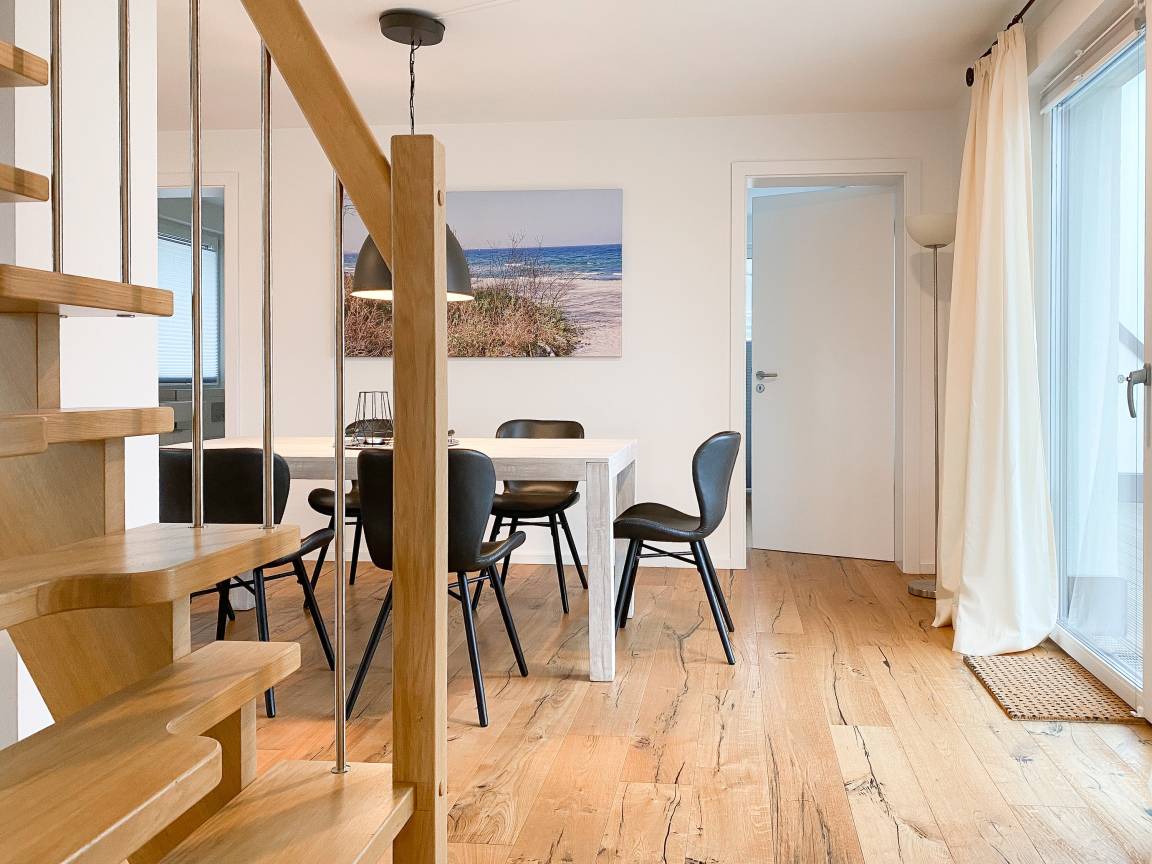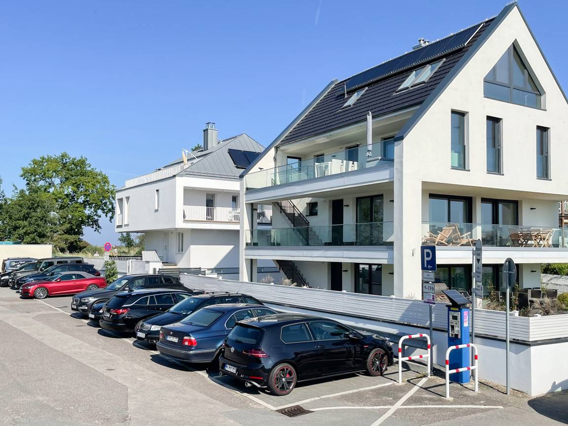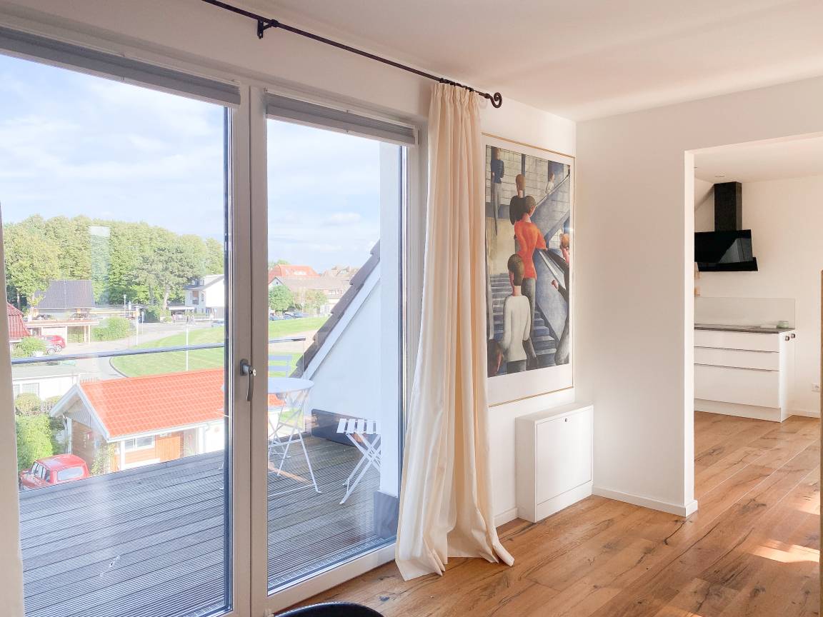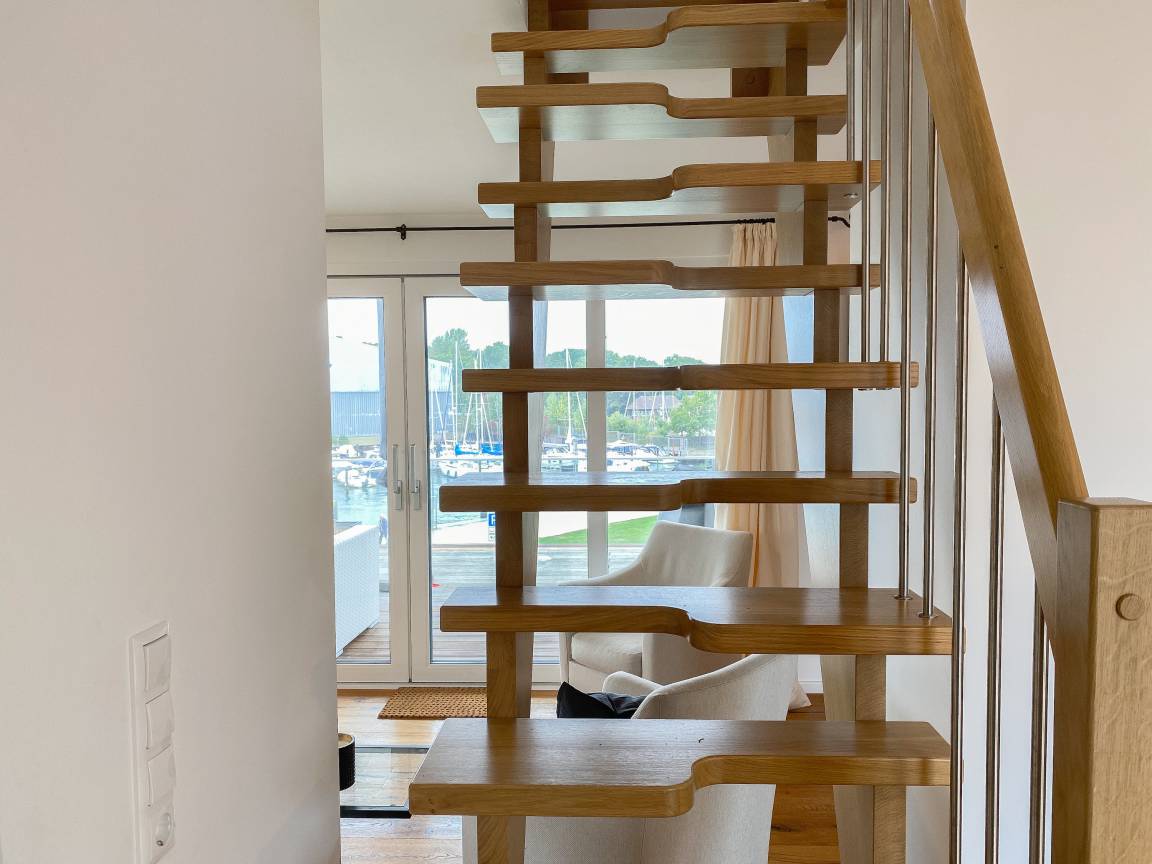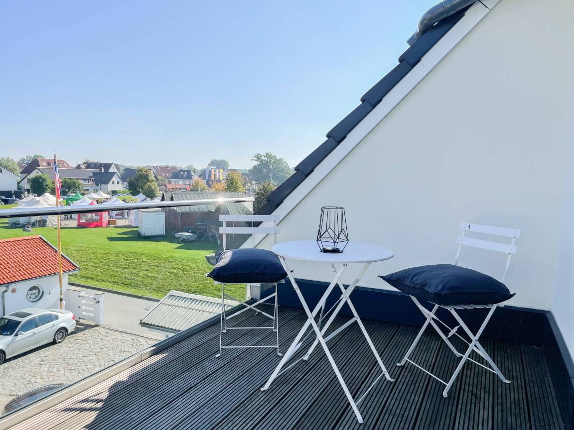 Das einzigartige Penthouse erstreckt sich über 2 Ebenen und liegt im 2. Obergeschoss eines modernen Neubaus mit nur 3 Wohneinheiten. Auf 130 qm Wohnfläche mit 2 Schlafzimmern, 2 separaten Bädern und 2 Wohnbereichen können 4 Personen einen entspannten Urlaub verleben. Auf der unteren Wohnebene erwartet Sie ein Schlafzimmer mit Doppelbett, Verdunkelungsplissees und Ostseeblick, ein Duschbad sowie ein offener Wohn- Essbereich, TV und eine integrierte moderne Einbauküche. Bodentiefe[nbsp] Fensterelemente bieten einem phantastischen Ausblick auf die Ostsee und die ein- und ausfahrenden Schiffe vom Fischkutter bis zur Motoryacht.[nbsp] Echtholzböden und Fußbodenheizung sorgen für ein angenehmes Raumklima. Die sehr großzügig angelegte Dachterrasse vor dem Wohnbereich ist mit einer Gartenlounge und einem Essbereich ausgestattet. Genießen Sie viele Sonnenstunden, die einzigartige Hafenatmosphäre und beeindruckende Sonnenuntergänge bei einem Glas Wein. Vor dem Essbereich befindet sich eine weitere Dachterrasse mit Bistrotisch und 2 Stühlen, um die ersten Sonnenstrahlen mit Ostseeblick bei einem Morgenkaffee zu genießen. Die zweite Wohnebene ist über eine schmale recht steile Raumspartreppe zu erreichen. Hier erwartet Sie ein weiterer Wohnbereich mit traumhaftem Blick auf den Hafen und das zweite Schlafzimmer mit TV, Ostseeblick und Verdunkelungsplissees, ebenfalls mit Doppelbett (160x200) sowie ein weiteres Duschbad.