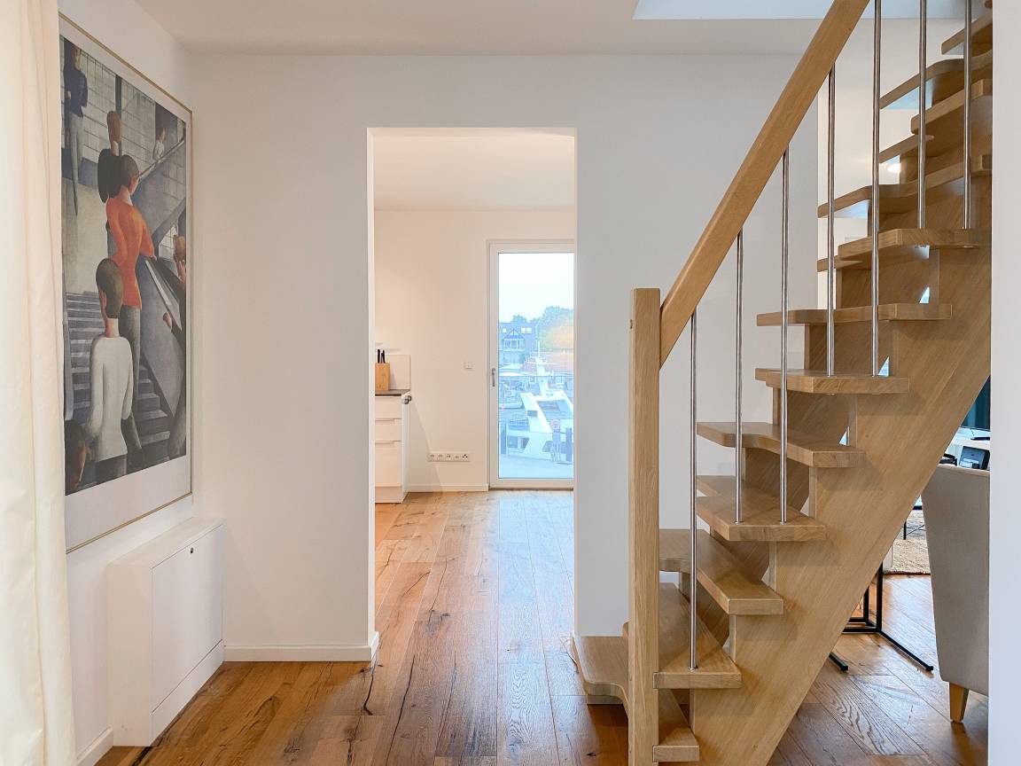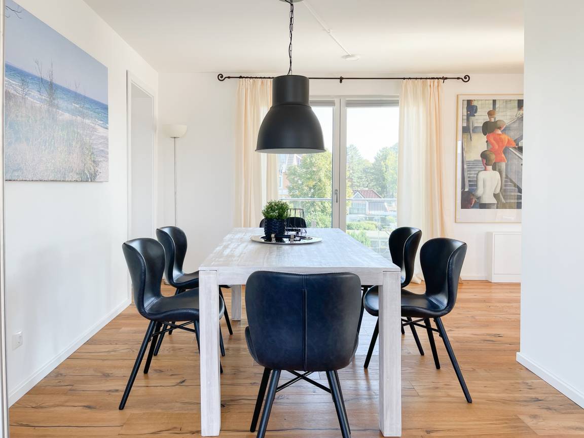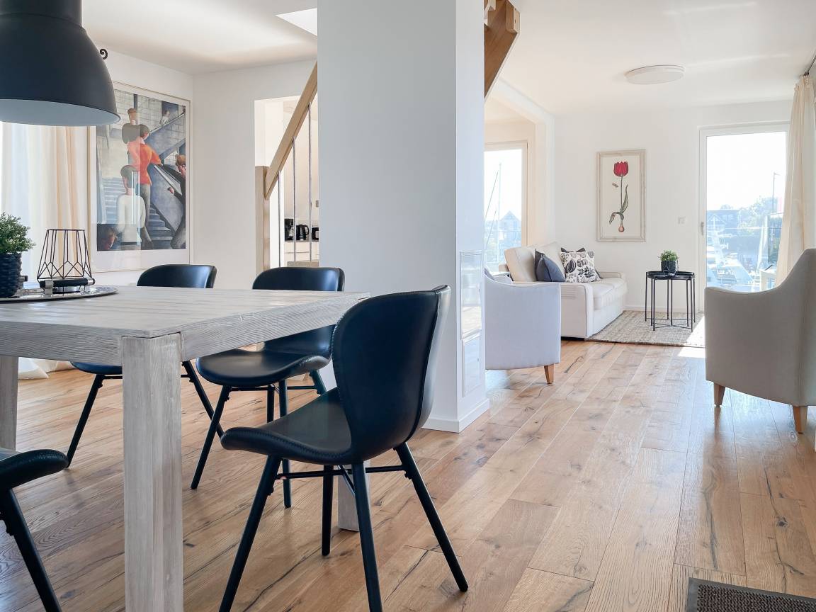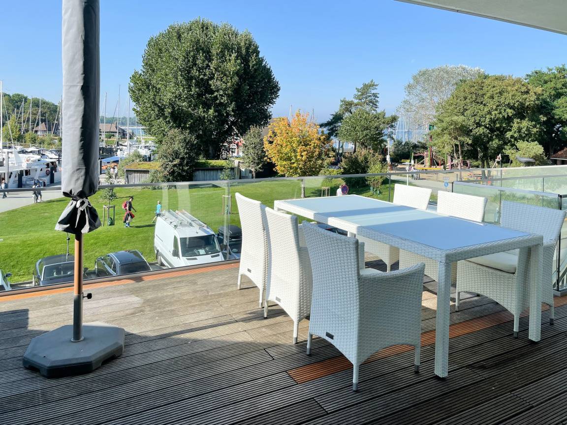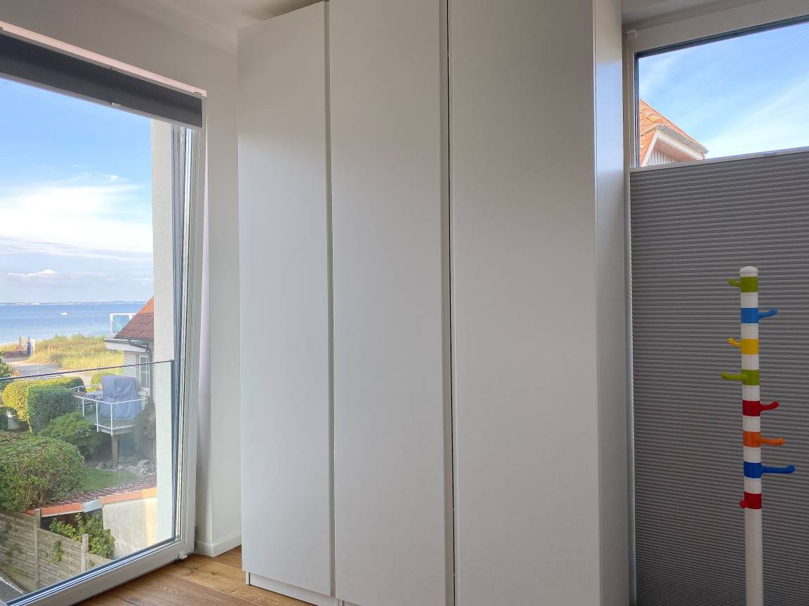 Das einzigartige Penthouse erstreckt sich über 2 Ebenen und liegt im 2. Obergeschoss eines modernen Neubaus mit nur 3 Wohneinheiten. Auf 130 qm Wohnfläche mit 2 Schlafzimmern, 2 separaten Bädern und 2 Wohnbereichen können 4 Personen einen entspannten Urlaub verleben. Auf der unteren Wohnebene erwartet Sie ein Schlafzimmer mit Doppelbett, Verdunkelungsplissees und Ostseeblick, ein Duschbad sowie ein offener Wohn- Essbereich, TV und eine integrierte moderne Einbauküche. Bodentiefe[nbsp] Fensterelemente bieten einem phantastischen Ausblick auf die Ostsee und die ein- und ausfahrenden Schiffe vom Fischkutter bis zur Motoryacht.[nbsp] Echtholzböden und Fußbodenheizung sorgen für ein angenehmes Raumklima. Die sehr großzügig angelegte Dachterrasse vor dem Wohnbereich ist mit einer Gartenlounge und einem Essbereich ausgestattet. Genießen Sie viele Sonnenstunden, die einzigartige Hafenatmosphäre und beeindruckende Sonnenuntergänge bei einem Glas Wein. Vor dem Essbereich befindet sich eine weitere Dachterrasse mit Bistrotisch und 2 Stühlen, um die ersten Sonnenstrahlen mit Ostseeblick bei einem Morgenkaffee zu genießen. Die zweite Wohnebene ist über eine schmale recht steile Raumspartreppe zu erreichen. Hier erwartet Sie ein weiterer Wohnbereich mit traumhaftem Blick auf den Hafen und das zweite Schlafzimmer mit TV, Ostseeblick und Verdunkelungsplissees, ebenfalls mit Doppelbett (160x200) sowie ein weiteres Duschbad.