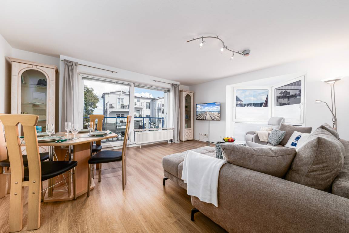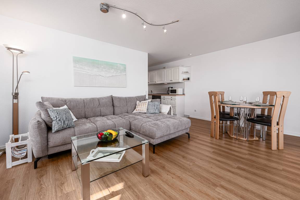 Es erwartet Sie ein großer und lichtdurchfluteter Wohnraum mit bequemer Schlafcouch, einem Essbereich und integrierter Einbauküche, der sich besonders gut für gemeinsame Kochsession's eignet. Des Weiteren steht für Sie ein Smart-TV mit integriertem Radio für Sie zur Nutzung bereit.