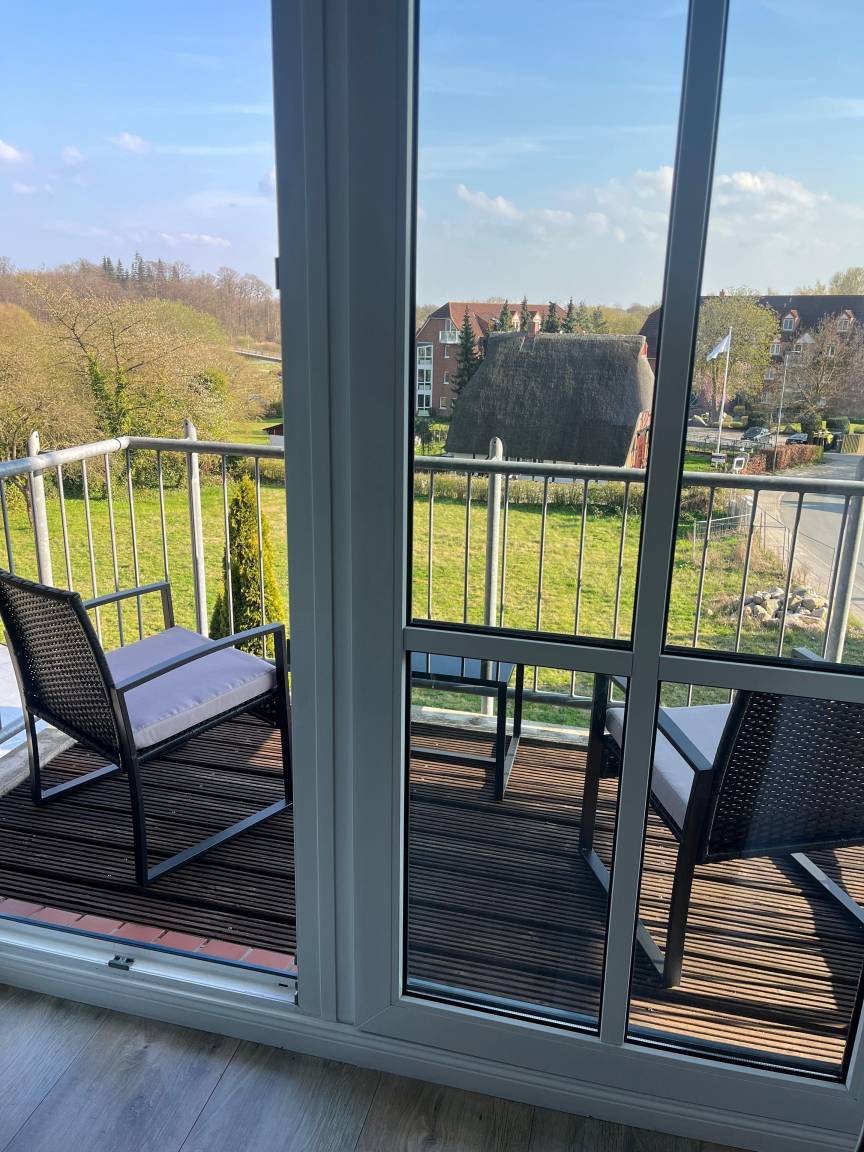 Der Balkon bietet einen angenehmen Platz für eine kurze Auszeit an der frischen Luft. Mit den bereitstehenden Balkonmöbeln und Auflagen kannst du hier entspannt ins Grüne blicken – ideal für einen Kaffee am Morgen oder einen ruhigen Moment zwischendurch.