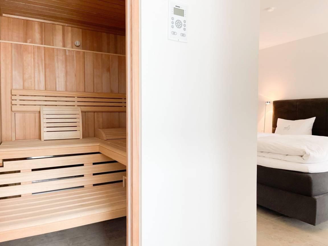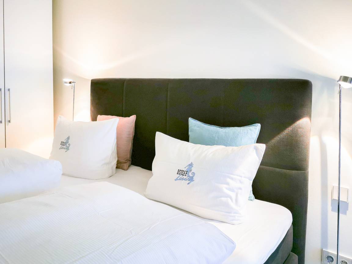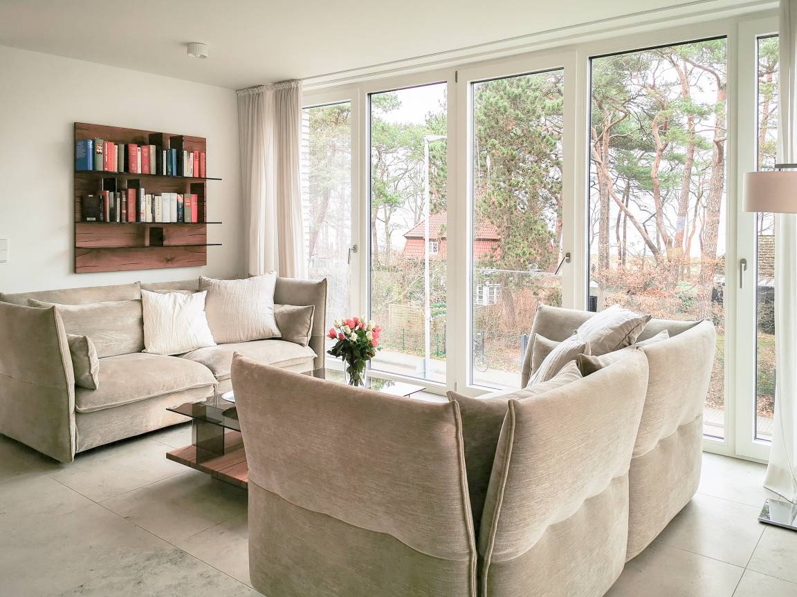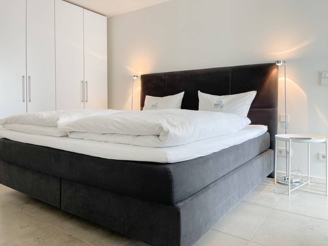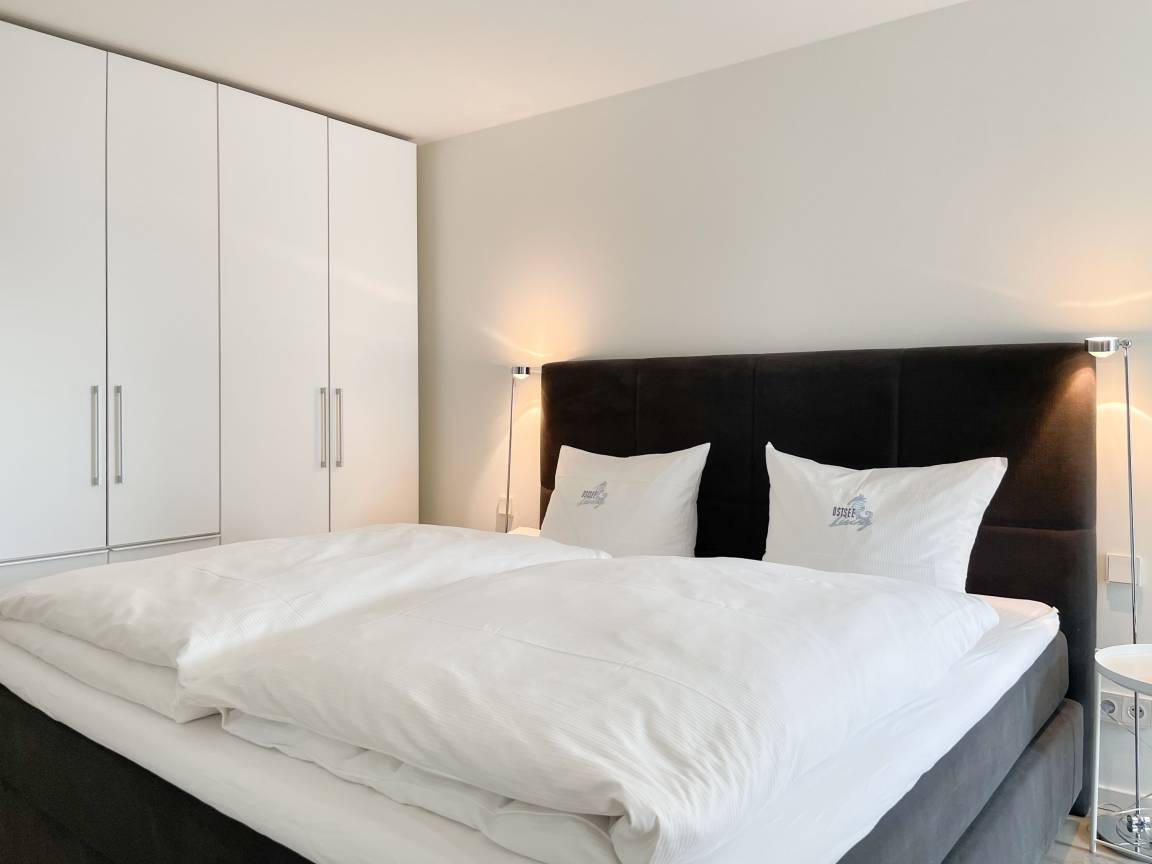 Das großzügige, lichtdurchflutete Wohnzimmer bietet einen herrlichen Ausblick, teilweise bis auf die Ostsee. Hier können Sie schöne Stunden mit Ihrer Familie verbringen und[nbsp] ein Kamin sorgt für behagliche Stunden am warmen Feuer. Die sehr hochwertige und offen gestaltete bulthaup Markenküche fügt sich harmonisch in das Gesamtbild der Wohnung ein und bietet ebenfalls einen schönen Ostseeblick. Sie ist mit einem Esstresen und Barhockern ausgestattet, an dem 6 Personen bequem Platz finden. Das Master Schlafzimmer, eingerichtet mit einem Boxspringbett (180x200), TV und Verdunkelungsvorhängen, lässt Sie nach einem schönen Urlaubstag perfekt zur Ruhe kommen. Ein großer Kleiderschrank hält genügend Möglichkeiten für Sie bereit, Ihre Urlaubsgarderobe unterzubringen. Von hier haben Sie direkten Zugang zu einem Badezimmer der Extraklasse. Die Natursteinfliesen und die helle Ausstattung des Bades sorgen für eine ausgesprochene Wohlfühlatmosphäre. Für absolute Entspannung sorgt die integrierte Sauna, die Sie natürlich kostenfrei nutzen können. Zwei weitere Schlafzimmer sind mit je einem kleinen Kleiderschrank, Verdunkelungsvorhängen und einem Boxspringbett eingerichtet.[nbsp] Selbstverständlich gehören drei TV und WLAN zum Entertainment-Paket.