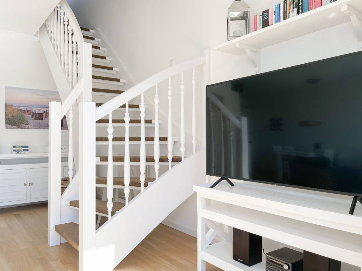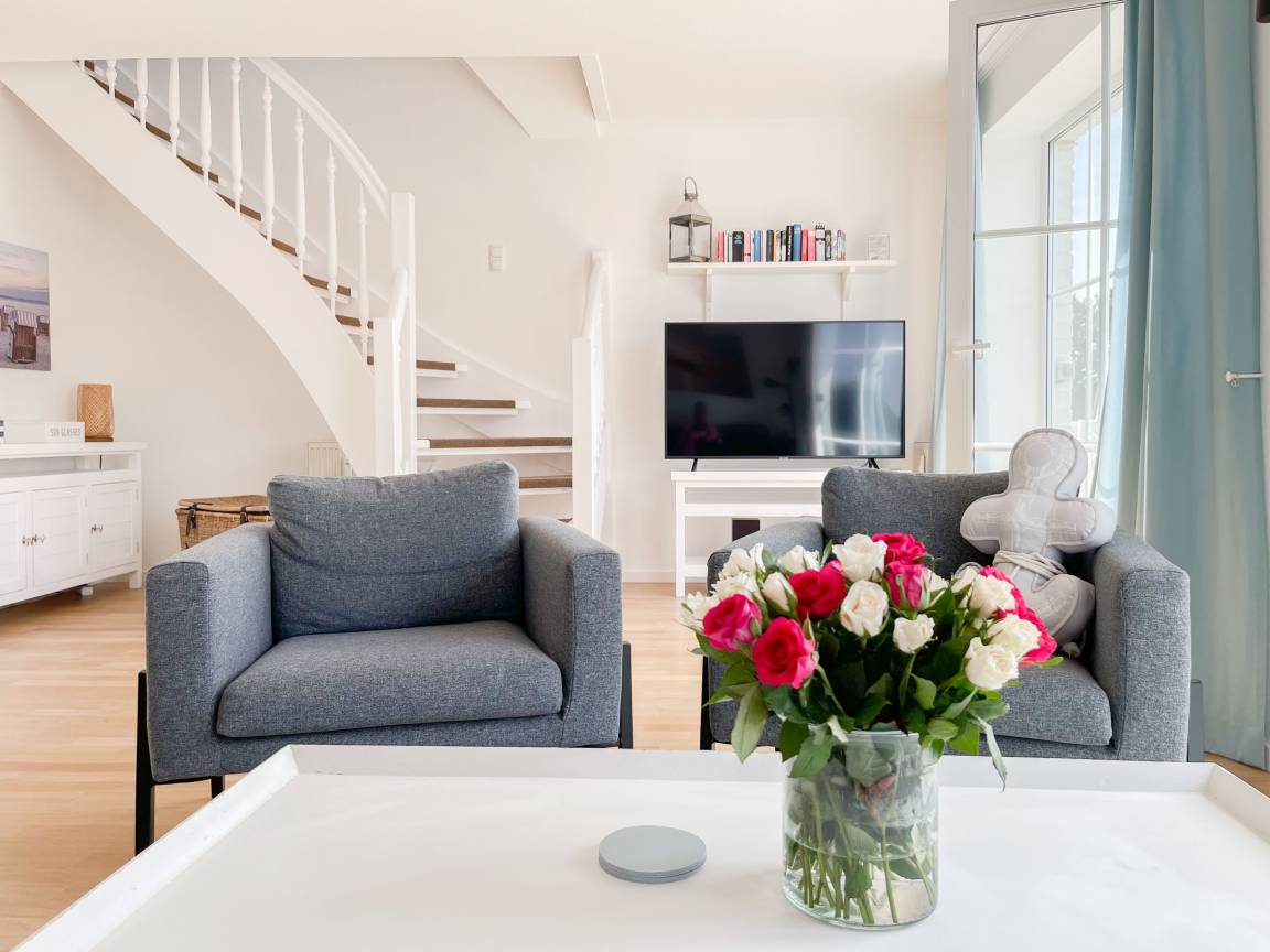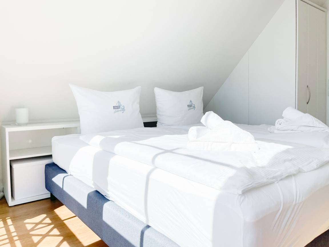 Die Ferienwohnung Ankerplatz[nbsp] liegt[nbsp] in der 2. Etage im Haus Sonnenpark und erstreckt sich über 2 Wohnebenen bis ins Dachgeschoss. Ein herrlicher Sonnenbalkon, ausgestattet mit Gartenmöbeln und einer elektrischen Markise, verläuft über den[nbsp] gesamten Wohnbereich und bietet einen tollen Rückzugsort bis zum letzten Sonnenstrahl. Die frisch renovierte Wohnung verfügt über ein gelungenes Raumkonzept mit neuer Küche, neuem Duschbad und Gäste WC. Die Ausstattung ist hochwertig und bietet 4 Personen ausreichend Raum zum Wohlfühlen in Strandnähe. Es erwartet Sie ein heller, großzügiger Wohnraum mit bodentiefen Fensterflächen, geschmackvoll gestaltet und mit einem komfortablen Sofa und zwei Sesseln eingerichtet, TV, Hifi-Anlage und ein Essbereich mit ausreichend Platz für 4 Personen. WLAN steht selbstverständlich zur kostenlosen Nutzung zur Verfügung. Die integrierte Küche ist bestens ausgestattet, unter anderem mit Spülmaschine, Backofen, Nespressomaschine und vielem mehr. Im Eingangsbereich befindet sich eine Garderobe und ein separates Gäste WC. Auf der oberen Ebene, die über eine Treppe vom Wohnbereich zu erreichen ist, bietet die Wohnung zwei separate Schlafzimmer mit Doppelbetten (180x200), Kleiderschränken und Verdunkelungsvorhängen sowie ein äußerst großzügiges, modernes Duschbad mit einem Doppelwaschtisch und viel Tageslicht. Schlafzimmer 1 verfügt zusätzlich über einen TV und Schlafzimmer 2 über einen Schreibtisch und das Bett besteht aus 2 Einzelbetten, die beliebig zusammengeschoben oder getrennt genutzt werden können.