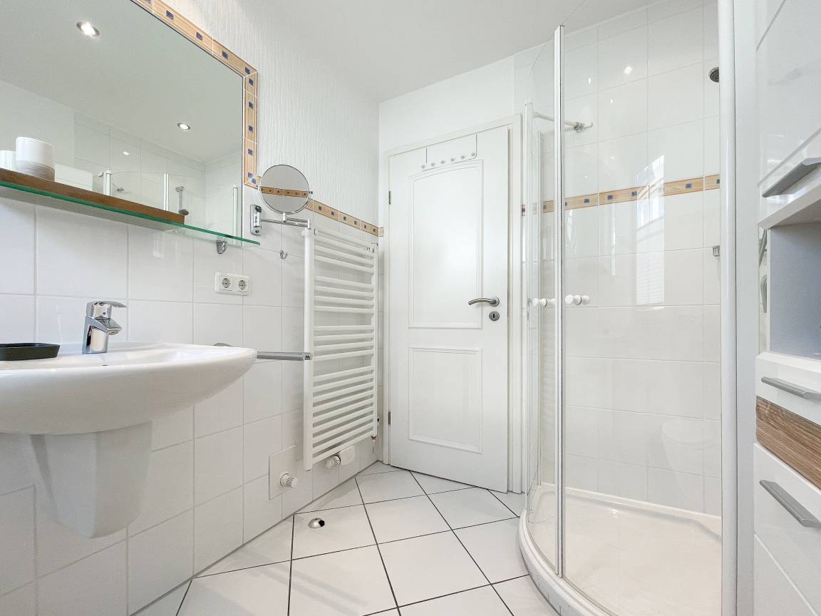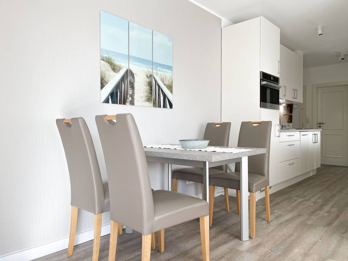 Es erwartet Sie eine gepflegte Ferienwohnung mit zwei separaten Schlafzimmern, die mit Doppelbetten (180x200 und 140x200) und Verdunkelungsvorhängen ausgestattet sind und ein helles Duschbad mit Fenster und Handtuchwärmer. Das Wohnzimmer ist komfortabel mit einer Couchgarnitur und einer integrierten Essecke für 4 Personen eingerichtet. TV, Hifi Anlage und kostenloses WLAN stehen zur Verfügung. Die offene Einbauküche ist gut ausgestattet. Dank großer Fensterflächen sind die Räumlichkeiten hell und freundlich. Als idealer Rückzugsort[nbsp][nbsp]während eines entspannten Urlaubs eignet sich die großzügige, umlaufende Sonnenterrasse in Südausrichtung. Das Haus verfügt selbstverständlich über einen Aufzug. Zur Wohnung gehört ein Stellplatz auf dem Grundstück. Ein Fahrradständer ist vorhanden.