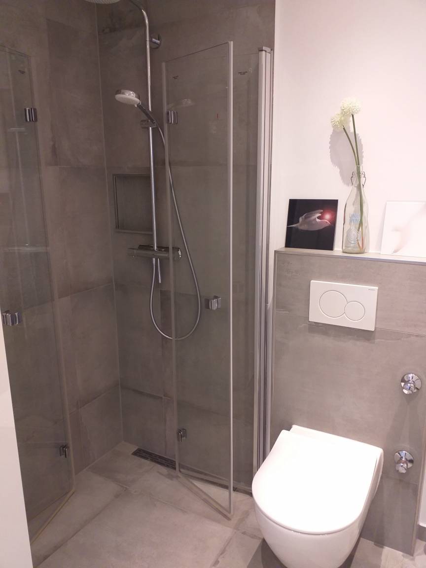 Das hochwertige Badezimmer ist sehr hell eingerichtet und wurde mit einer begehbaren Dusche, WC und genügend Stauraum ausgestattet. Natürlich ist ein Haartrockner vorhanden.