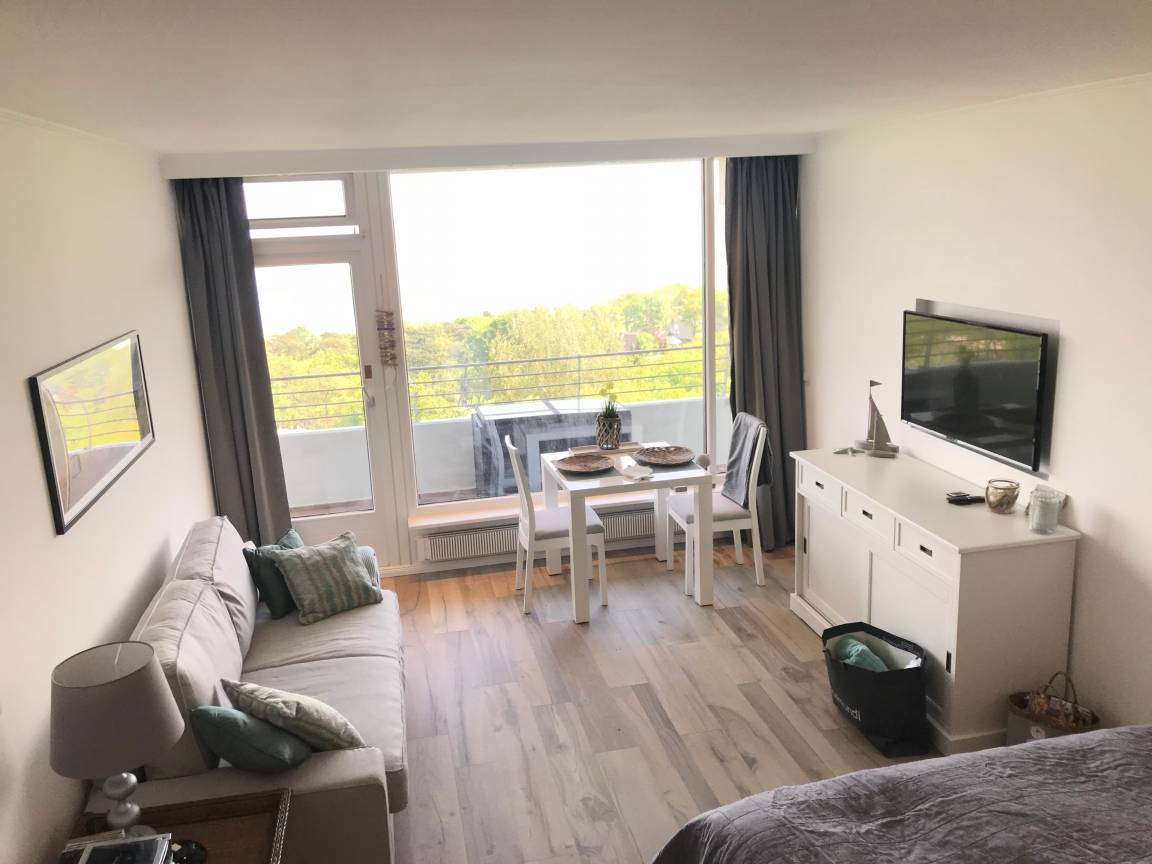Dieses stilvolle, neu renovierte Einzimmer-Appartement befindet sich im 06. Stock. Durch die Nähe des Strandes wird Ihnen ein wunderschöner Blick auf die Ostsee geboten. Der Balkon ist mit Stühlen und einem Tisch ausgestattet. Zu der Wohnung gehört ein Stellplatz in der Tiefgarage (Maximale Höhe 1,90m, normale Autobreite).