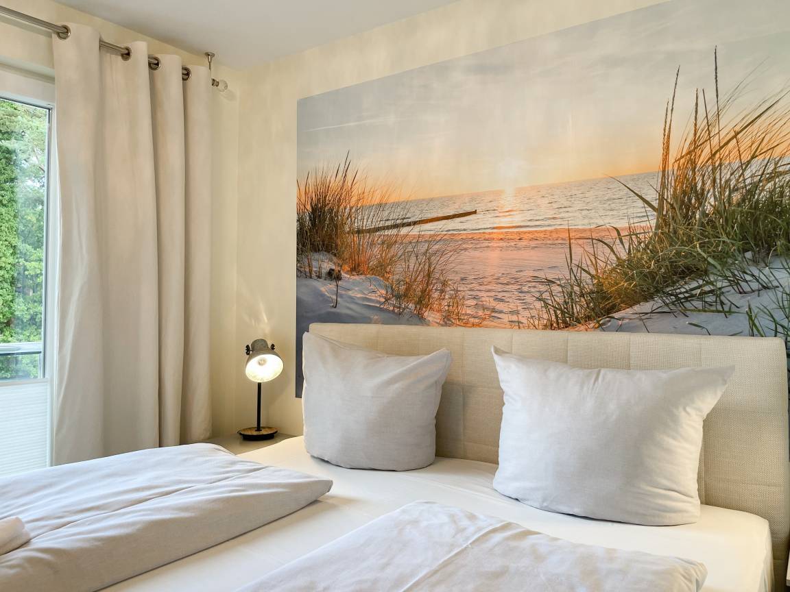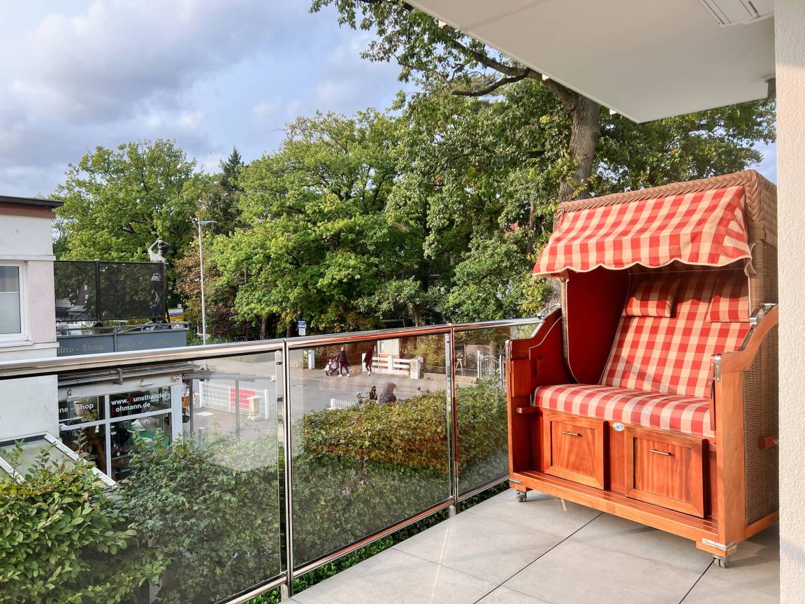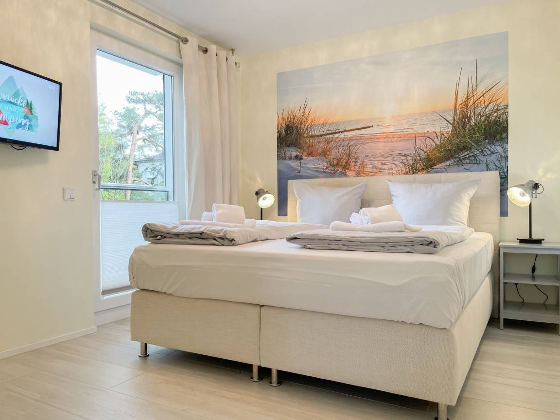 Es erwartet Sie ein heller Wohnbereich zur Seeseite, der mit einem bequemen Boxspring-Sofa mit Schlaffunktion, Smart TV und einem gemütlichen Cocktail-Sessel eingerichtet ist. Genießen Sie den schönen Ausblick bis auf die Ostsee, die durch die Bäume blitzt. Die hochwertige Küche in perfekter Ausstattung läßt definitiv keine Wünsche offen. Das Bora-Kochfeld sorgt für geruchs- und dunstfreies Kochvergnügen und die Kühl-Gefrierkombination bietet ausreichend Platz für Ihre Leckereien. Umluftbackofen und Geschirrspüler befinden sich angenehm auf Armhöhe. Der anschließende Essbereich mit gemütlichen Sesseln bietet ausreichend Raum für gemeinsame Mahlzeiten. Ein Highlight ist der 14 qm große Balkon mit windgeschützter Loggia in Nordwestausrichtung, der sowohl vom Wohnbereich als auch von der Küche zu betreten ist. Ein Strandkorb und Gartenmöbel laden nach einem ereignisreichen Urlaubstag zum Entspannen ein. Genießen Sie die Nachmittagssonne bis zum Sonnenuntergang mit schönem Blick teilweise bis zur Ostsee. Das Schlafzimmer verfügt über ein Boxspringbett (180x200), einen Kleiderschrank mit reichlich Stauraum und Smart TV. Das neue Luxusbad bietet Ihnen eine Waschtischanlage mit 2 Waschplätzen und die großzügige Dusche verfügt über einen Regen- und eine verstellbare Funktions-Handbrause. Direkt am Eingang der Dusche ist ein Handtuchwärmer angebracht, der für kuschelig warme Badetücher sorgt. Eine Waschmaschine ist ebenfalls im Bad untergebracht.