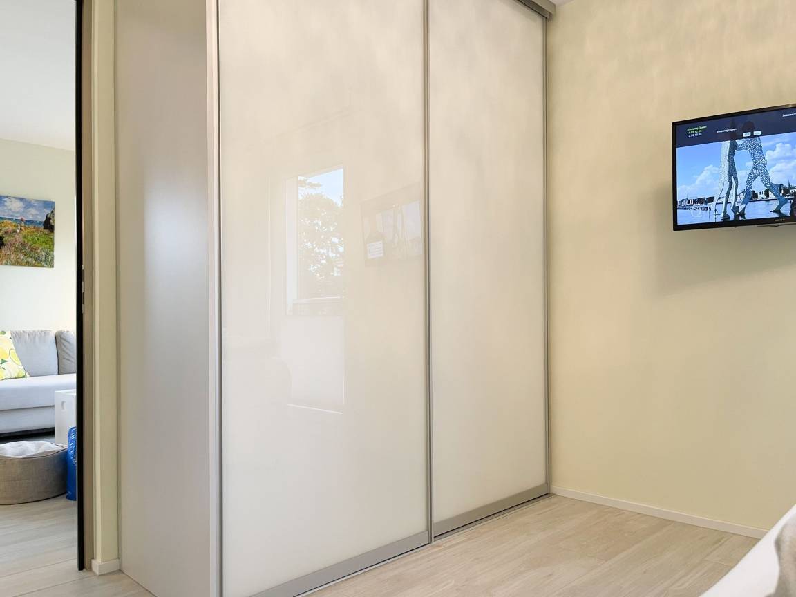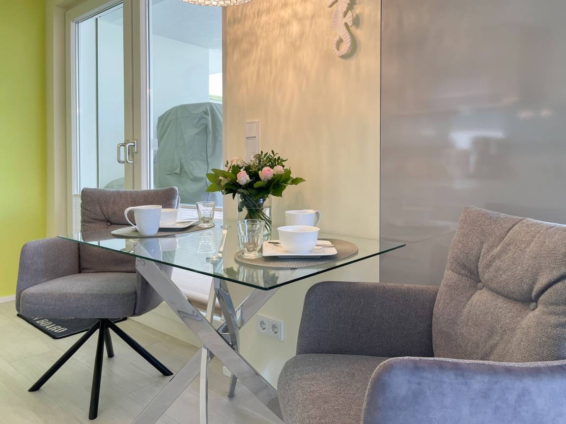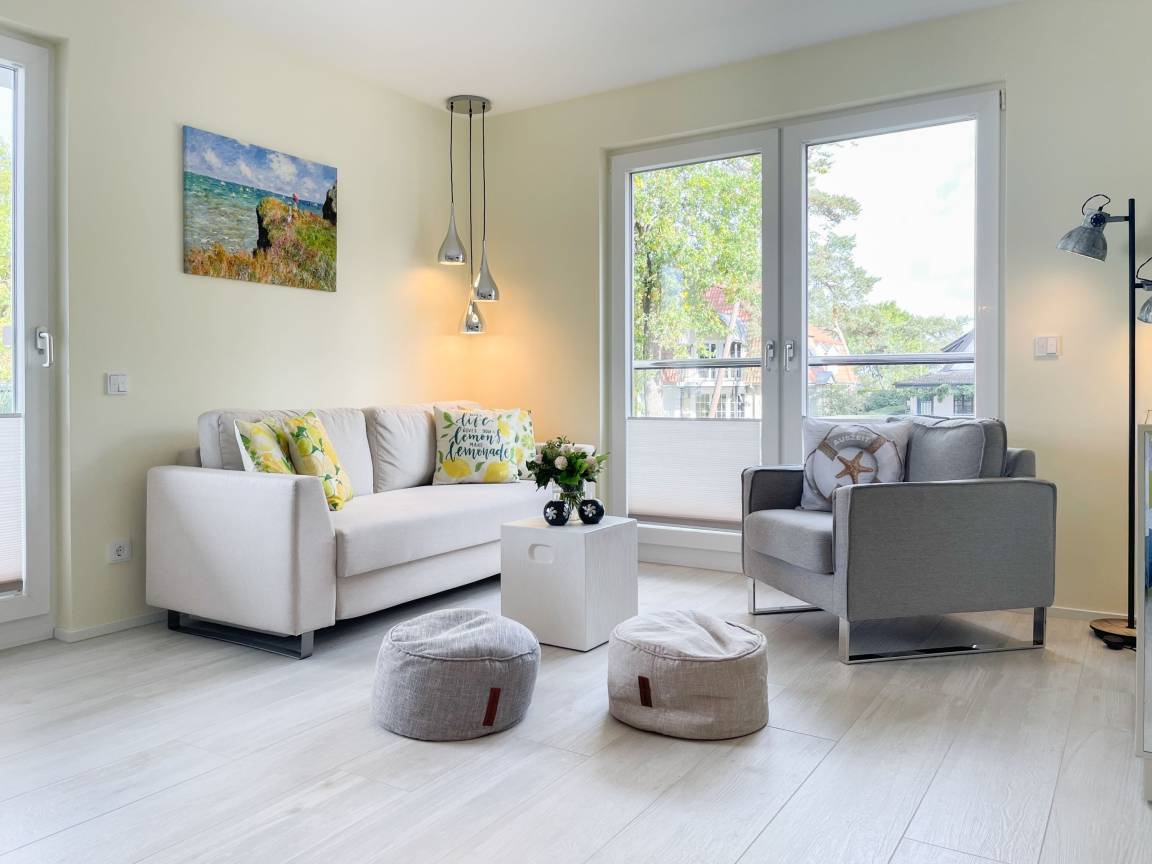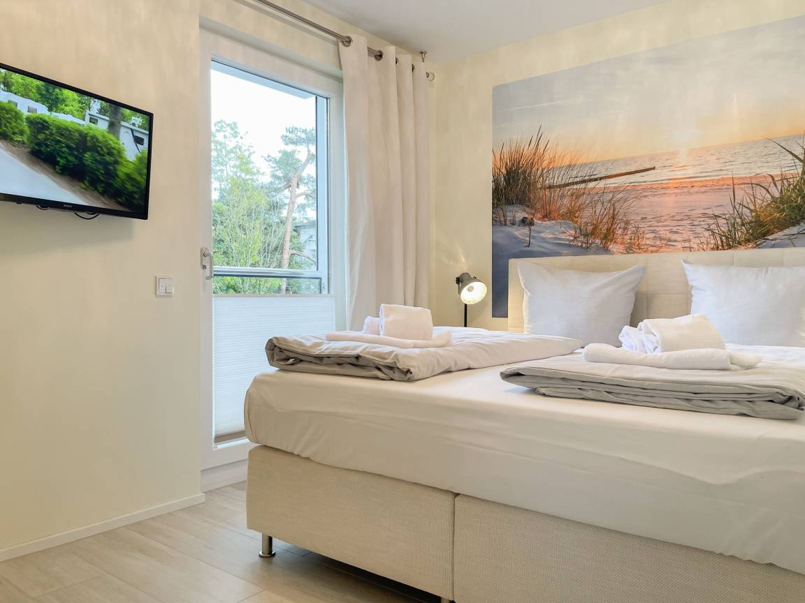 Es erwartet Sie ein heller Wohnbereich zur Seeseite, der mit einem bequemen Boxspring-Sofa mit Schlaffunktion, Smart TV und einem gemütlichen Cocktail-Sessel eingerichtet ist. Genießen Sie den schönen Ausblick bis auf die Ostsee, die durch die Bäume blitzt. Die hochwertige Küche in perfekter Ausstattung läßt definitiv keine Wünsche offen. Das Bora-Kochfeld sorgt für geruchs- und dunstfreies Kochvergnügen und die Kühl-Gefrierkombination bietet ausreichend Platz für Ihre Leckereien. Umluftbackofen und Geschirrspüler befinden sich angenehm auf Armhöhe. Der anschließende Essbereich mit gemütlichen Sesseln bietet ausreichend Raum für gemeinsame Mahlzeiten. Ein Highlight ist der 14 qm große Balkon mit windgeschützter Loggia in Nordwestausrichtung, der sowohl vom Wohnbereich als auch von der Küche zu betreten ist. Ein Strandkorb und Gartenmöbel laden nach einem ereignisreichen Urlaubstag zum Entspannen ein. Genießen Sie die Nachmittagssonne bis zum Sonnenuntergang mit schönem Blick teilweise bis zur Ostsee. Das Schlafzimmer verfügt über ein Boxspringbett (180x200), einen Kleiderschrank mit reichlich Stauraum und Smart TV. Das neue Luxusbad bietet Ihnen eine Waschtischanlage mit 2 Waschplätzen und die großzügige Dusche verfügt über einen Regen- und eine verstellbare Funktions-Handbrause. Direkt am Eingang der Dusche ist ein Handtuchwärmer angebracht, der für kuschelig warme Badetücher sorgt. Eine Waschmaschine ist ebenfalls im Bad untergebracht.