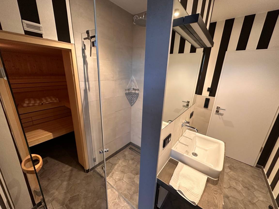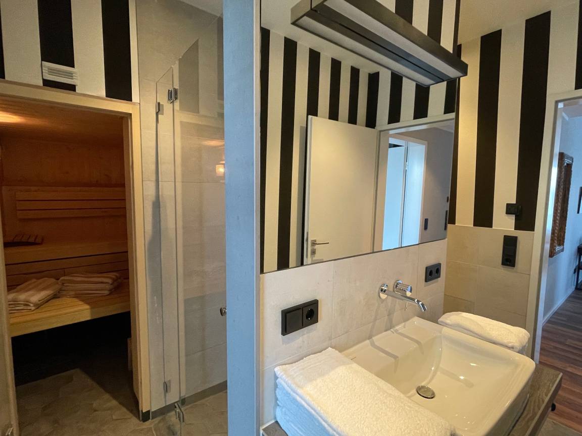 Sie betreten unsere Albatros durch einen Flur mit einer großzügigen Garderobe mit Sitzgelegenheit. Vom Flur gehen das Wohnzimmer, das Schlafzimmer, das Badezimmer und ein separates Gäste-WC ab. Im Wohnbereich befindet sich eine vollausgestattete Einbauküche mit Essbereich für vier Personen, ein kuscheliges Hussensofa, zwei Sessel und ein Flachbild-TV. Vom Wohnzimmer aus kommen Sie auf den Balkon mit unmittelbarem Blick auf den Niendorfer Hafen, auf dem Sie ein kleiner Tisch, Stühle und gemütliche Lounger erwarten. Hier können Sie den ersten Kaffee des Tages oder am Abend einen erfrischenden Sundowner genießen. Das Schlafzimmer verfügt über ein gemütliches Boxspringbett, zwei große Kleiderschränke mit einem Zimmersafe und einen Flachbild-TV. Entschleunigen können Sie im separaten Badezimmer mit integriertem Internet-Radio, Regendusche und als Highlight einer eigenen finnischen Sauna von Klafs. Die hochwertige Einrichtung umfasst u. a. Möbel von Riviera Maison. Das Boxspringbett könnte ungeeignet sein für Personen mit einem sehr festen Liegegefühl.
