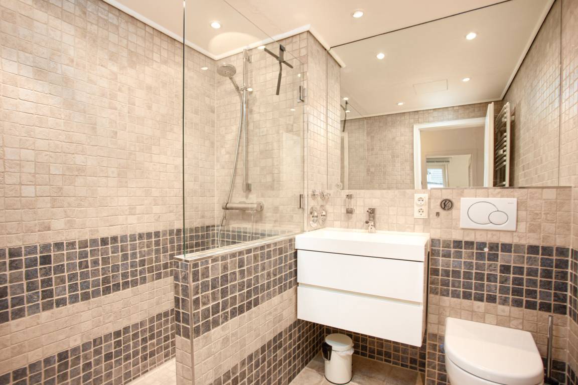 Das mediterran eingerichtete Badezimmer verfügt über eine bodengleiche Dusche, WC, Föhn und einer Handtuchtrocknerheizung. Hier erfrischen Sie sich nach einem entspannten Tag am Strand.