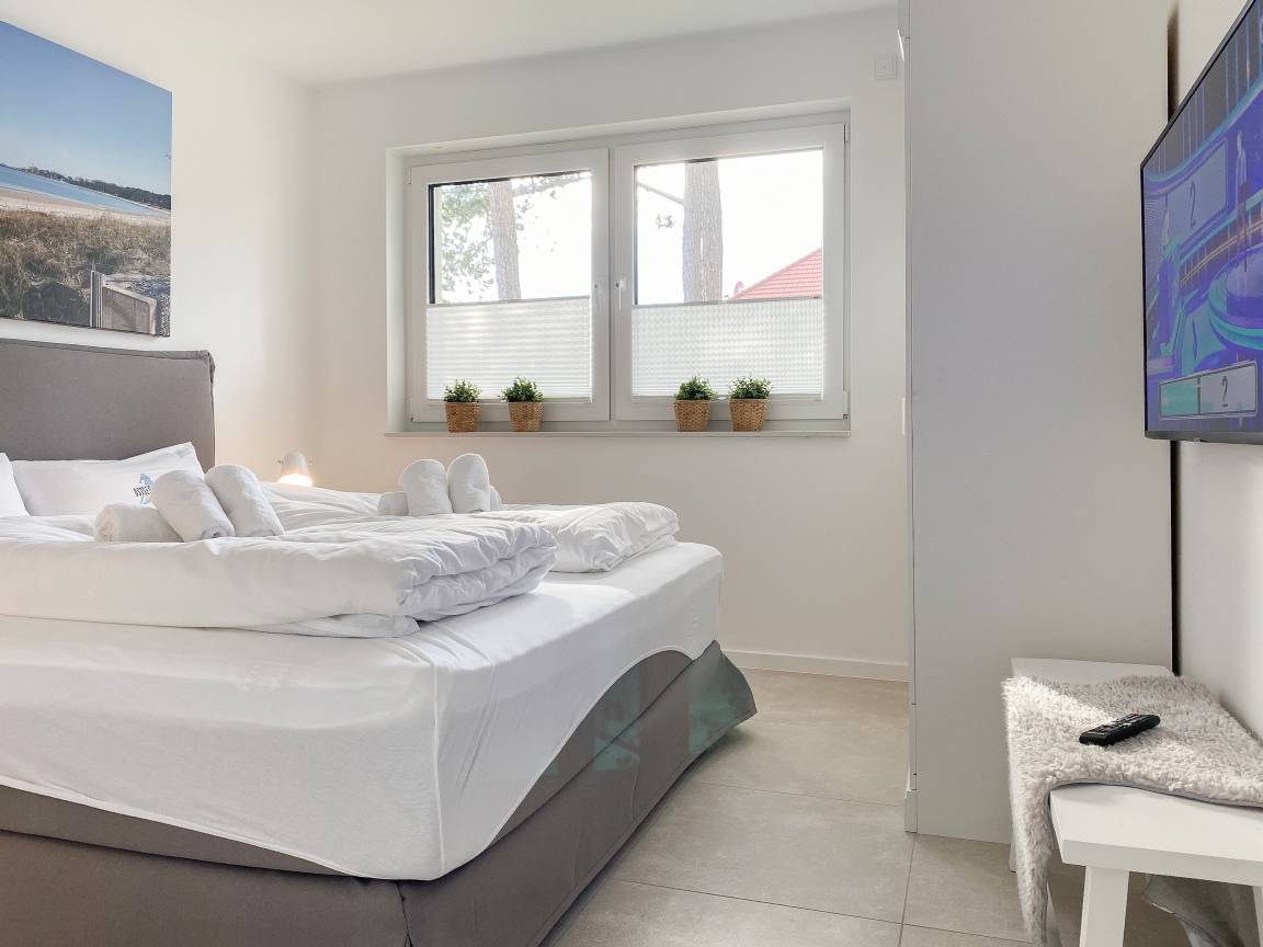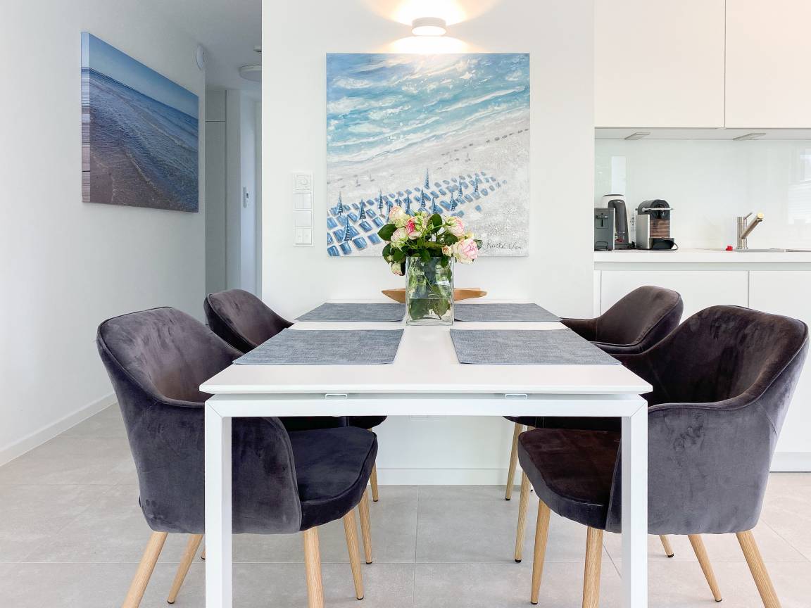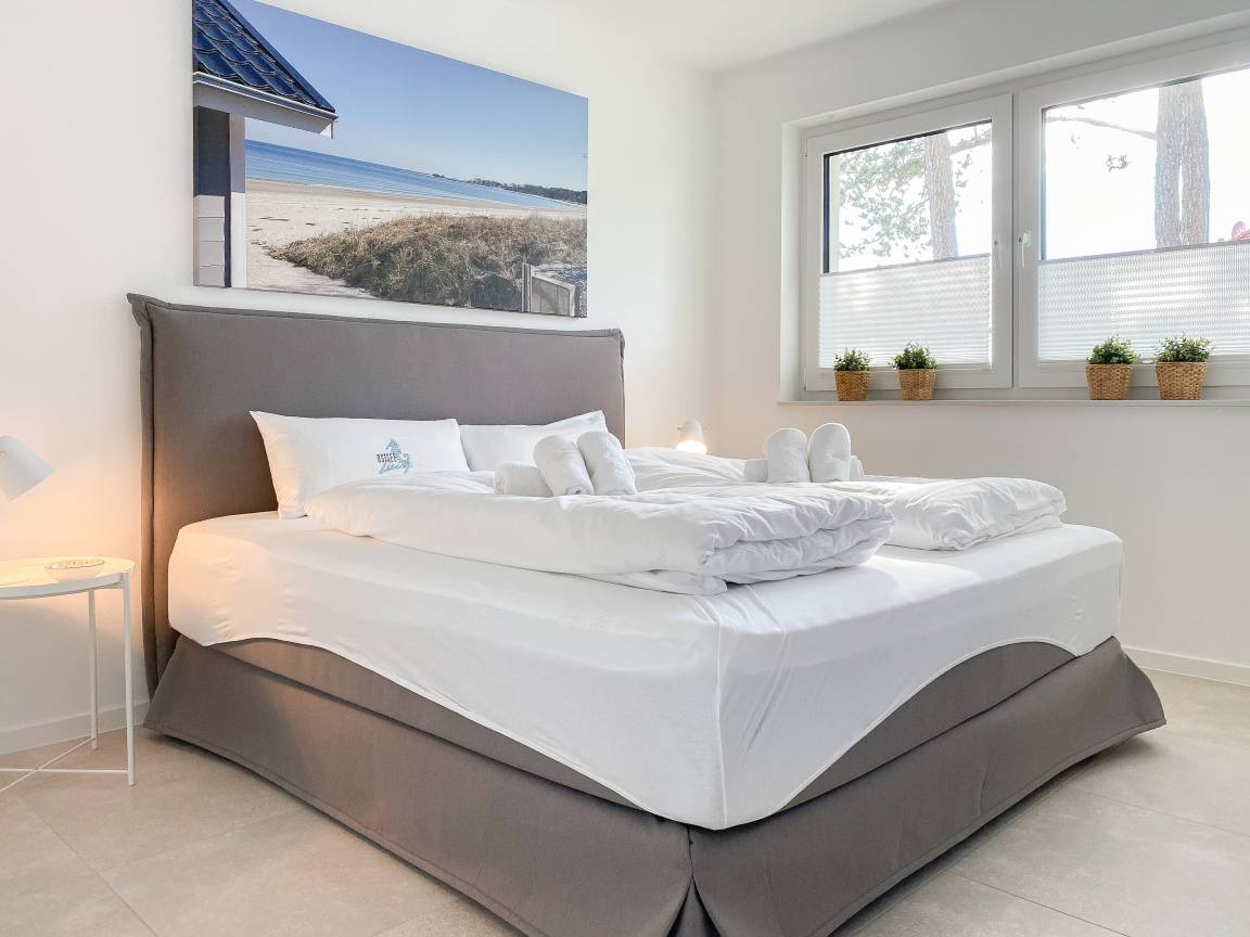 Die Ferienwohnung Wohnen am Strand 9 befindet sich im zweiten Obergeschoss und bietet mit 2 Schlafzimmern, ausgestattet mit Boxspringbetten (180x200 und 160x200)[nbsp][nbsp]und TV sowie 2 Duschbädern, [nbsp]jeglichen Komfort für 4 Personen, um einen entspannten Urlaub zu verleben. Der hochwertig eingerichtete Wohn- Essbereich bietet einen herrlichen Ausblick bis auf die Ostsee. Entspannen Sie auf Ihrem Balkon mit Teilmeerblick, Brandungsrauschen und frische Ostseeluft inklusive. Es stehen insgesamt 3 TV, Radio und WLAN zur Verfügung. Die Wohnung ist mit Fußbodenheizung ausgestattet und alle Fenster sind mit elektrischen Außenjalousien versehen, die gleichermaßen für Verdunkelung oder Tageslicht mit Privatsphäre sorgen. Zur Wohnung gehört ein fester Tiefgaragenstellplatz (Einfahrtshöhe 1,90 m). Das Haus verfügt über einen Fahrstuhl und einen Fahrradkeller. Waschmaschine und Trockner stehen kostenlos zur gemeinschaftlichen Nutzung[nbsp] zur Verfügung.