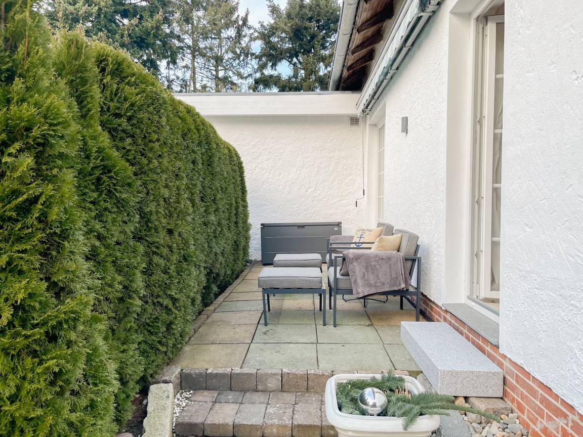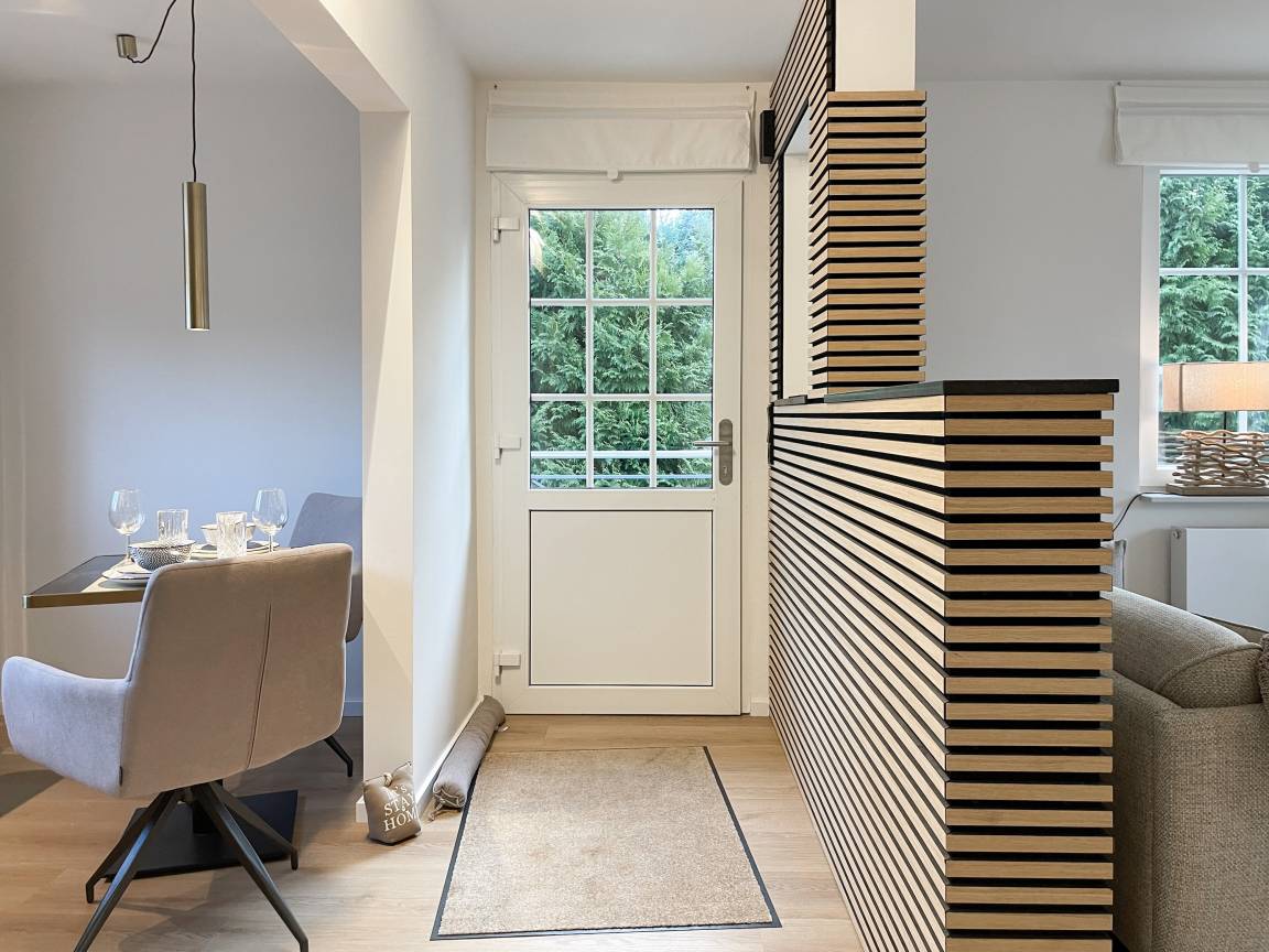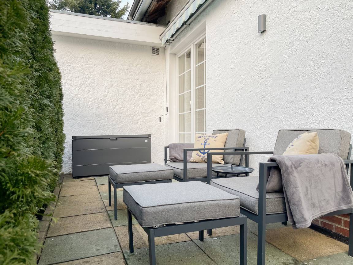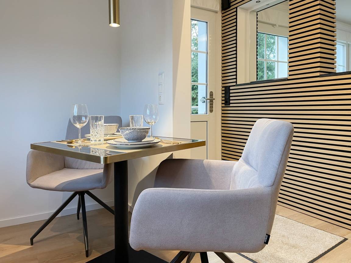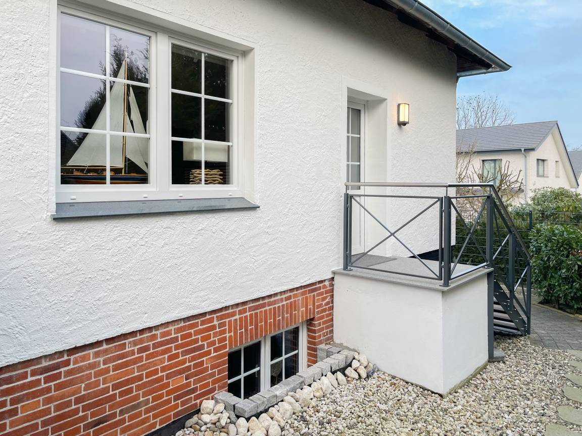 Frisch und aufwendig renoviert in 2024, erwartet Sie eine hochwertige und mit vielen liebevollen Details eingerichtete Ferienwohnung, die im Hochpaterre liegt und über einen eigenen, privaten Eingang verfügt. Ein Highlight ist die großzügige, begrünte und uneinsehbare Terrasse, für viele entspannte Stunden mit Sonnenschein vom Nachmittag bis zum Sonnenuntergang. Der stilvolle Wohnbereich mit Terrassenzugang ist lichtdurchflutet und mit einem bequemen Sofa zum Relaxen sowie einem Smart-TV ausgestattet. WLAN steht selbstverständlich zur Verfügung. Die offene Wohnküche in perfekter Ausstattung verfügt unter anderem über Spülmaschine, Backofen mit integrierter Mikrowelle, Induktionskochfeld, Kühlschrank und Gefrierfach. Der integrierte Essbereich ist sehr gemütlich gestaltet. Das großzügig angelegte Schlafzimmer ist mit einem Boxspringbett (180x200), Kleiderschrank für die Urlaubsgarderobe und einem Schreibtisch eingerichtet. Die bodentiefen Terrassenfenster lassen sich mit Vorhängen verdunkeln. Im modernen Bad sorgen zwei Fenster für reichlich Tageslicht. Die hochwertige Ausstattung umfasst eine Walk-In Dusche, Waschtisch, Spiegel mit indirekter Beleuchtung, Handtuchtrockner und WC.
