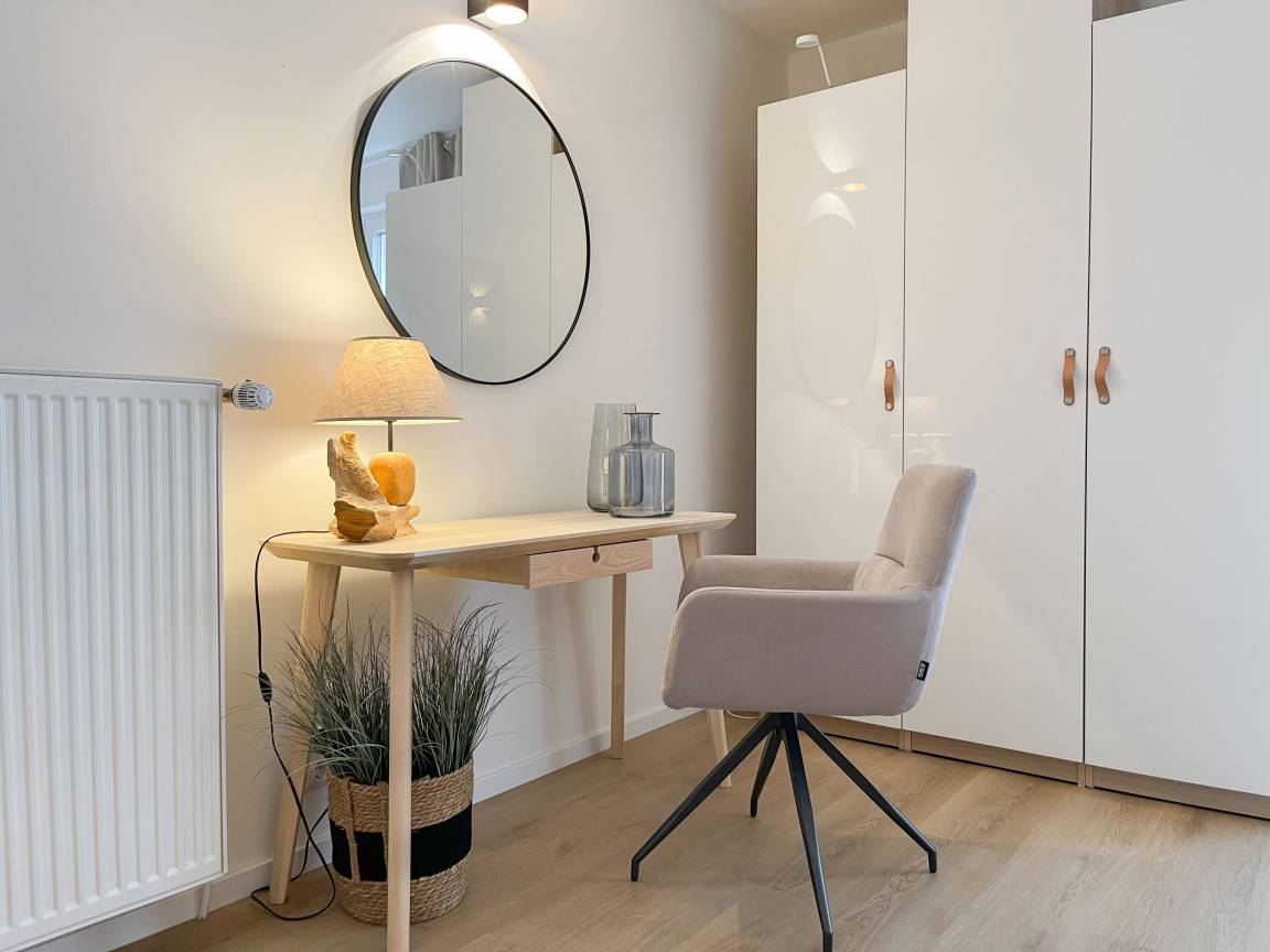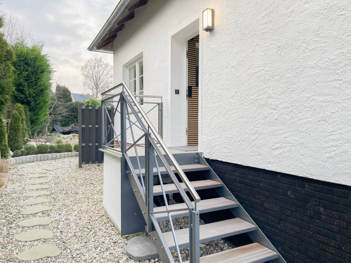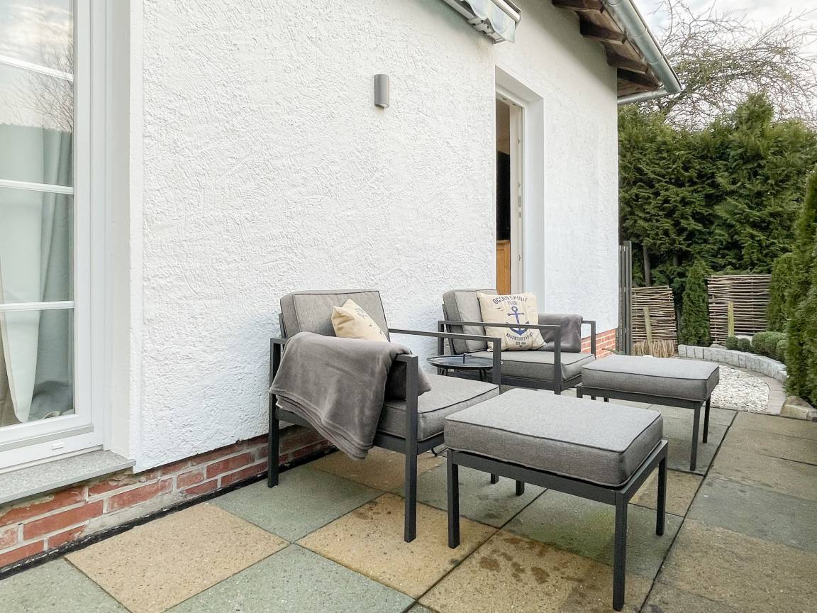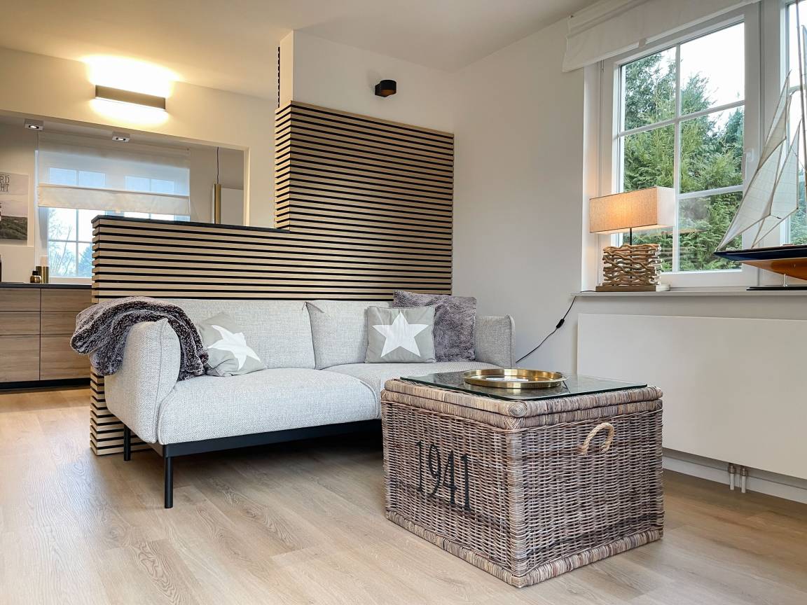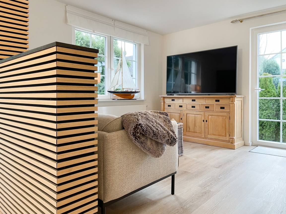 Frisch und aufwendig renoviert in 2024, erwartet Sie eine hochwertige und mit vielen liebevollen Details eingerichtete Ferienwohnung, die im Hochpaterre liegt und über einen eigenen, privaten Eingang verfügt. Ein Highlight ist die großzügige, begrünte und uneinsehbare Terrasse, für viele entspannte Stunden mit Sonnenschein vom Nachmittag bis zum Sonnenuntergang. Der stilvolle Wohnbereich mit Terrassenzugang ist lichtdurchflutet und mit einem bequemen Sofa zum Relaxen sowie einem Smart-TV ausgestattet. WLAN steht selbstverständlich zur Verfügung. Die offene Wohnküche in perfekter Ausstattung verfügt unter anderem über Spülmaschine, Backofen mit integrierter Mikrowelle, Induktionskochfeld, Kühlschrank und Gefrierfach. Der integrierte Essbereich ist sehr gemütlich gestaltet. Das großzügig angelegte Schlafzimmer ist mit einem Boxspringbett (180x200), Kleiderschrank für die Urlaubsgarderobe und einem Schreibtisch eingerichtet. Die bodentiefen Terrassenfenster lassen sich mit Vorhängen verdunkeln. Im modernen Bad sorgen zwei Fenster für reichlich Tageslicht. Die hochwertige Ausstattung umfasst eine Walk-In Dusche, Waschtisch, Spiegel mit indirekter Beleuchtung, Handtuchtrockner und WC.