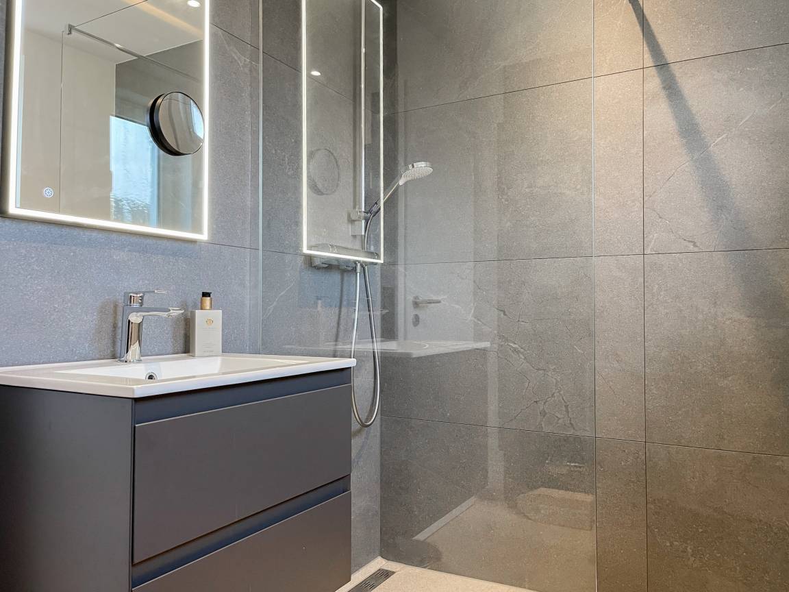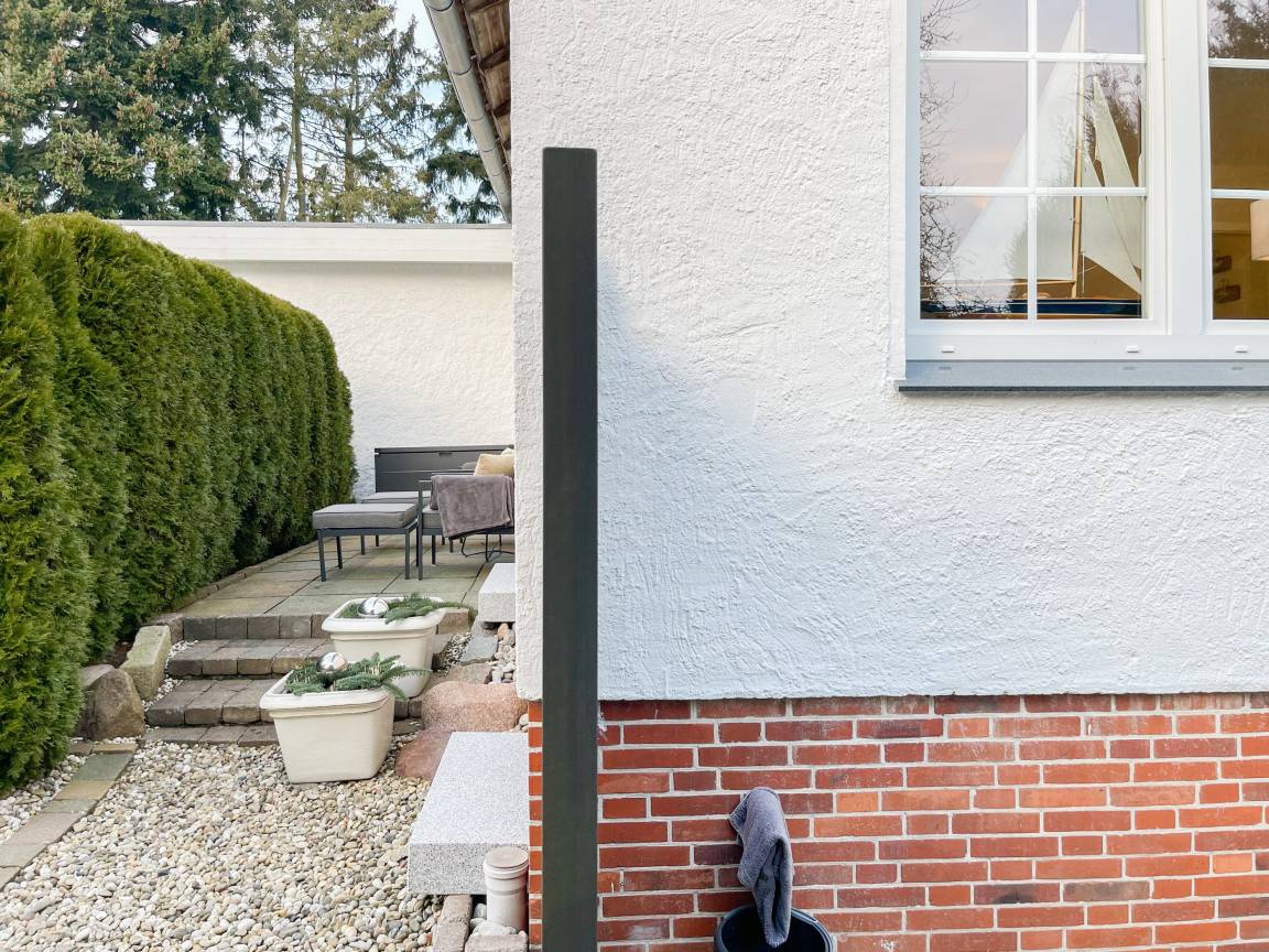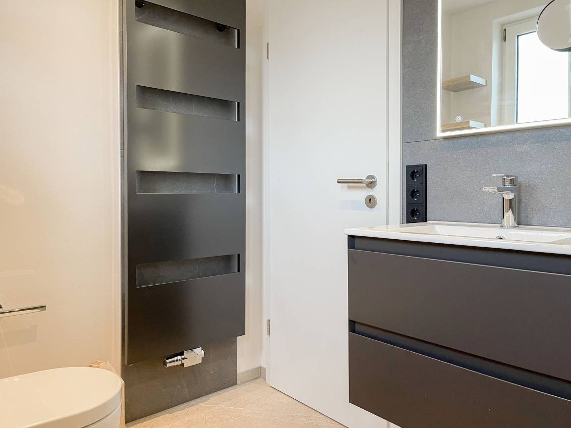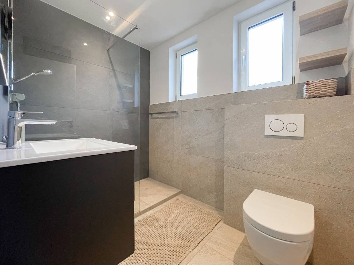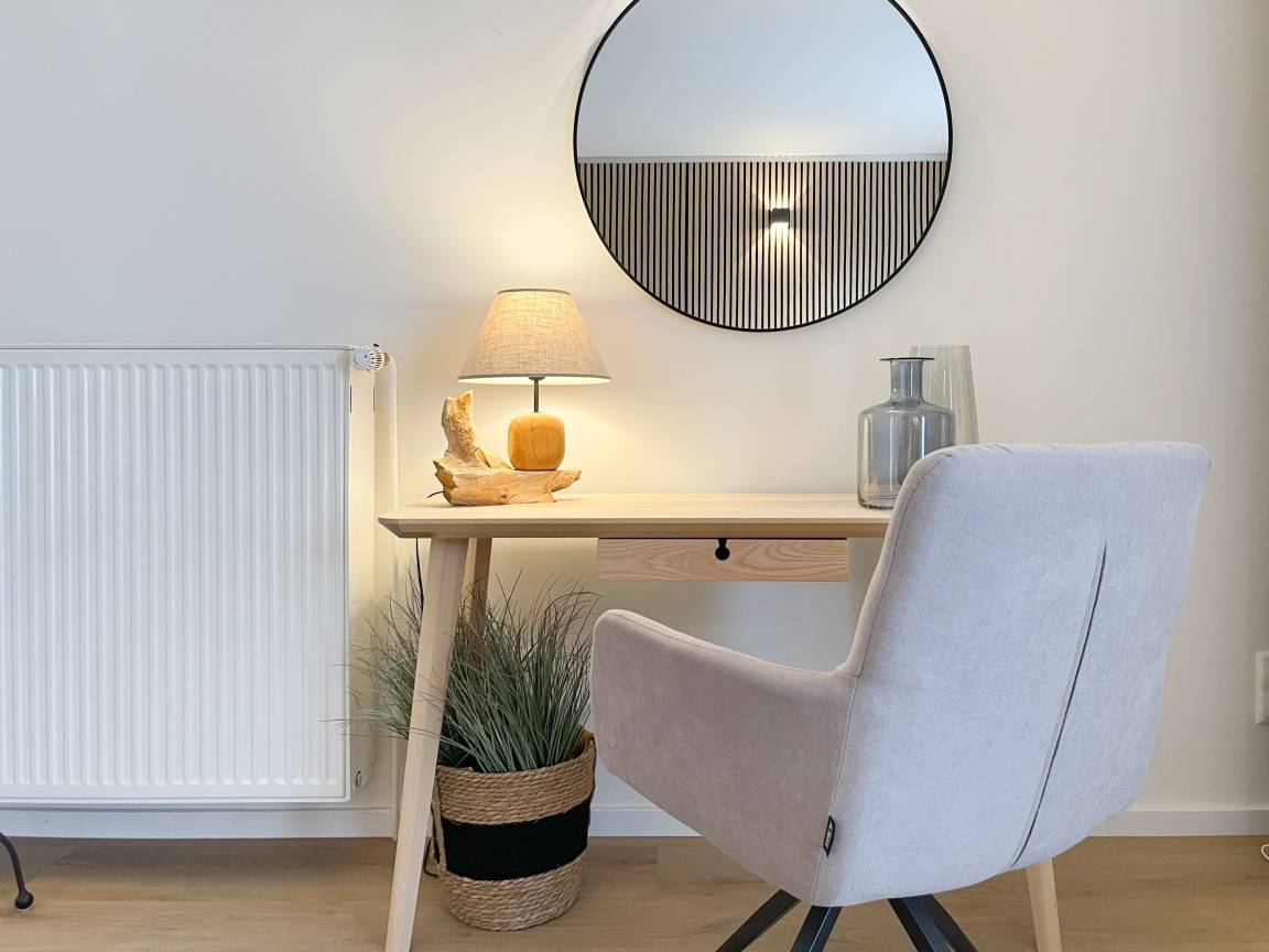 Frisch und aufwendig renoviert in 2024, erwartet Sie eine hochwertige und mit vielen liebevollen Details eingerichtete Ferienwohnung, die im Hochpaterre liegt und über einen eigenen, privaten Eingang verfügt. Ein Highlight ist die großzügige, begrünte und uneinsehbare Terrasse, für viele entspannte Stunden mit Sonnenschein vom Nachmittag bis zum Sonnenuntergang. Der stilvolle Wohnbereich mit Terrassenzugang ist lichtdurchflutet und mit einem bequemen Sofa zum Relaxen sowie einem Smart-TV ausgestattet. WLAN steht selbstverständlich zur Verfügung. Die offene Wohnküche in perfekter Ausstattung verfügt unter anderem über Spülmaschine, Backofen mit integrierter Mikrowelle, Induktionskochfeld, Kühlschrank und Gefrierfach. Der integrierte Essbereich ist sehr gemütlich gestaltet. Das großzügig angelegte Schlafzimmer ist mit einem Boxspringbett (180x200), Kleiderschrank für die Urlaubsgarderobe und einem Schreibtisch eingerichtet. Die bodentiefen Terrassenfenster lassen sich mit Vorhängen verdunkeln. Im modernen Bad sorgen zwei Fenster für reichlich Tageslicht. Die hochwertige Ausstattung umfasst eine Walk-In Dusche, Waschtisch, Spiegel mit indirekter Beleuchtung, Handtuchtrockner und WC.