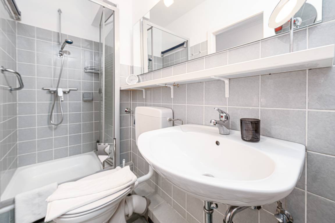 Für die nötige Erfrischung sorgt das Badezimmer mit Dusche. Zum Lüften ist hier auch ein Fenster vorhanden.