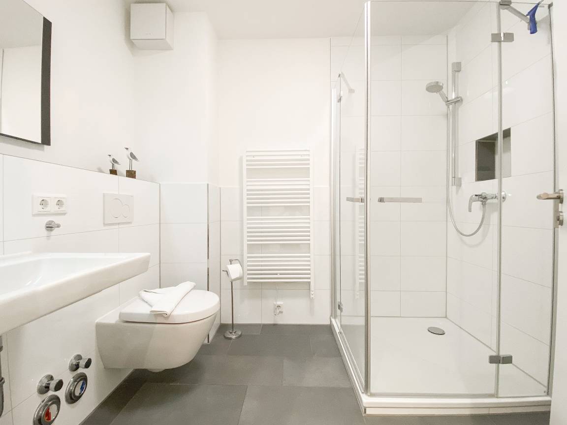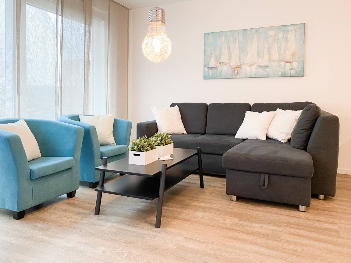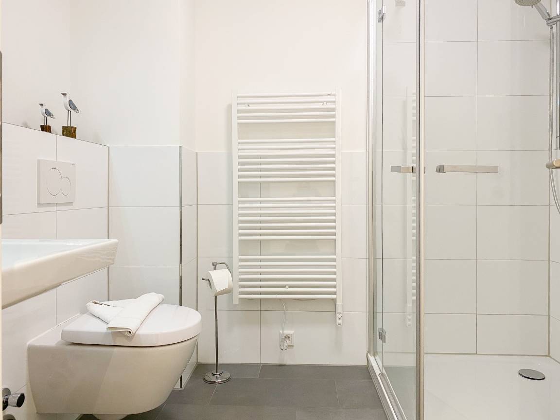 Die Ferienwohnung "Lütte Krabbe" bietet ausreichend Platz für 2-3 Personen. Große, bodentiefe Fensterelemente sorgen für einen hellen, freundlichen Wohnbereich, der mit einem Sofa mit Schlaffunktion, zwei Sesseln und TV ausgestattet ist. Auf der Sonnenterrasse in Südausrichtung, die sich über die gesamte Breite der Wohnung erstreckt, lässt es sich mit reichlich Sonnenschein vom Frühstück bis zum Abend herrlich entspannen. Die offene Küche mit integriertem Essbereich verfügt über alle technischen Geräte wie Backofen, Ceranfeld und Geschirrspüler sowie alle notwendigen Küchenutensilien. Das separate Schlafzimmer ist mit einem Doppelbett (180x200) und ausgestattet verfügt ebenfalls über einen Terrassenzugang.[nbsp] Alle Räume sind mit elektrischen Außenjalousien versehen und lassen sich vollständig verdunkeln. Das moderne Duschbad verfügt über Fußbodenheizung und einen Handtuchwärmer. WLAN steht selbstverständlich zur kostenlosen Nutzung zur Verfügung.