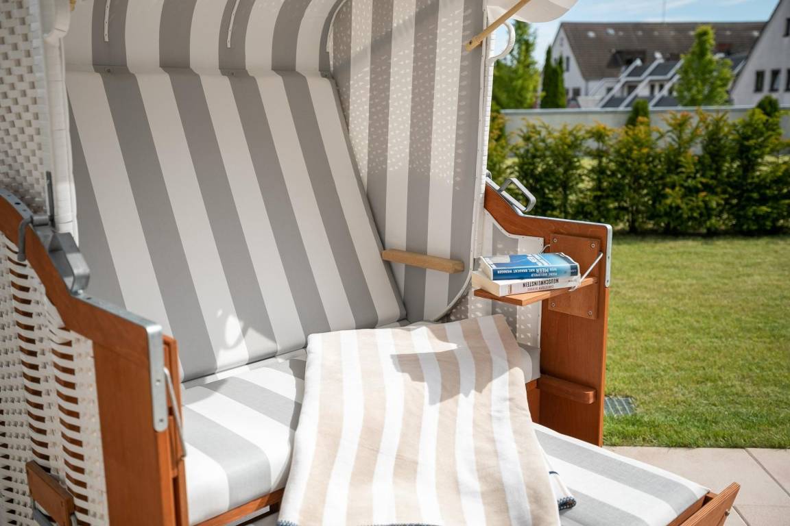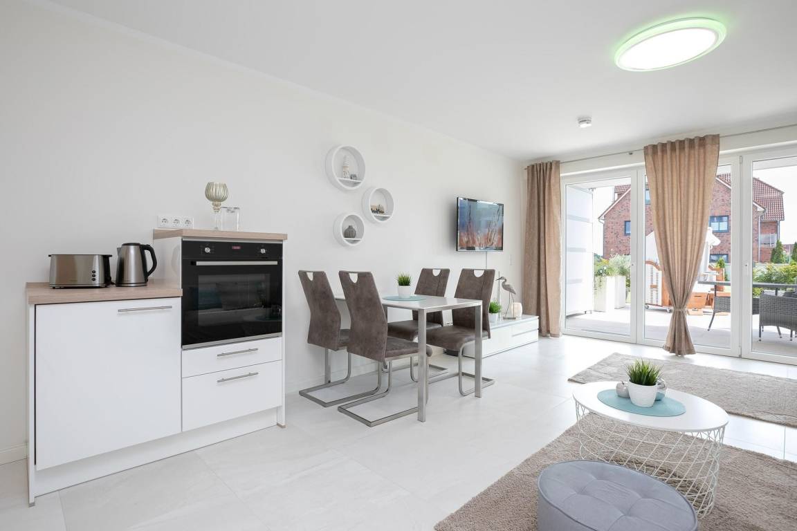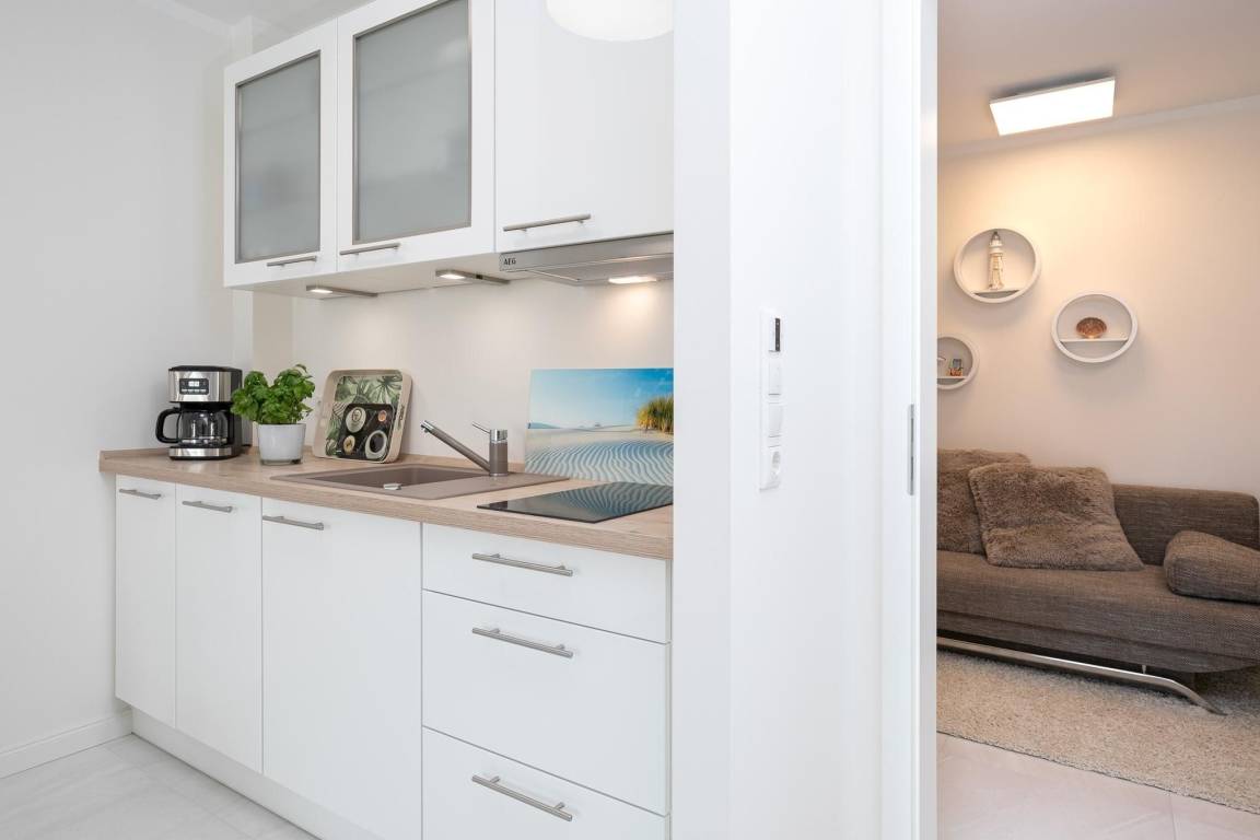 Der offen gestaltete Wohnraum geht harmonisch ineinander über. Hier erwartet Sie ein geschmackvoll eingerichteter Wohnbereich mit komfortabler Couchgarnitur und Flatscreen-TV. Angrenzend befindet sich ein kleiner Essbereich mit offener und voll ausgestatteter Küche, die modern und unter anderem mit 2-Platten-Induktionskochfeld, praktischer Spülmaschine und Kühlschrank ausgestattet ist. Für einwandfreien Schlafkomfort sorgt das Schrankbett (160x200 cm), welches sich mit wenigen Handgriffen zum platzsparenden Schrank oder komfortablem Bett umbauen lässt. Die 3. Schlafmöglichkeit ist mit einem Schlafsofa (150x190 cm) raffiniert im Flur untergebraucht, so bietet dieses 1 Zimmer-Appartement Privatsphäre für jeden. Verdunkelnde Außenrollläden gehören hier zur Grundausstattung. Die angrenzende teilüberdachte Terrasse mit Strandkorb lädt Sie ein, den Tag bei einem kühlen Getränk in Ruhe Revue passieren zu lassen. Gern dürfen Sie den Garten mitbenutzen. Abgerundet wird dieses schöne Feriendomizil mit einem Badezimmer mit bodentiefer Dusche, Handtuchheizung und Fön. Für warme Füße sorgt die komfortable Fußbodenheizung. Freuen Sie sich auf einen entspannten Urlaub an der Ostsee.