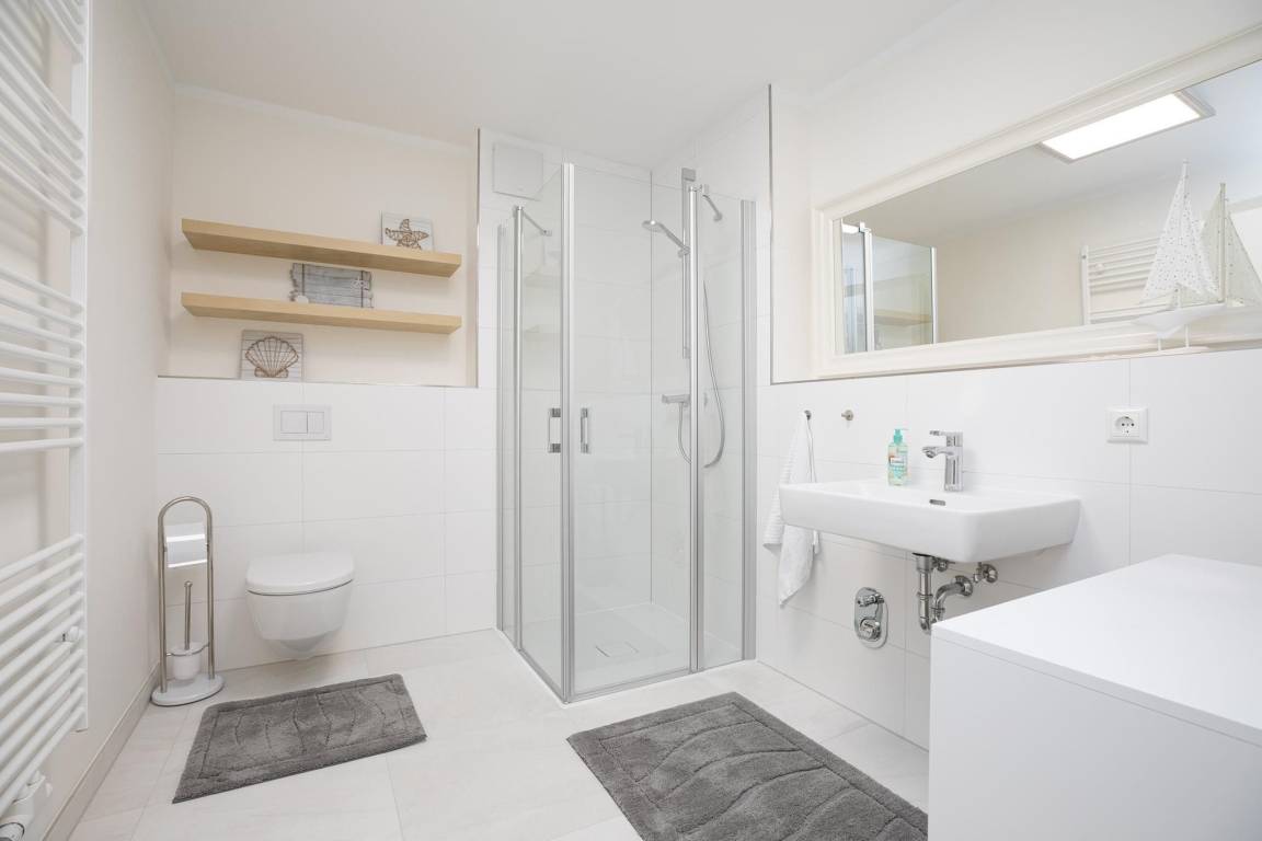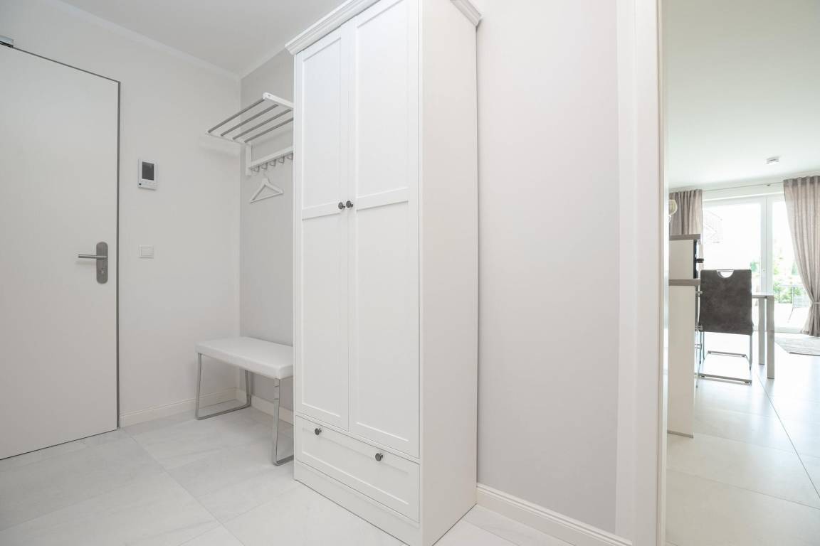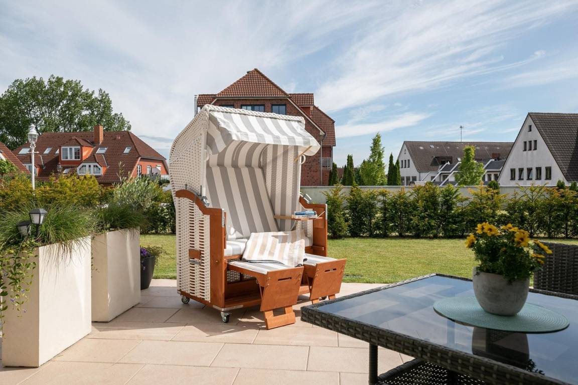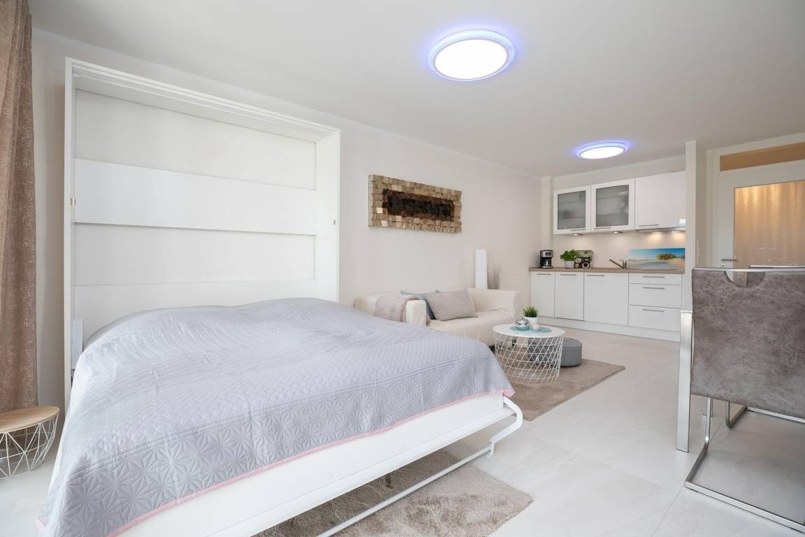 Der offen gestaltete Wohnraum geht harmonisch ineinander über. Hier erwartet Sie ein geschmackvoll eingerichteter Wohnbereich mit komfortabler Couchgarnitur und Flatscreen-TV. Angrenzend befindet sich ein kleiner Essbereich mit offener und voll ausgestatteter Küche, die modern und unter anderem mit 2-Platten-Induktionskochfeld, praktischer Spülmaschine und Kühlschrank ausgestattet ist. Für einwandfreien Schlafkomfort sorgt das Schrankbett (160x200 cm), welches sich mit wenigen Handgriffen zum platzsparenden Schrank oder komfortablem Bett umbauen lässt. Die 3. Schlafmöglichkeit ist mit einem Schlafsofa (150x190 cm) raffiniert im Flur untergebraucht, so bietet dieses 1 Zimmer-Appartement Privatsphäre für jeden. Verdunkelnde Außenrollläden gehören hier zur Grundausstattung. Die angrenzende teilüberdachte Terrasse mit Strandkorb lädt Sie ein, den Tag bei einem kühlen Getränk in Ruhe Revue passieren zu lassen. Gern dürfen Sie den Garten mitbenutzen. Abgerundet wird dieses schöne Feriendomizil mit einem Badezimmer mit bodentiefer Dusche, Handtuchheizung und Fön. Für warme Füße sorgt die komfortable Fußbodenheizung. Freuen Sie sich auf einen entspannten Urlaub an der Ostsee.
