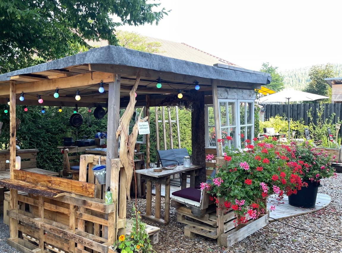 Eine rustikale Außenküche mit Schwenkgrill, Kochplatte und hippe, handgefertigte Upcycling-Möbel, sowie eine große, erhöhte Holzterasse mit hochwertiger Dining-Lounge mit gemütlichen Relax-Liegen, Sitzecke und großem Sonnenschirm.