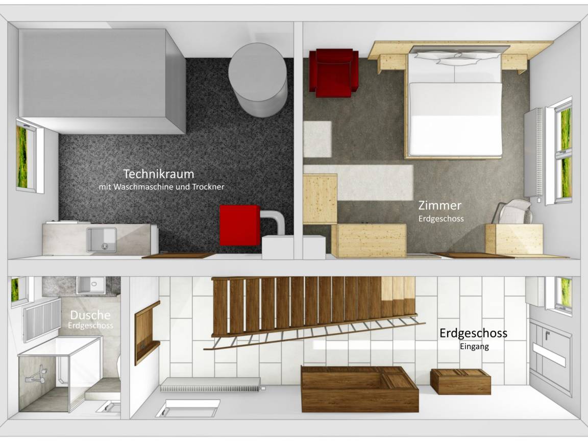 Layout : Parterre: Diele, Schlafzimmer mit Schlafcouch 1 Pers.(80 x 200 cm), Doppelbett(180 x 200 cm) , Badezimmer mit Dusche, Waschbecken, Toilette